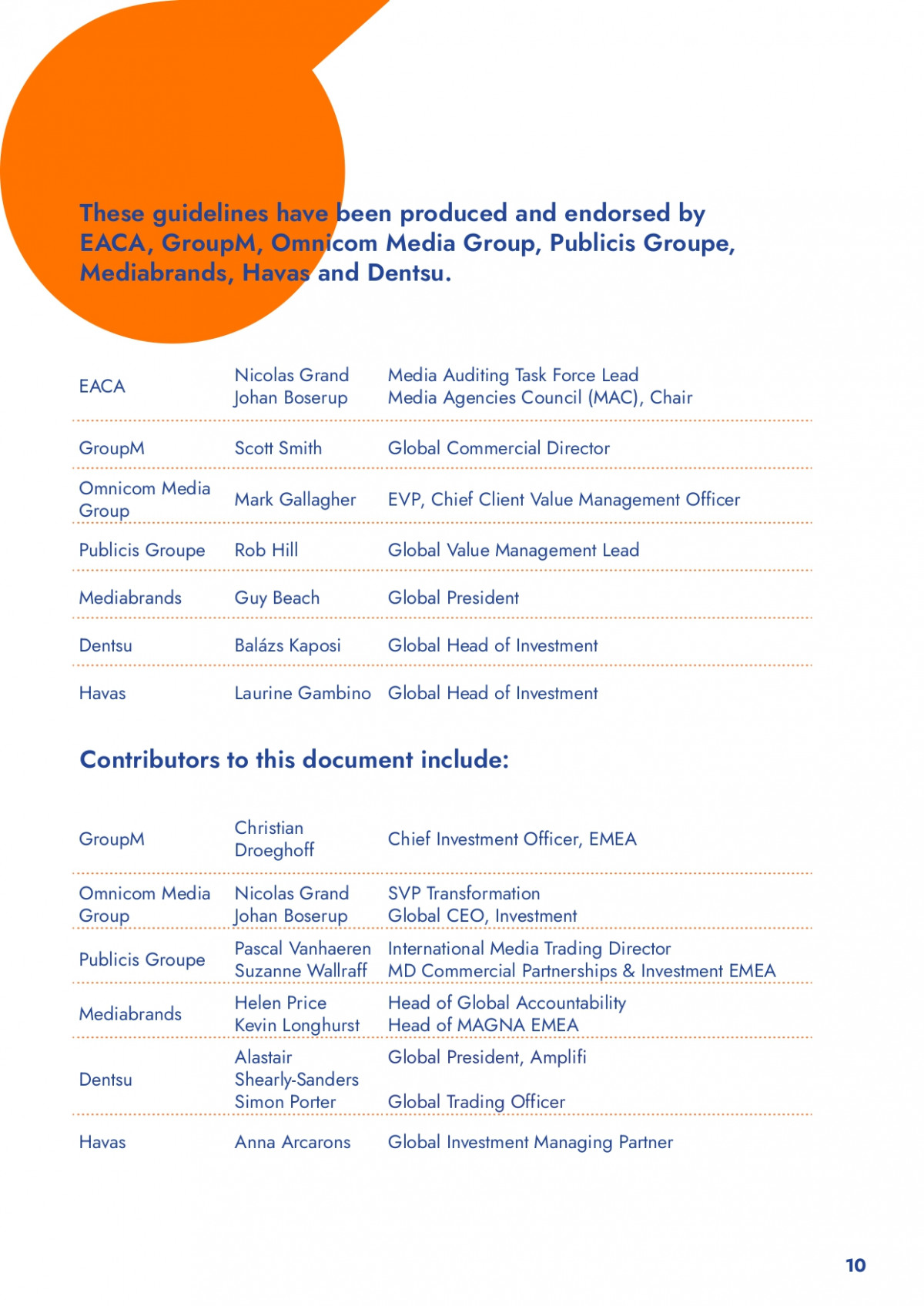 Documentul a fost elaborat de grupul de lucru pe acest subiect al EACA, grup ce a fost condus de Nicolas Grand, SVP Transformation al Omnicom Media Group. Din grupul de lucru au mai facut parte reprezentanti din toate grupurile de agentii de media.