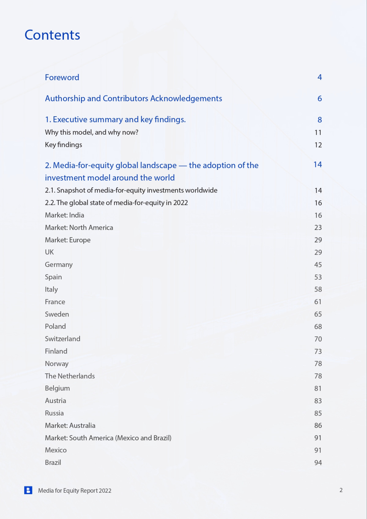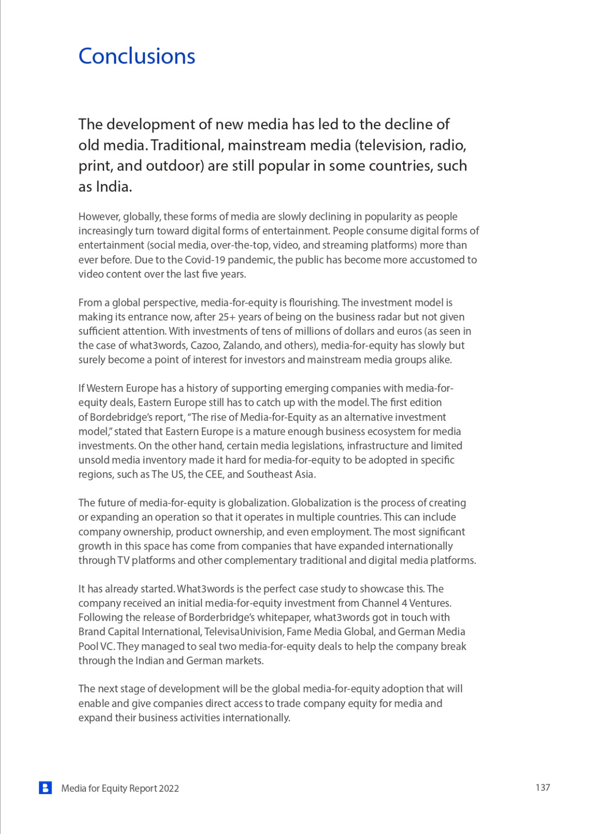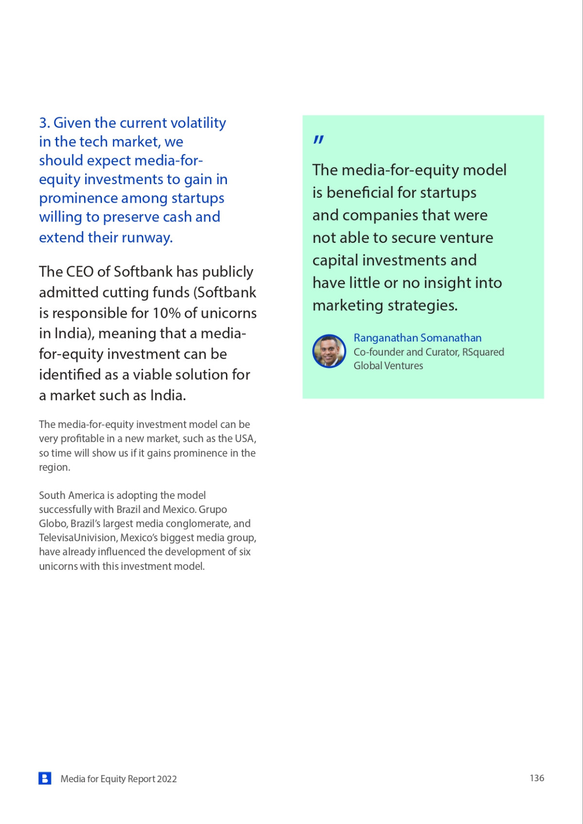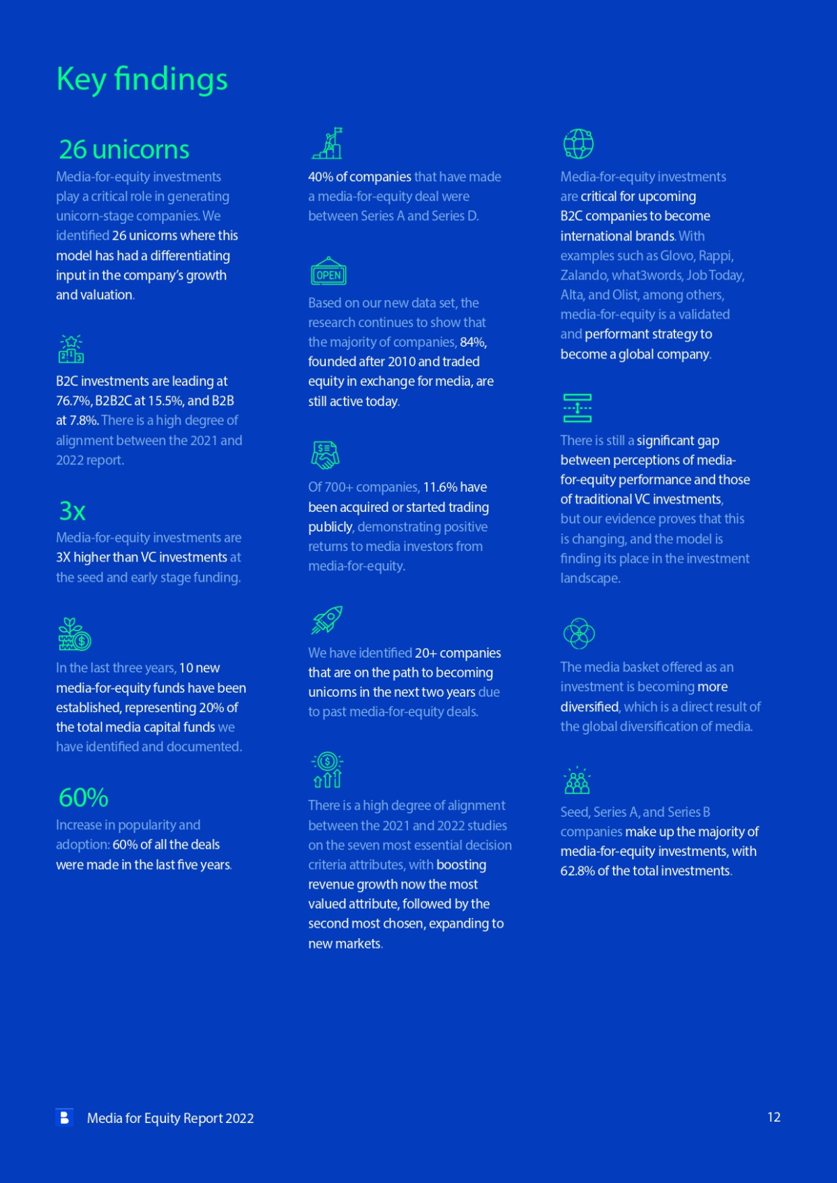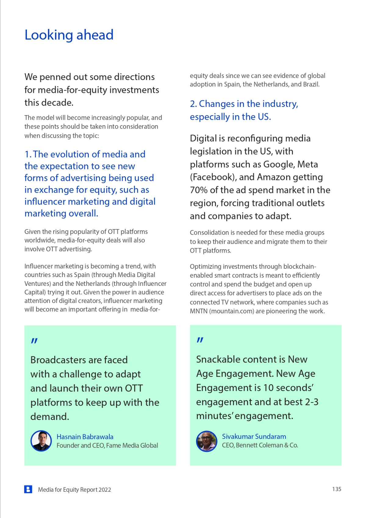 As part of our 2022 report conclusion, we anchored out some directions for media-for-equity investments for the years to come. The model will become increasingly popular, and with the evolution of the media industry, we expect to see new forms of advertising being used in exchange for equity, such as influencer marketing. Similarly, OTT platforms will give rise to media buying technologies, enabling upcoming companies to gain direct access to media buying, such as performance marketing.