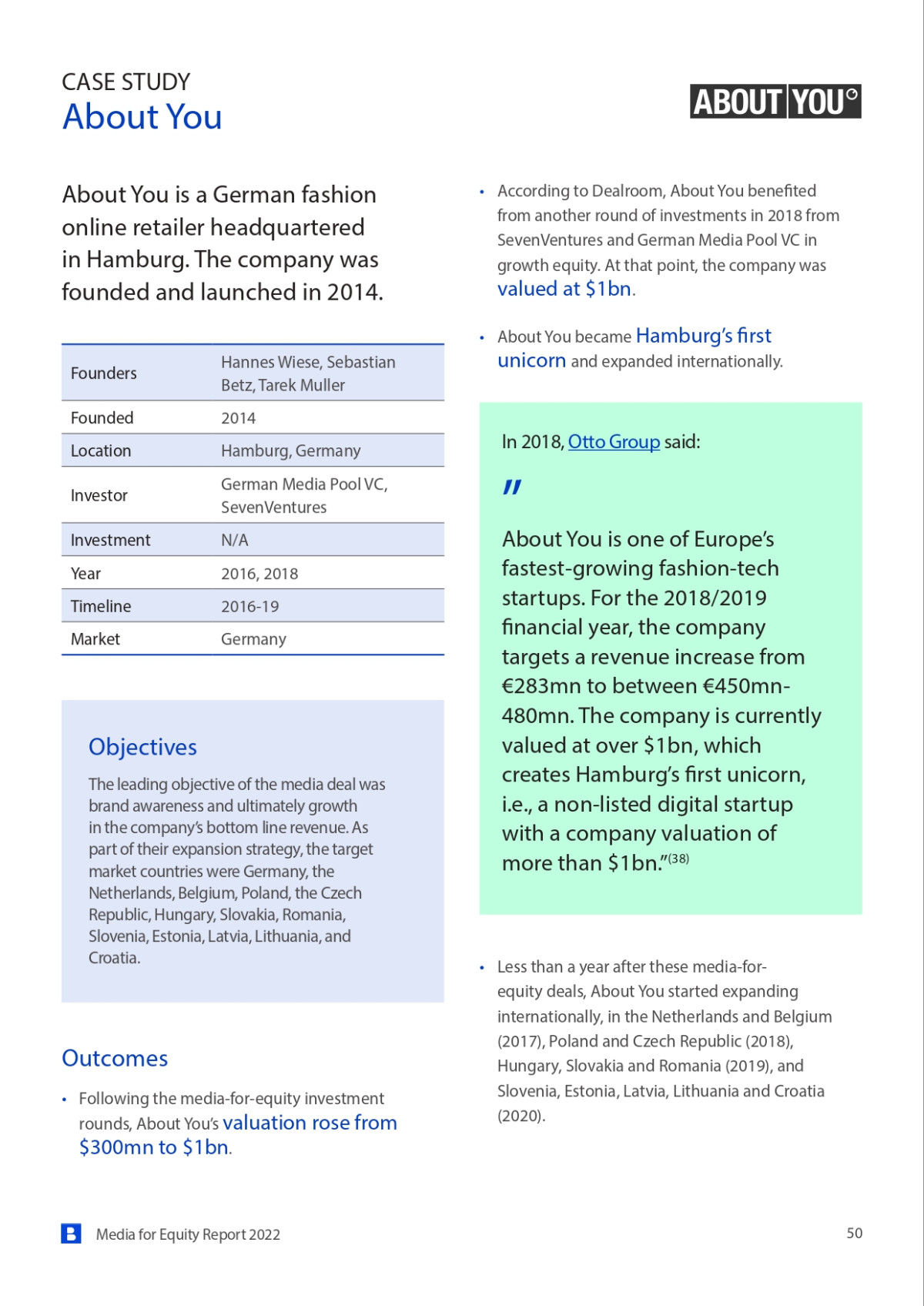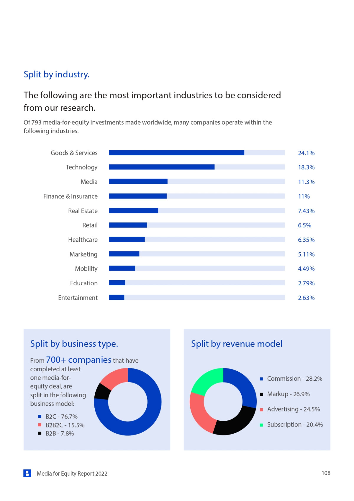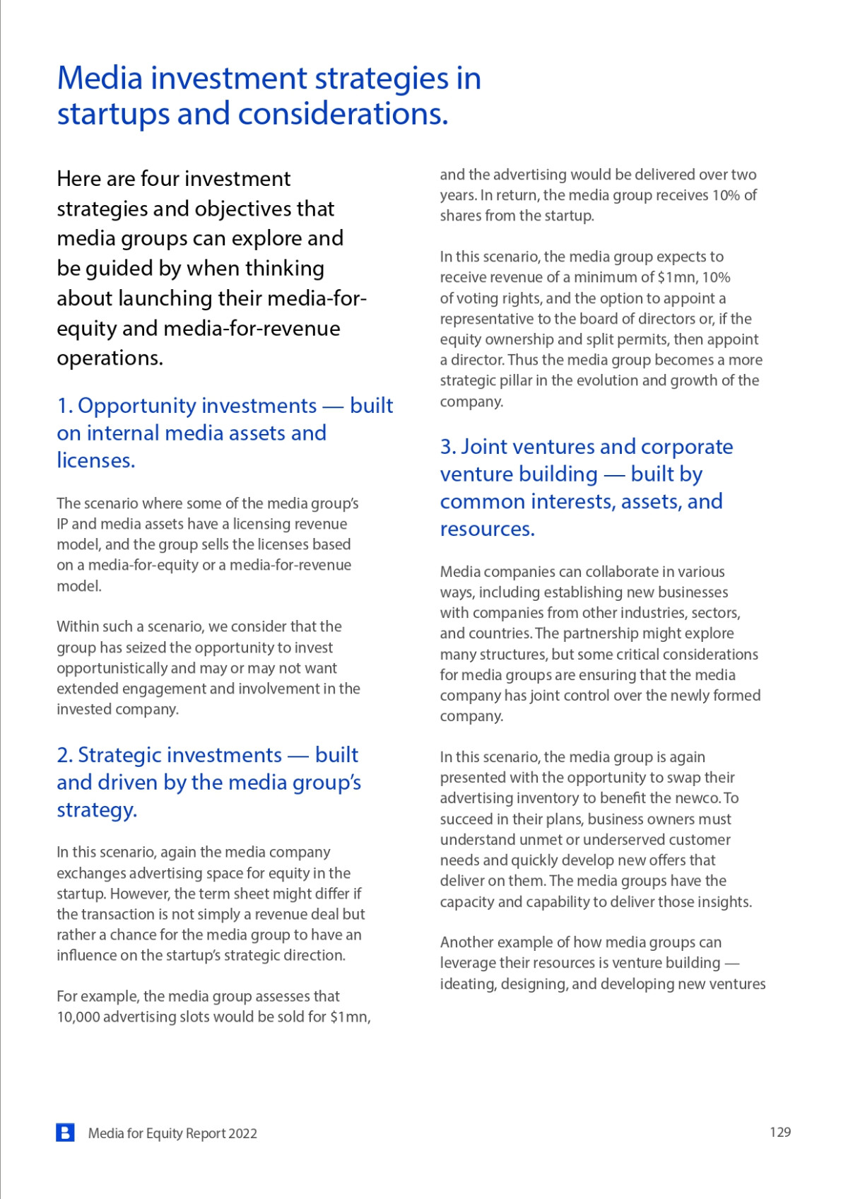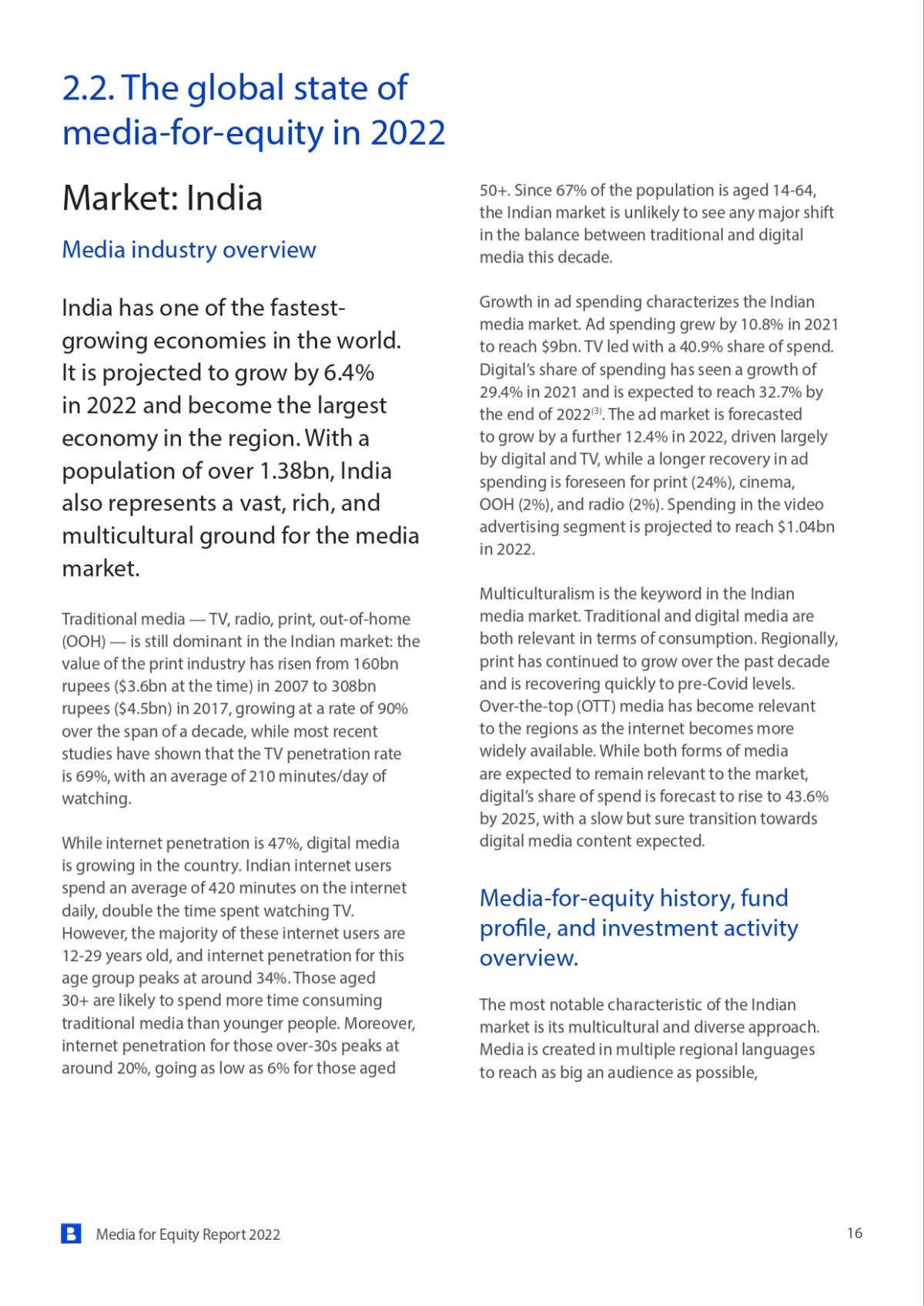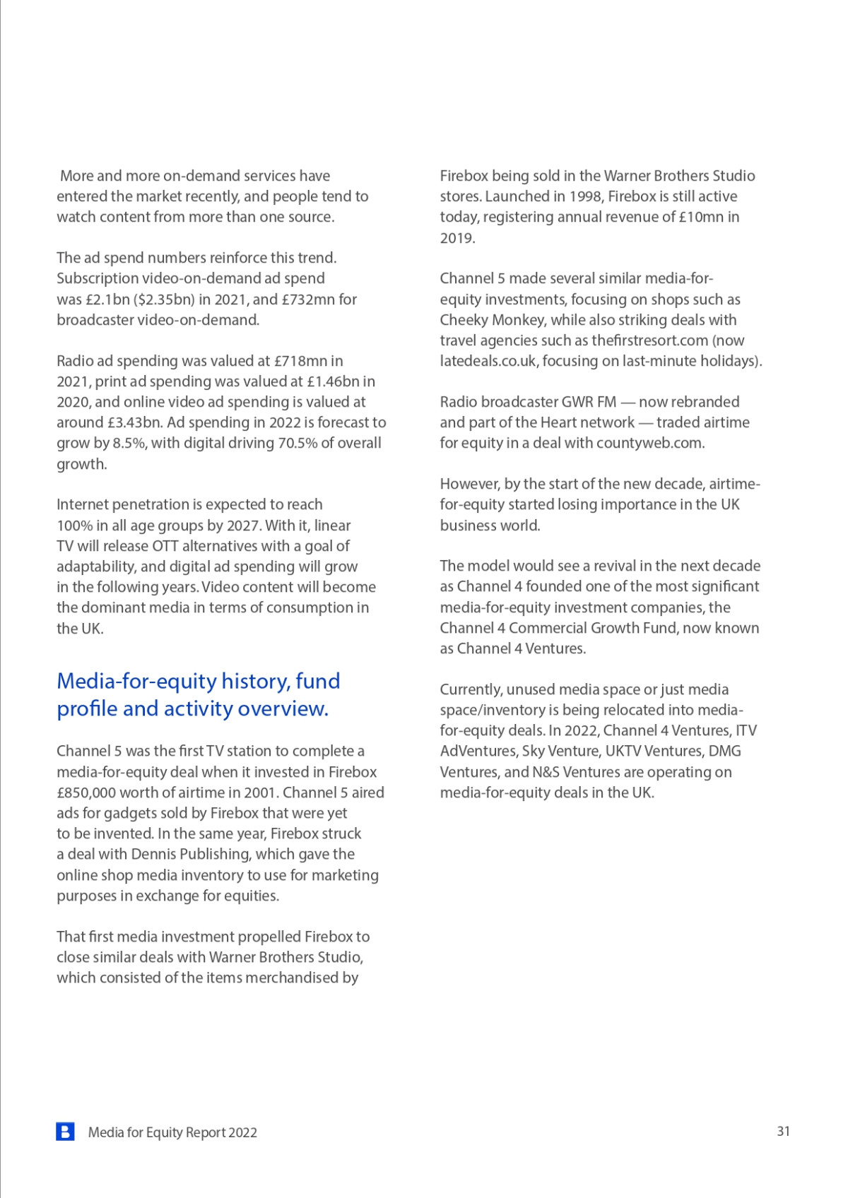 As part of our 2022 report conclusion, we anchored out some directions for media-for-equity investments for the years to come. The model will become increasingly popular, and with the evolution of the media industry, we expect to see new forms of advertising being used in exchange for equity, such as influencer marketing. Similarly, OTT platforms will give rise to media buying technologies, enabling upcoming companies to gain direct access to media buying, such as performance marketing.