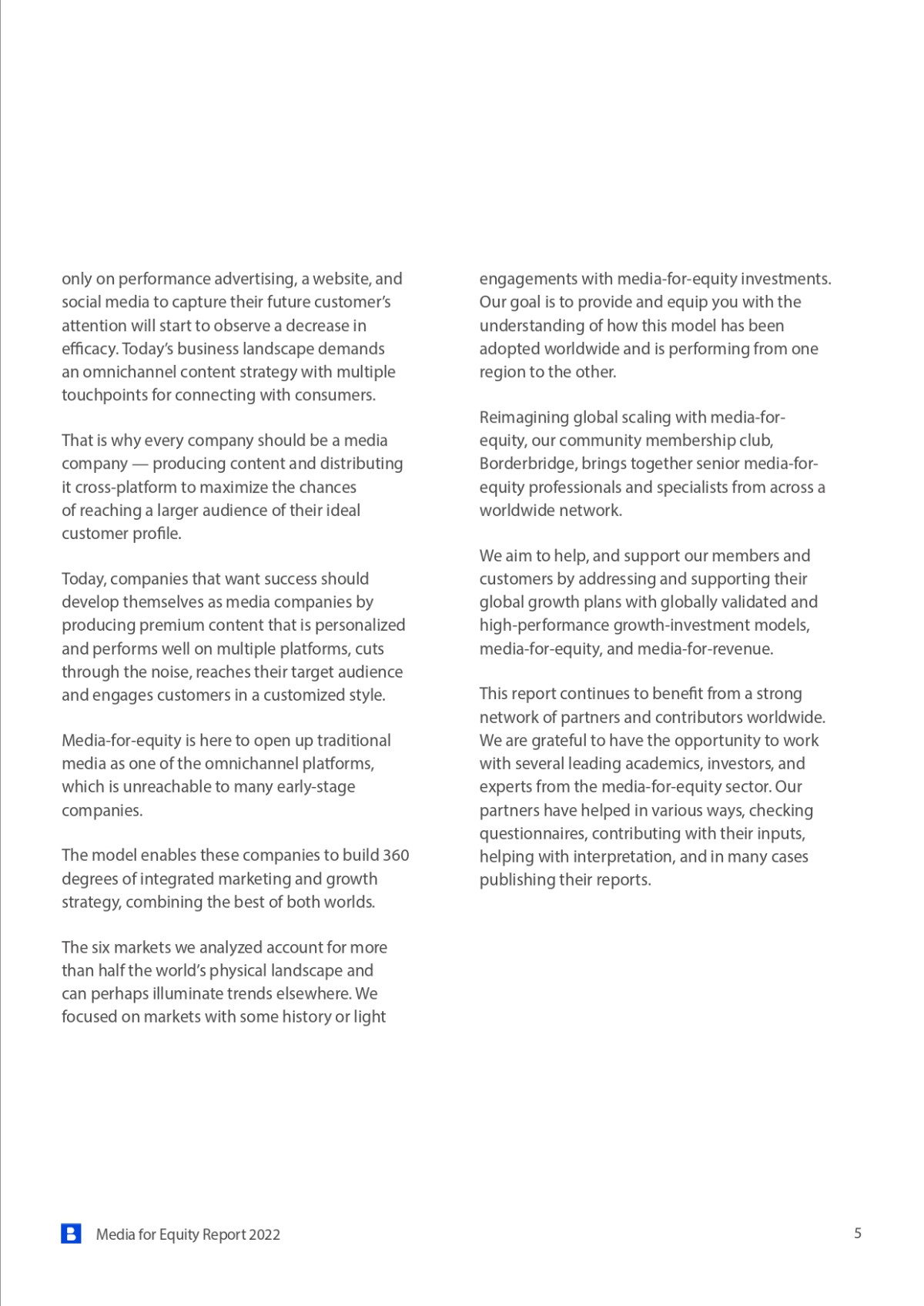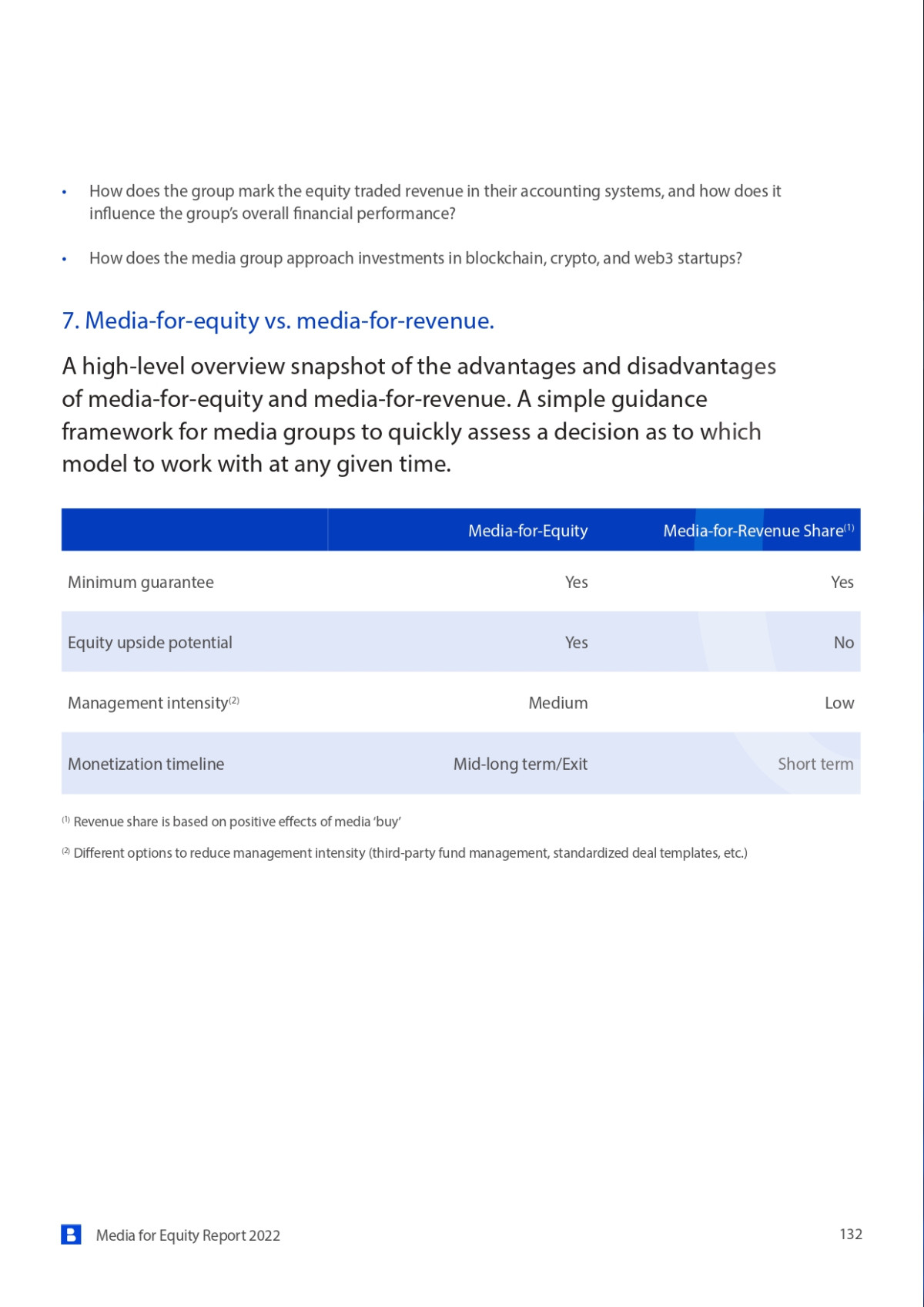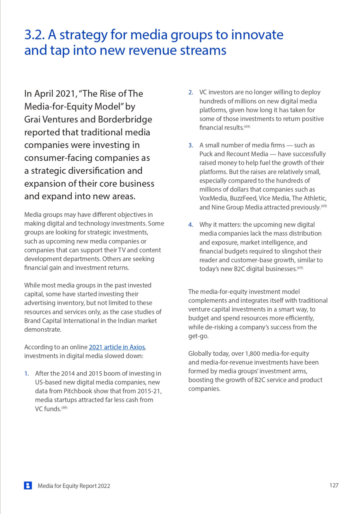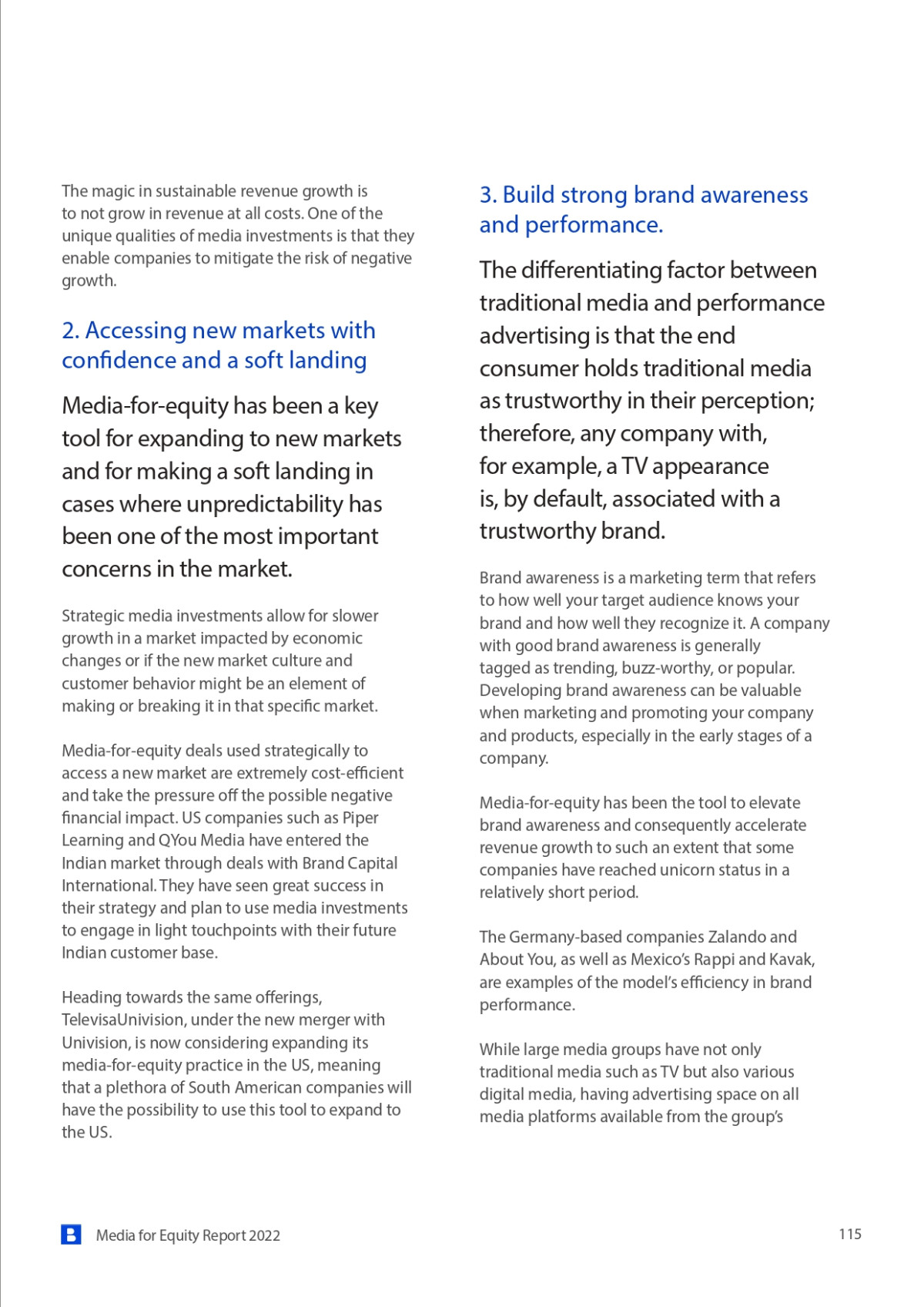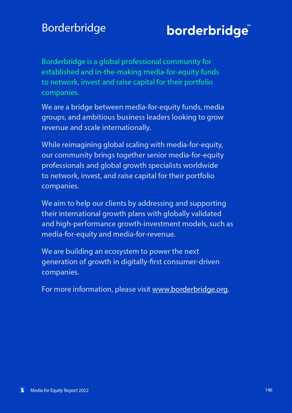 As part of our 2022 report conclusion, we anchored out some directions for media-for-equity investments for the years to come. The model will become increasingly popular, and with the evolution of the media industry, we expect to see new forms of advertising being used in exchange for equity, such as influencer marketing. Similarly, OTT platforms will give rise to media buying technologies, enabling upcoming companies to gain direct access to media buying, such as performance marketing.