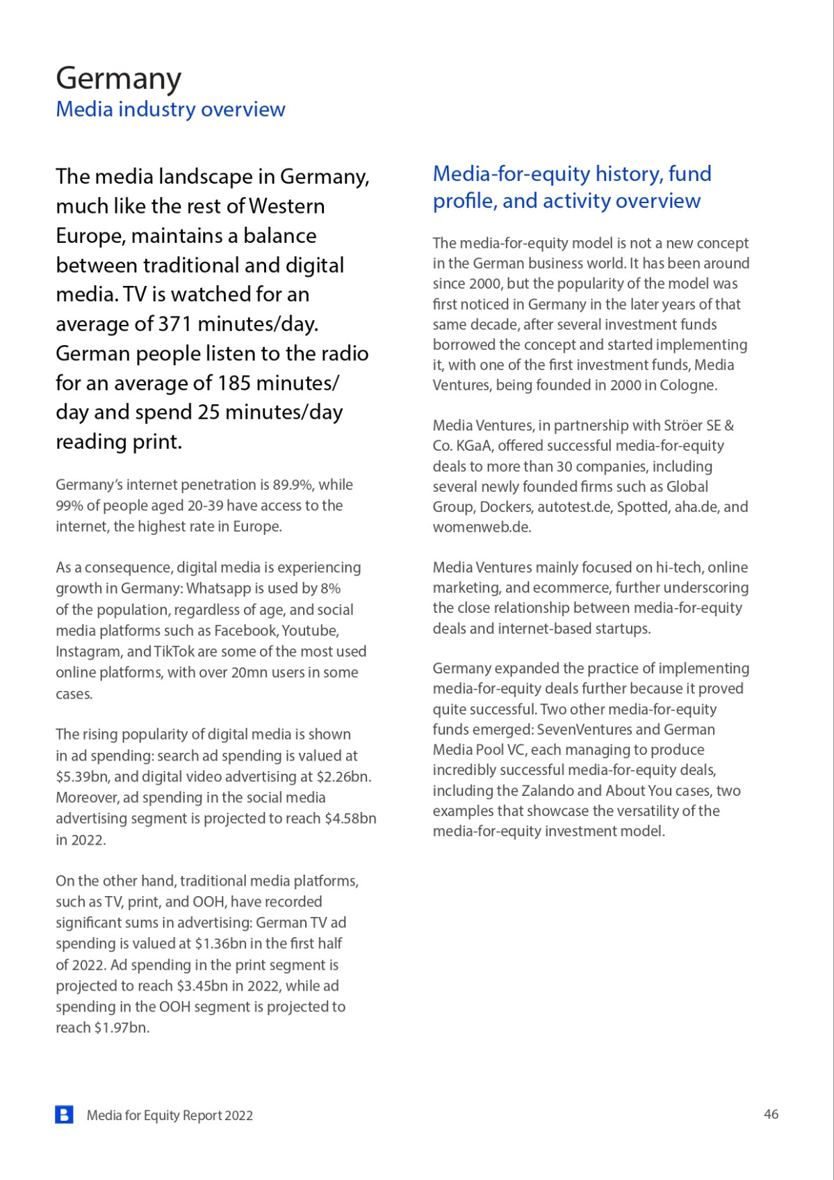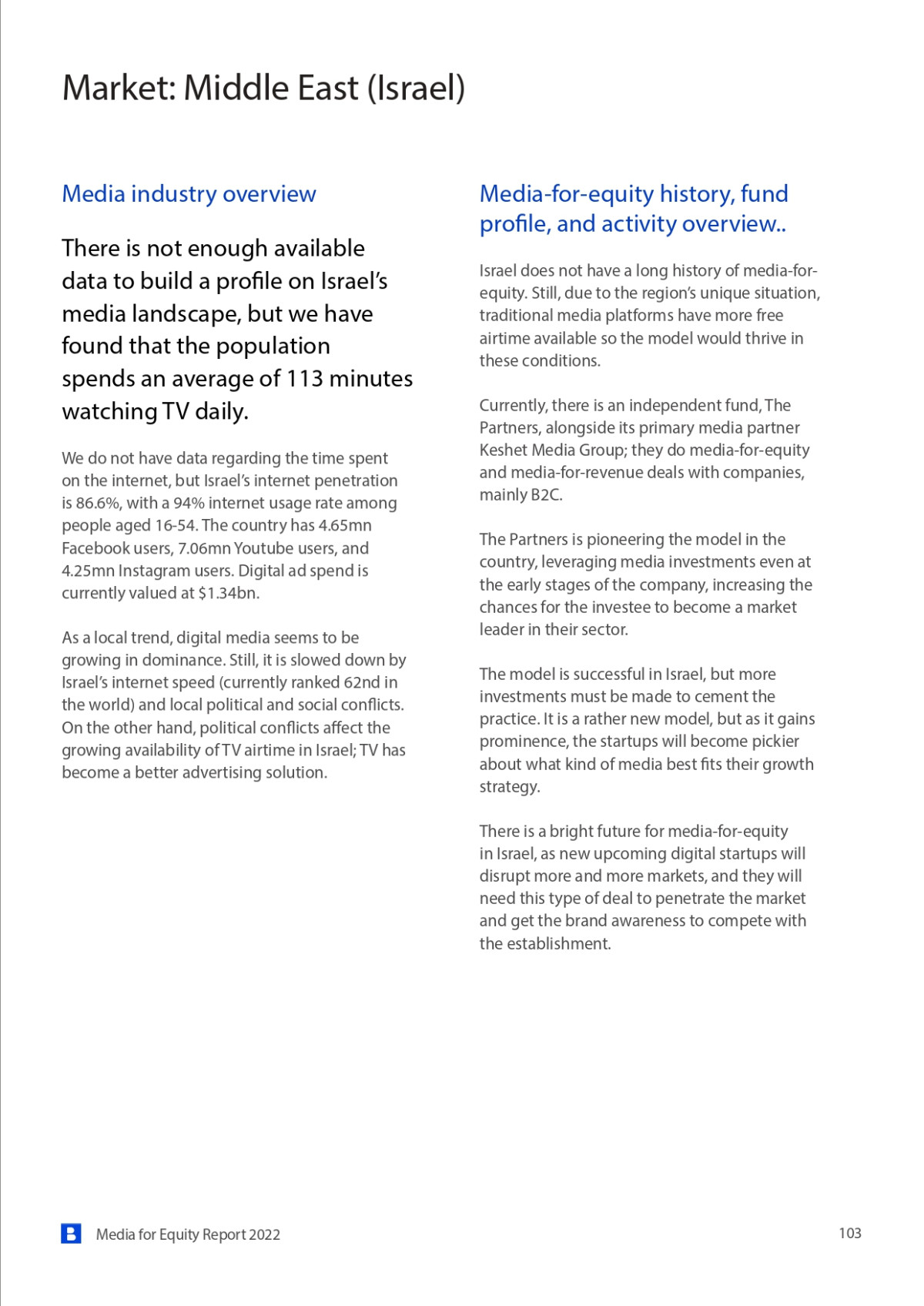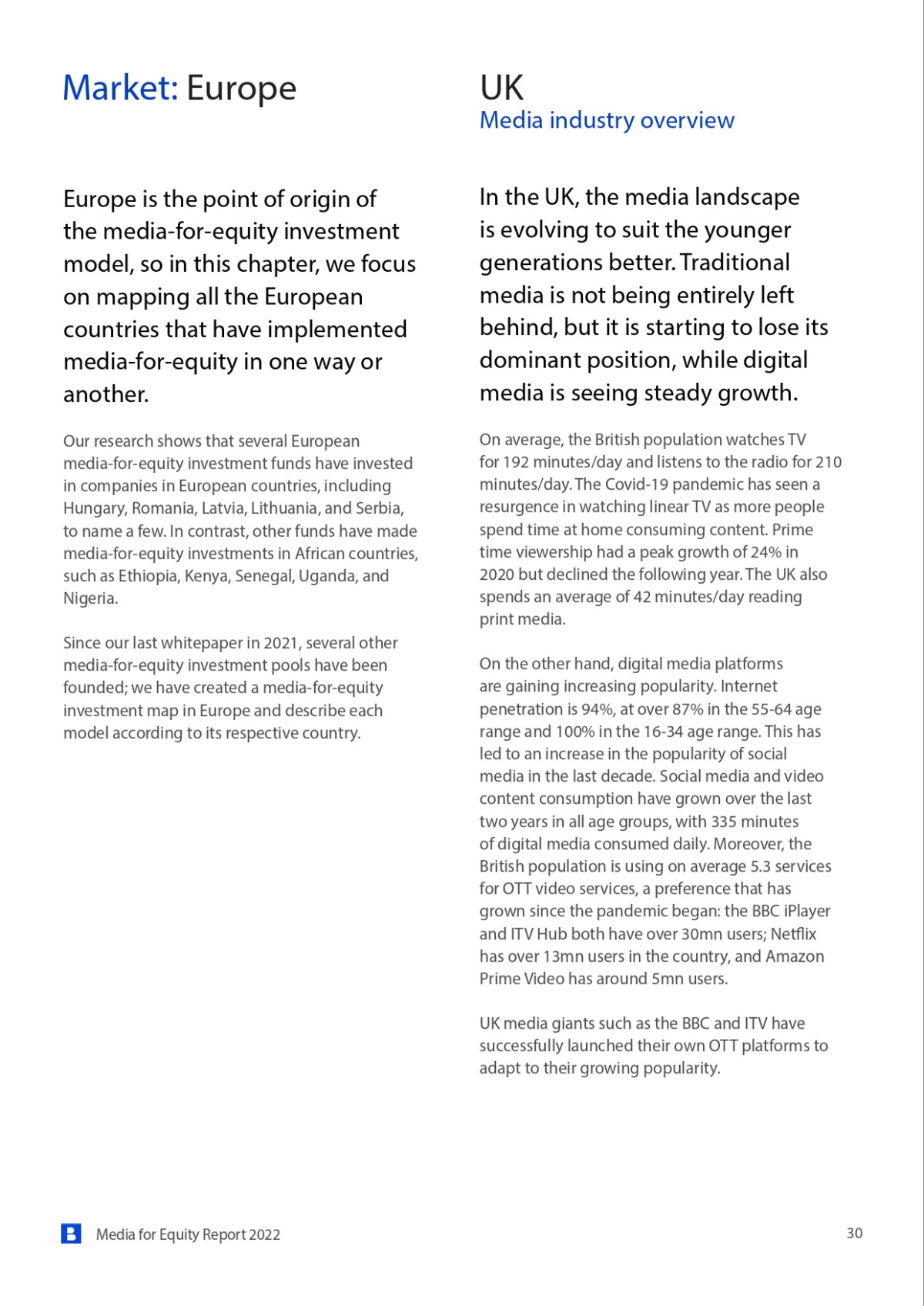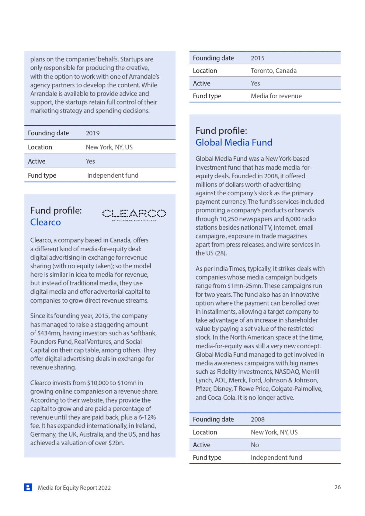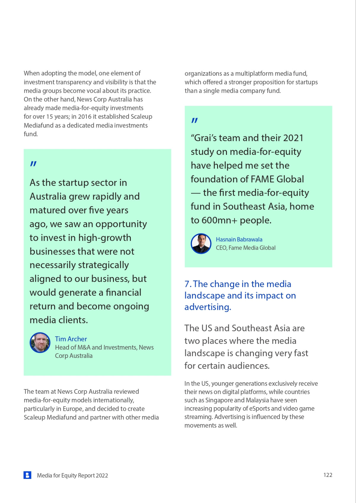 As part of our 2022 report conclusion, we anchored out some directions for media-for-equity investments for the years to come. The model will become increasingly popular, and with the evolution of the media industry, we expect to see new forms of advertising being used in exchange for equity, such as influencer marketing. Similarly, OTT platforms will give rise to media buying technologies, enabling upcoming companies to gain direct access to media buying, such as performance marketing.