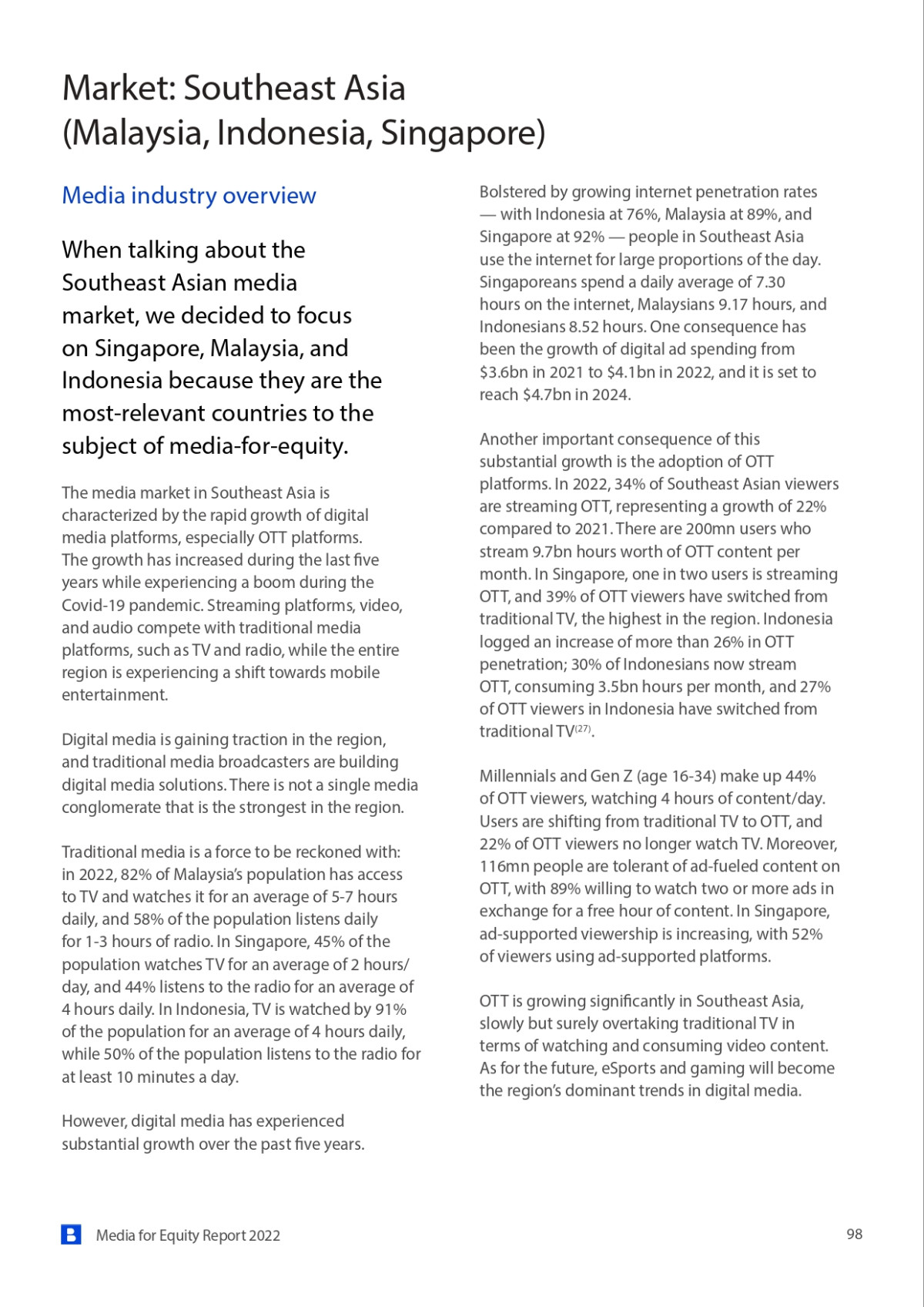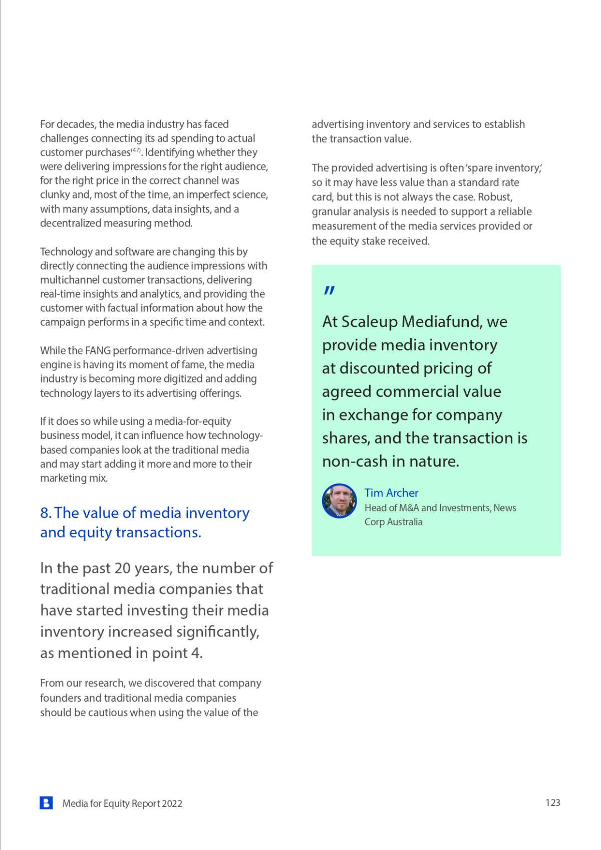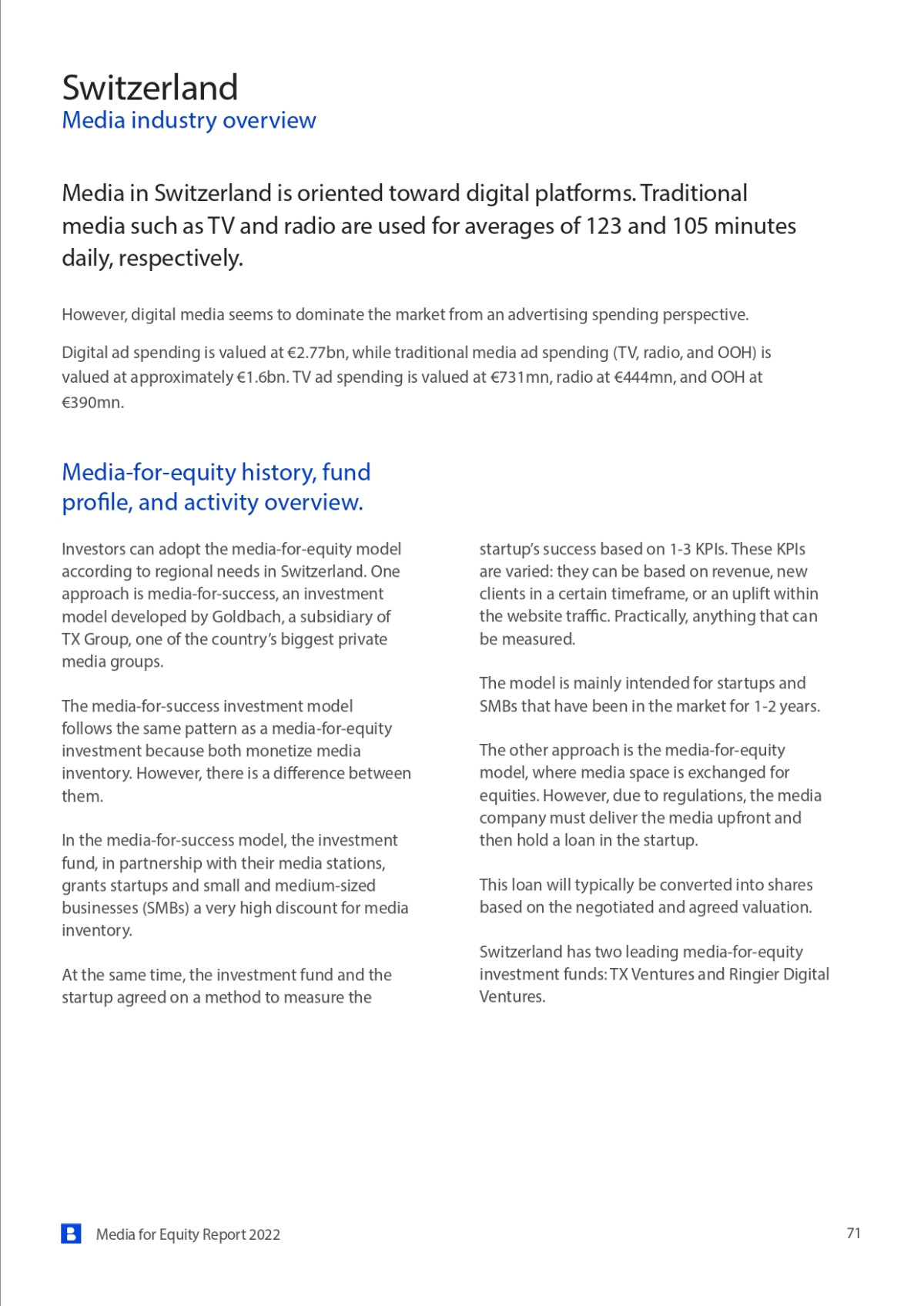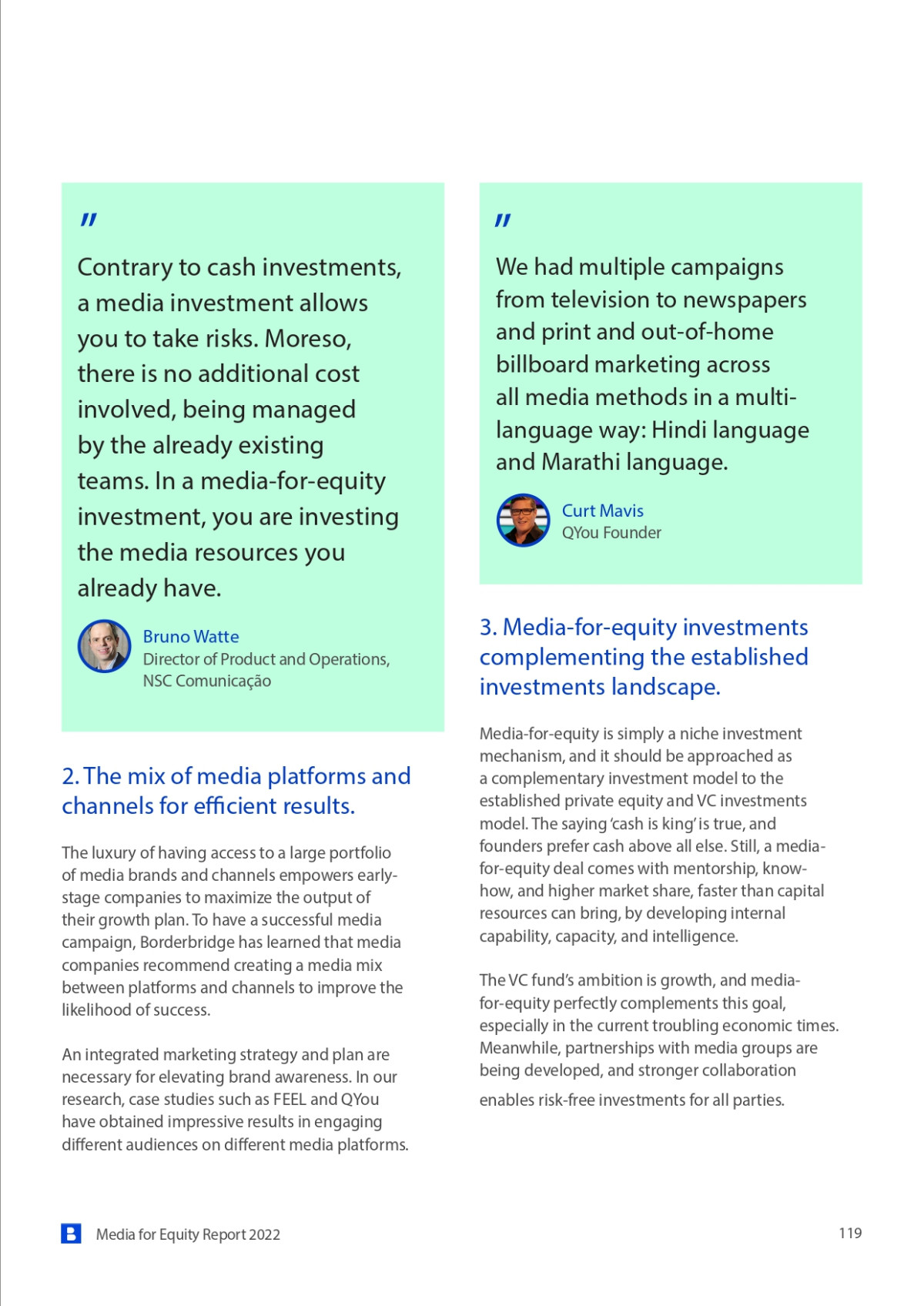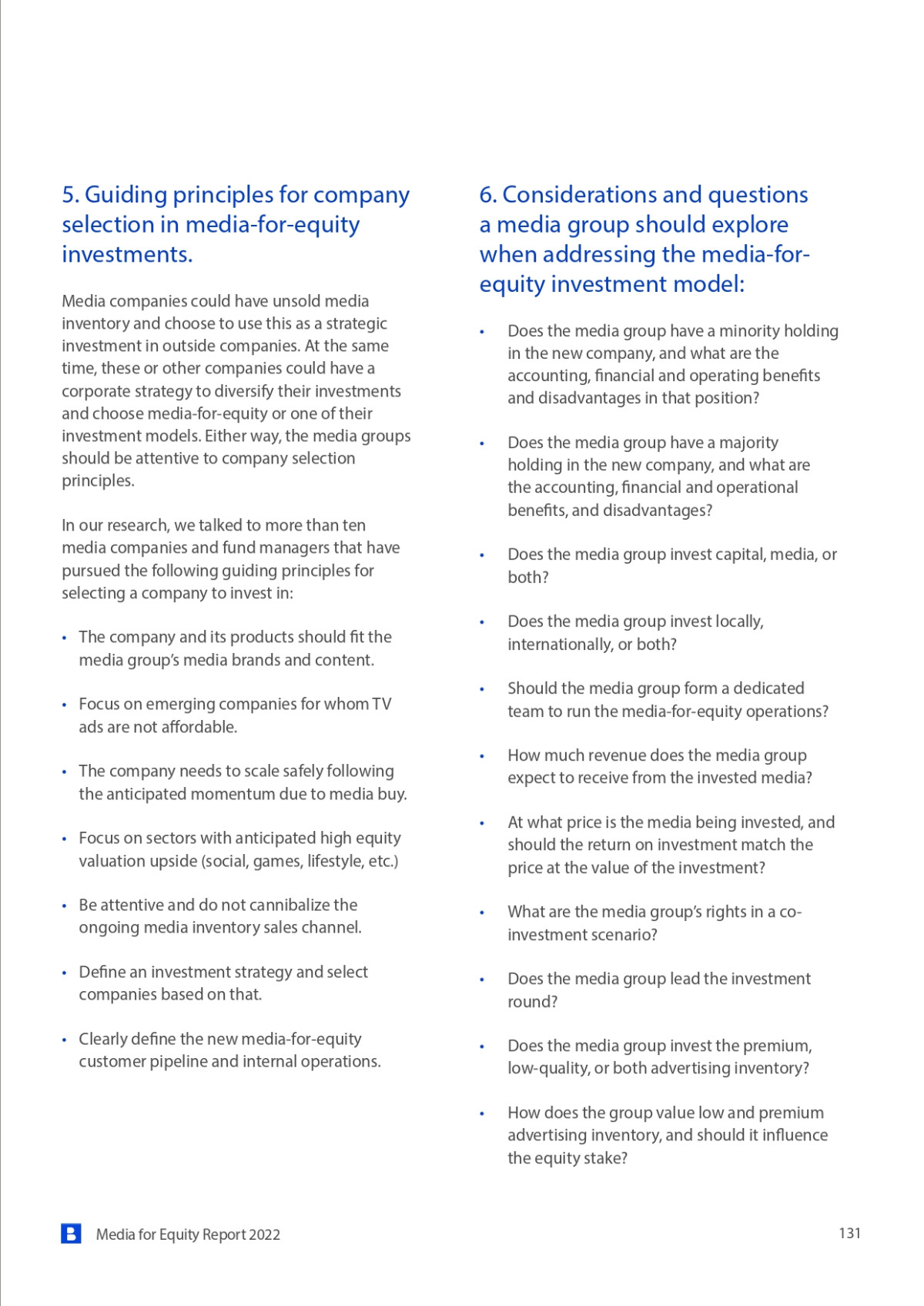 As part of our 2022 report conclusion, we anchored out some directions for media-for-equity investments for the years to come. The model will become increasingly popular, and with the evolution of the media industry, we expect to see new forms of advertising being used in exchange for equity, such as influencer marketing. Similarly, OTT platforms will give rise to media buying technologies, enabling upcoming companies to gain direct access to media buying, such as performance marketing.