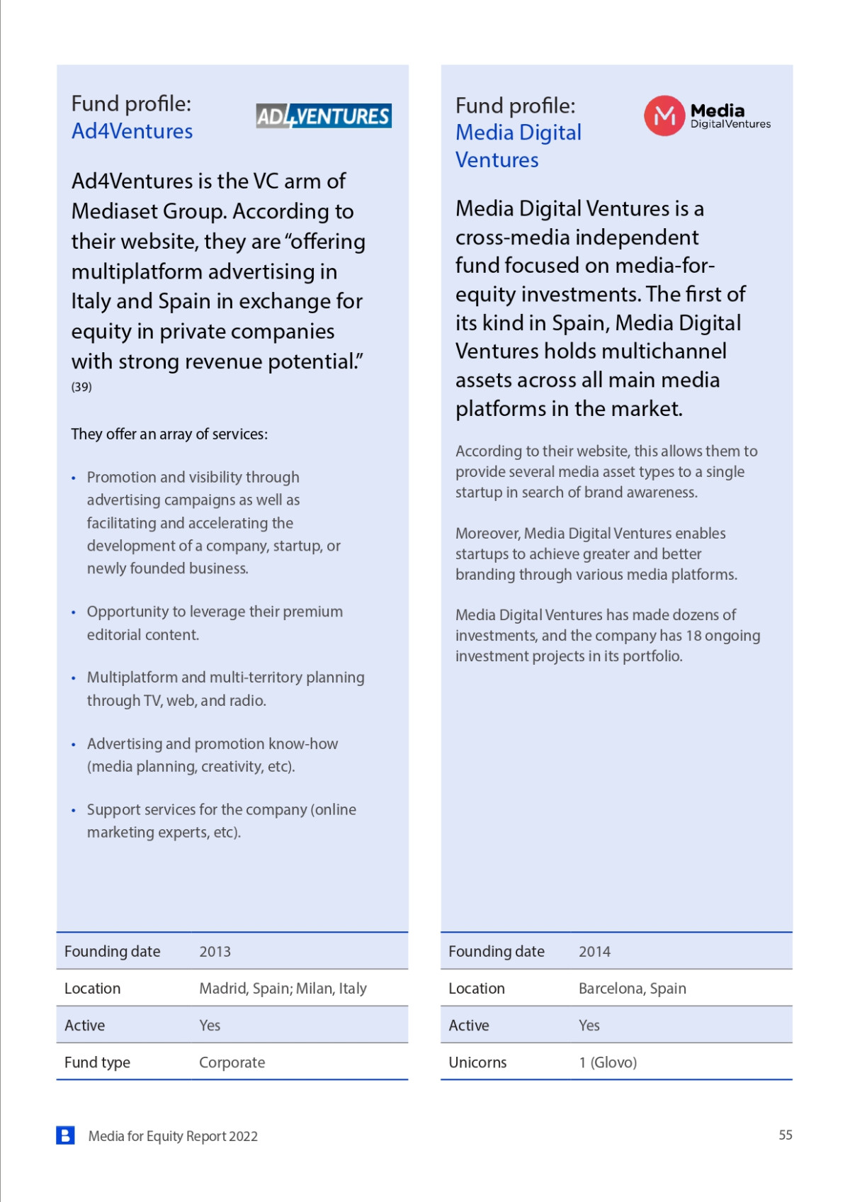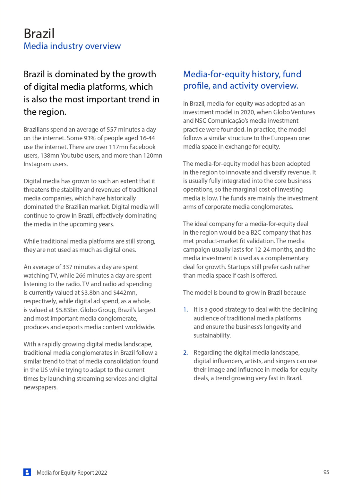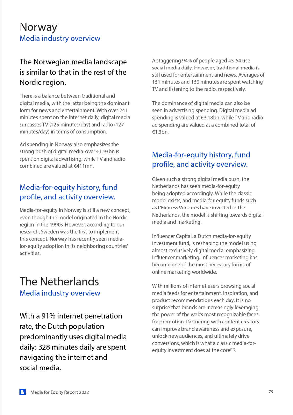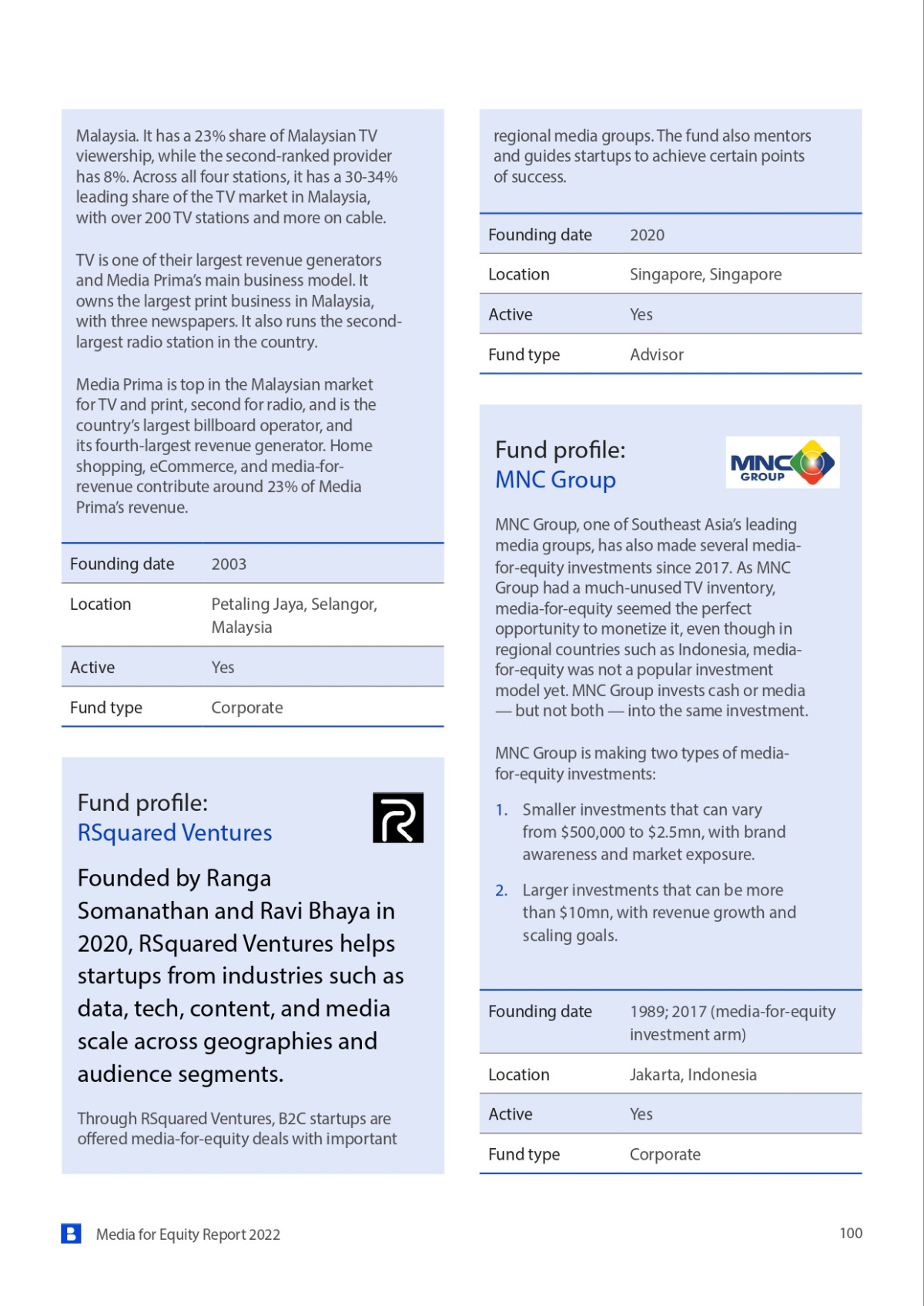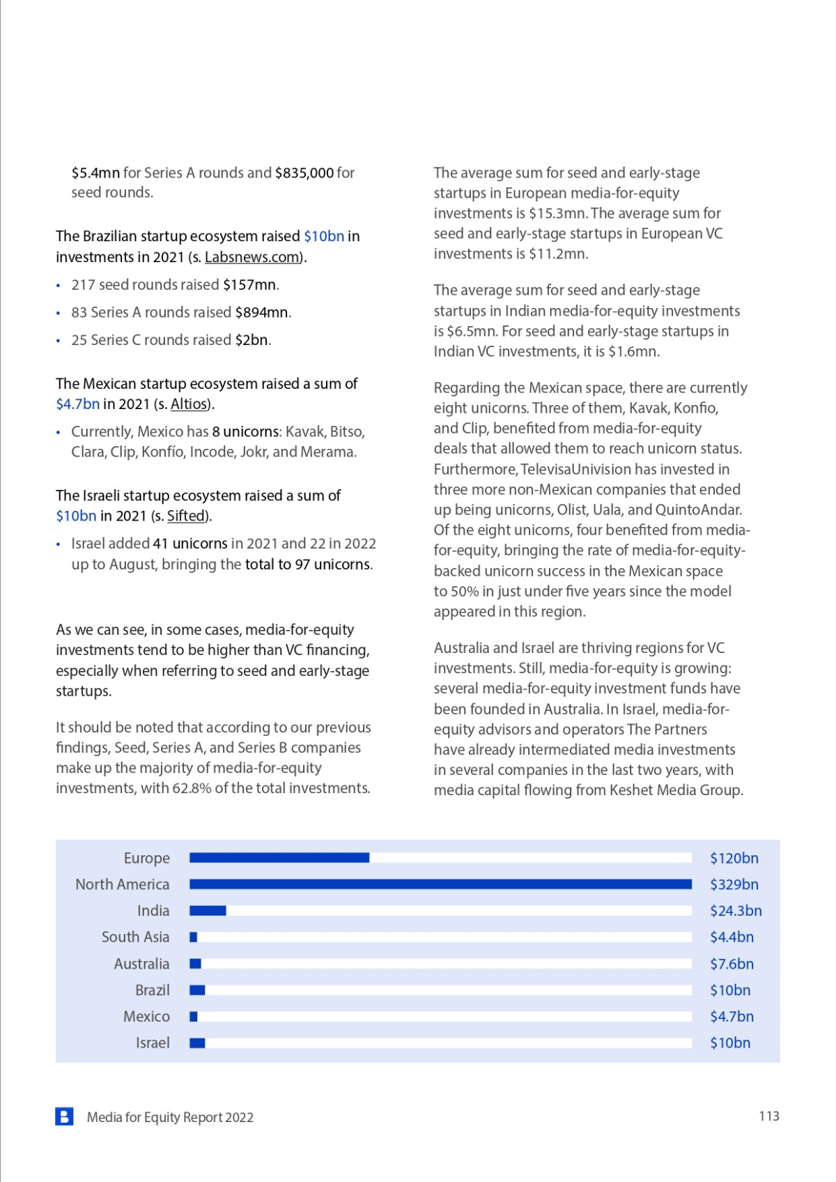 As part of our 2022 report conclusion, we anchored out some directions for media-for-equity investments for the years to come. The model will become increasingly popular, and with the evolution of the media industry, we expect to see new forms of advertising being used in exchange for equity, such as influencer marketing. Similarly, OTT platforms will give rise to media buying technologies, enabling upcoming companies to gain direct access to media buying, such as performance marketing.