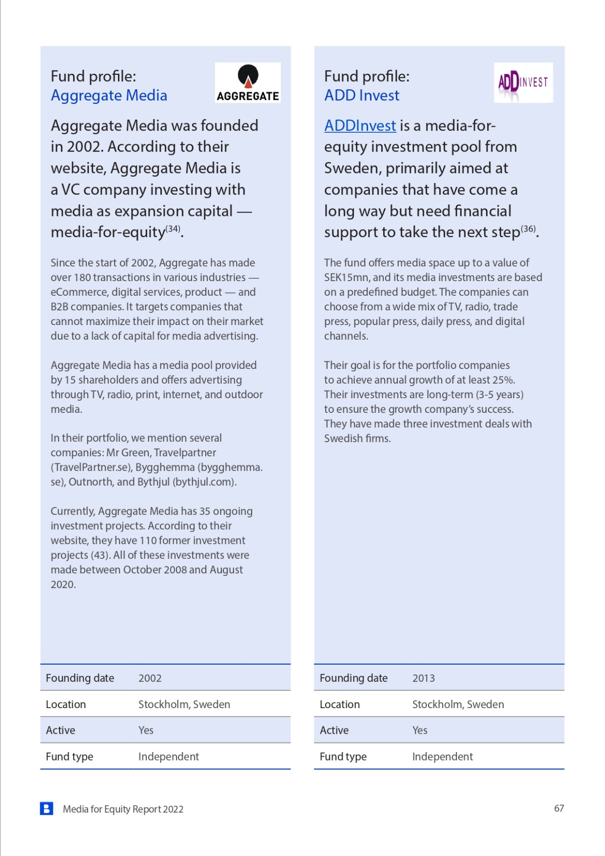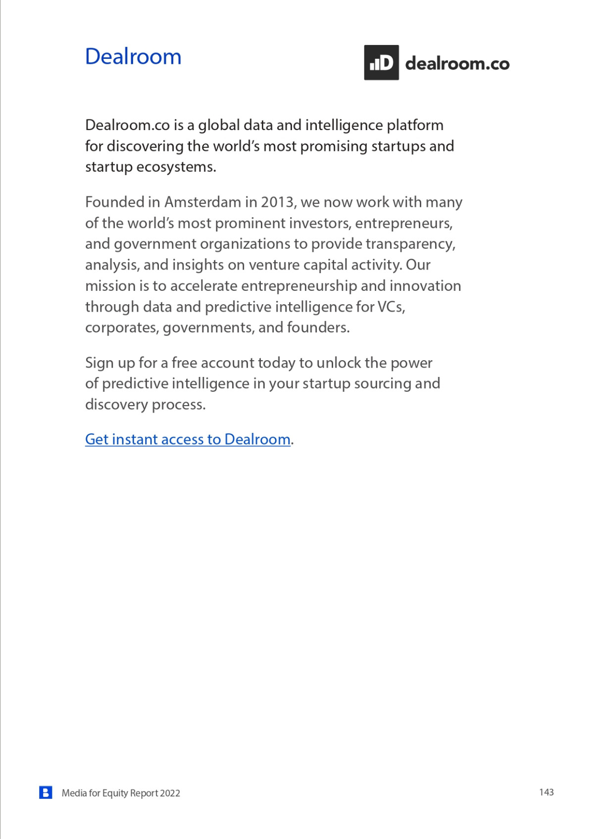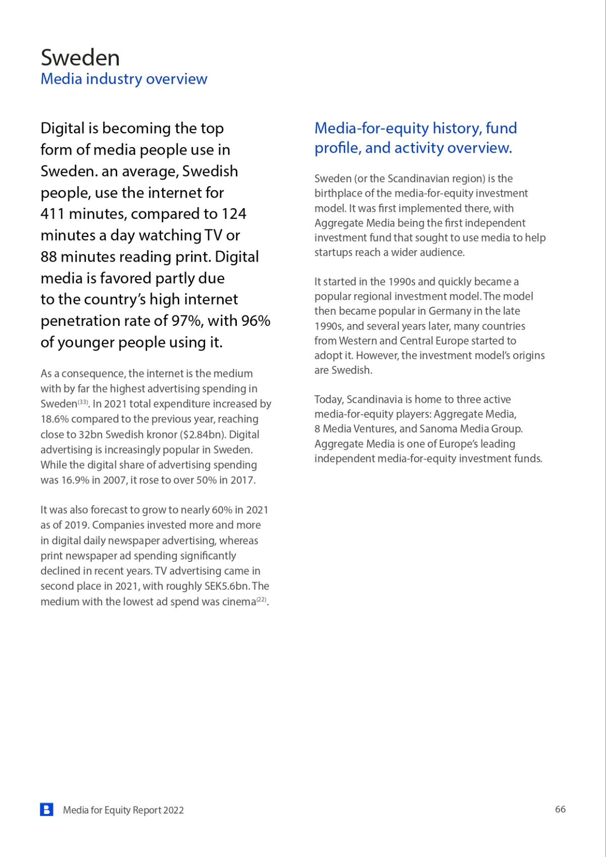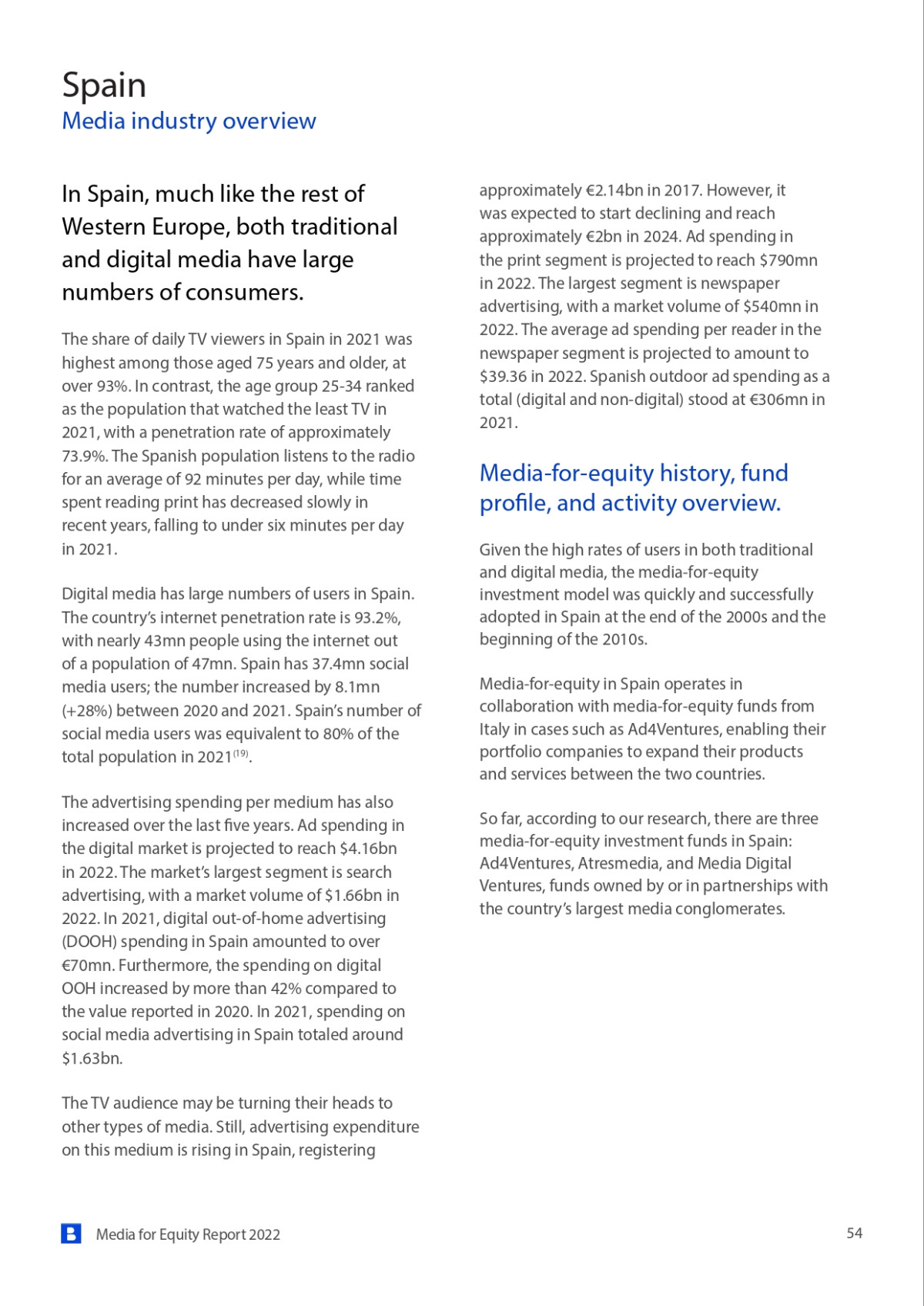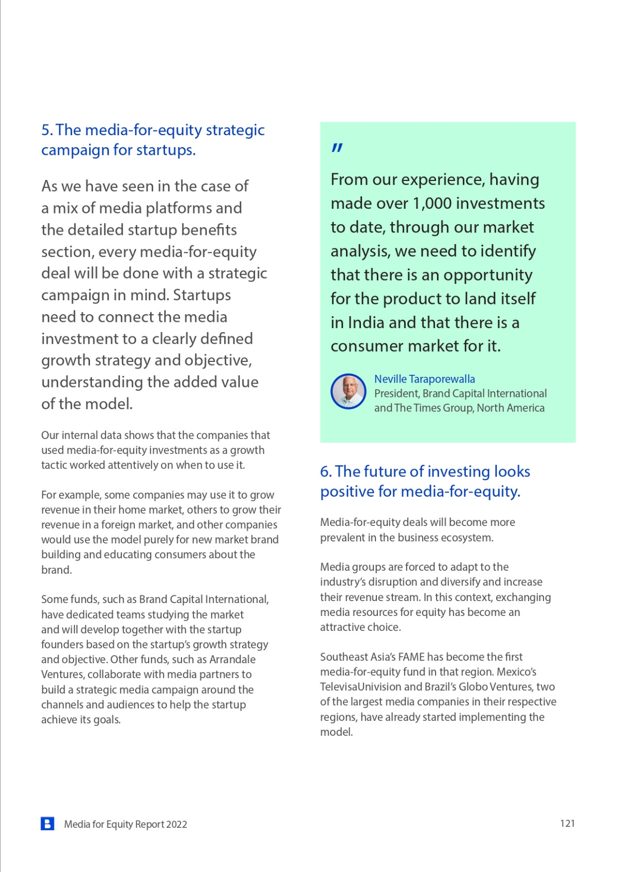 As part of our 2022 report conclusion, we anchored out some directions for media-for-equity investments for the years to come. The model will become increasingly popular, and with the evolution of the media industry, we expect to see new forms of advertising being used in exchange for equity, such as influencer marketing. Similarly, OTT platforms will give rise to media buying technologies, enabling upcoming companies to gain direct access to media buying, such as performance marketing.