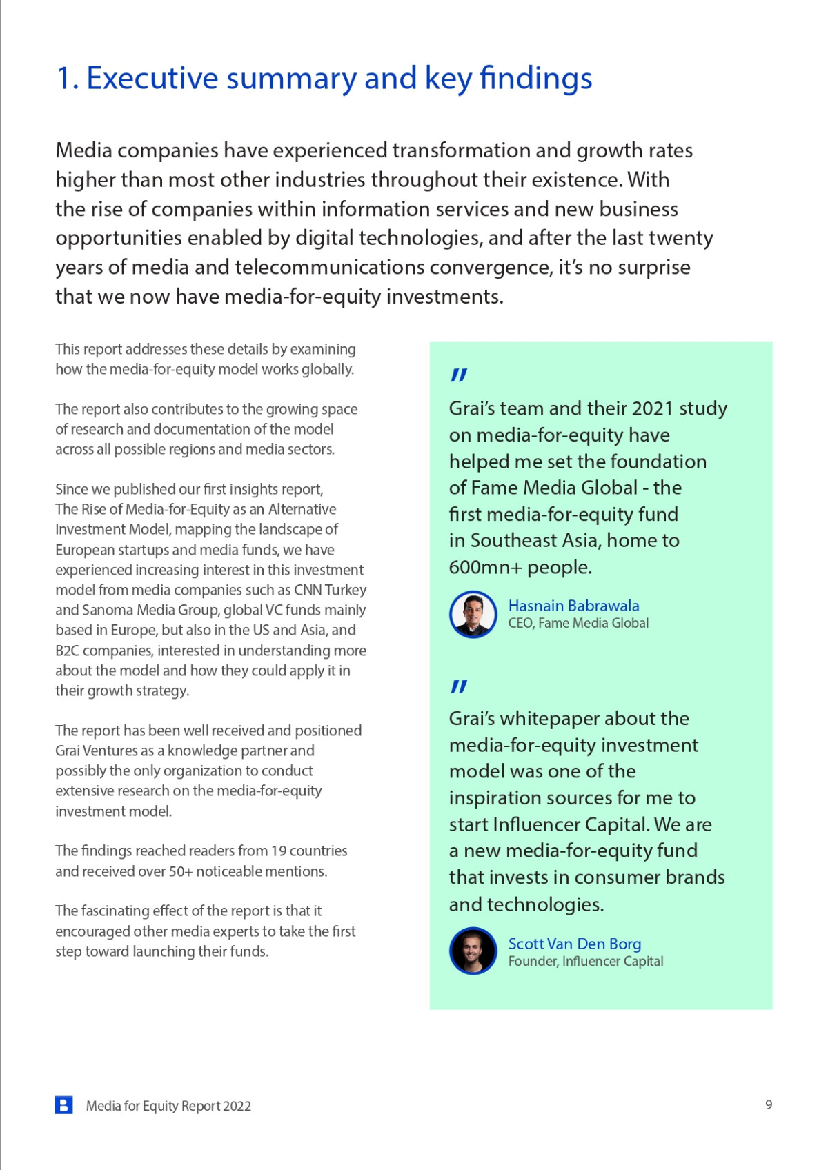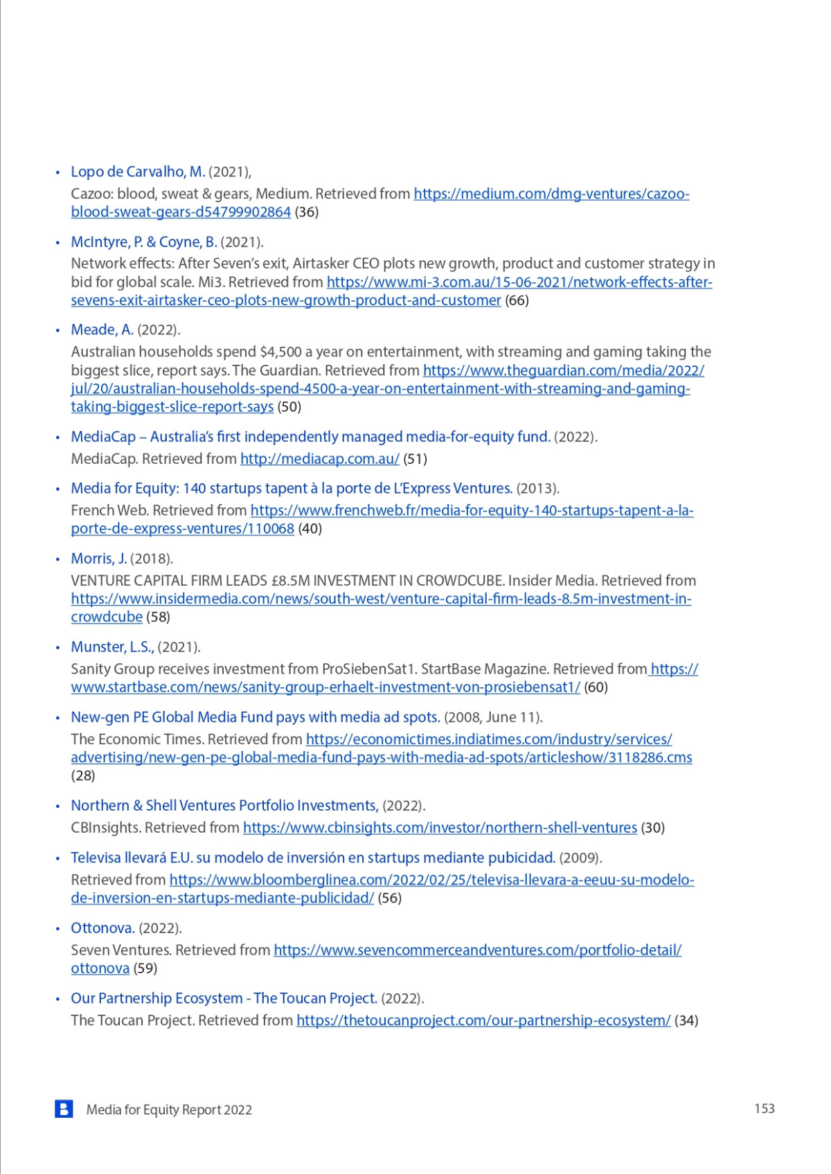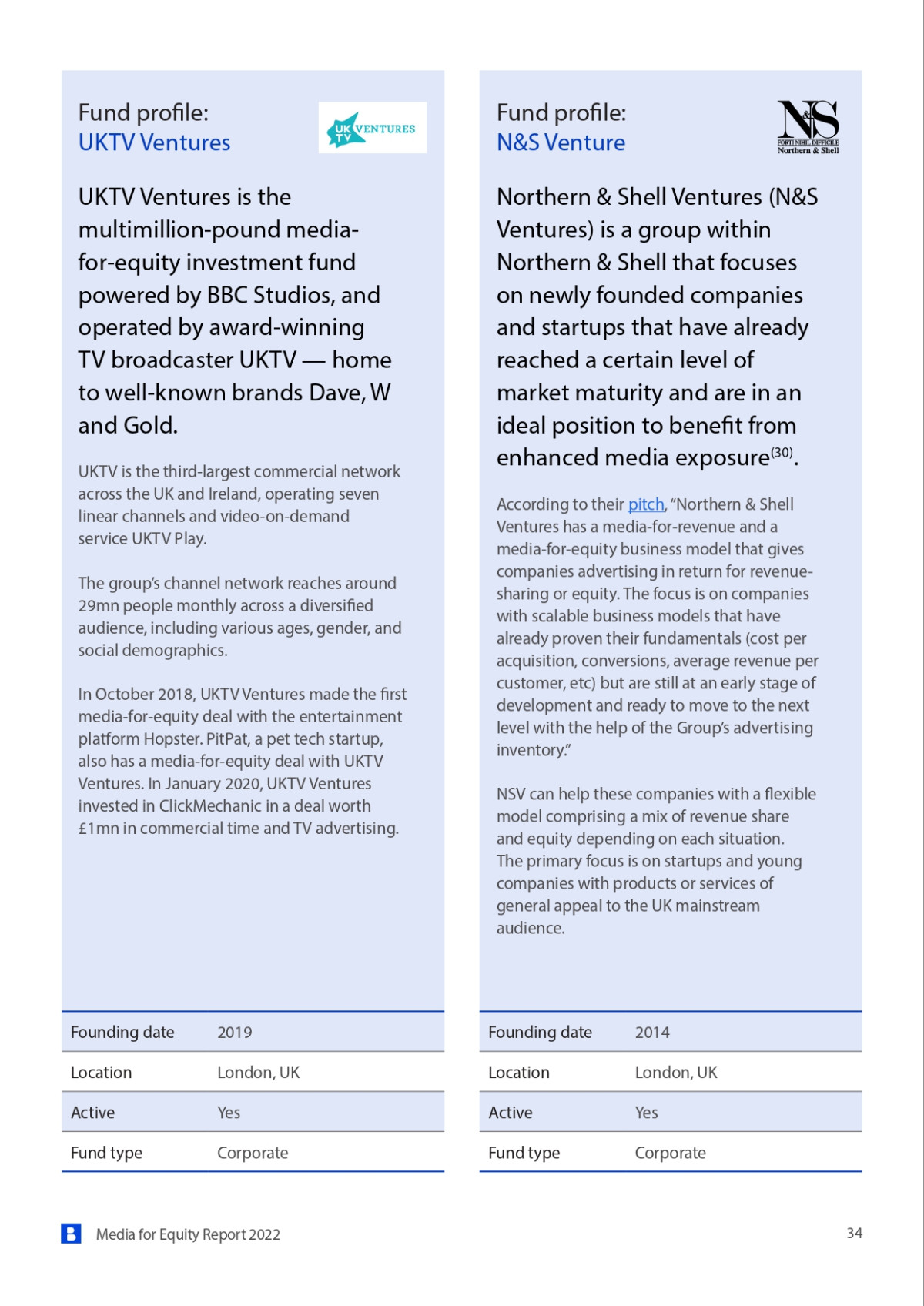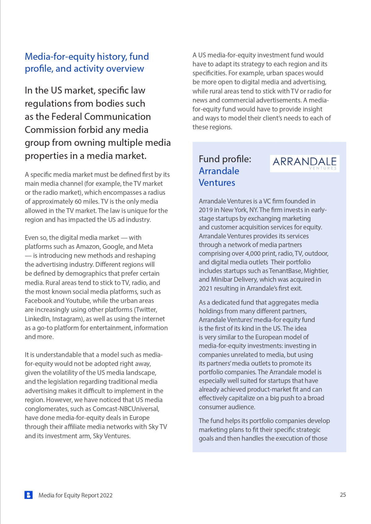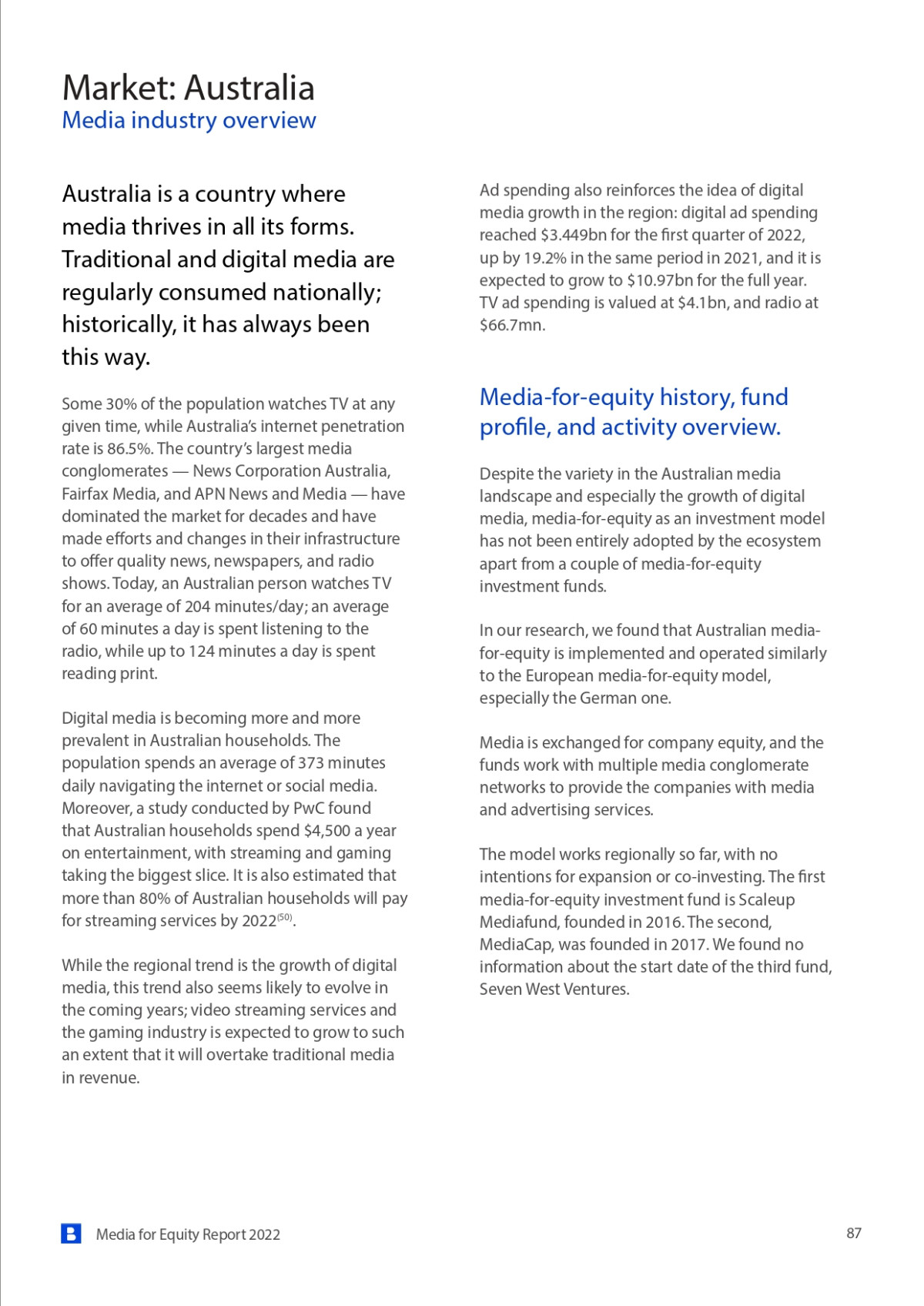 As part of our 2022 report conclusion, we anchored out some directions for media-for-equity investments for the years to come. The model will become increasingly popular, and with the evolution of the media industry, we expect to see new forms of advertising being used in exchange for equity, such as influencer marketing. Similarly, OTT platforms will give rise to media buying technologies, enabling upcoming companies to gain direct access to media buying, such as performance marketing.