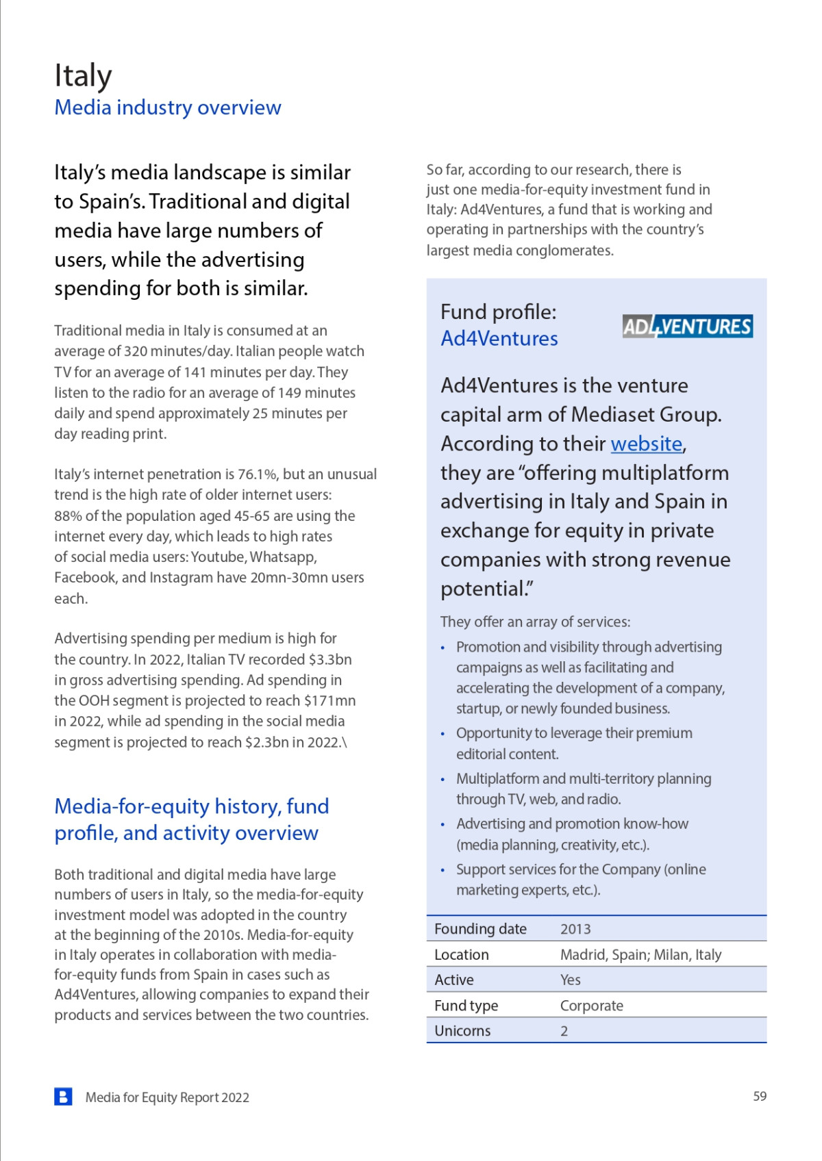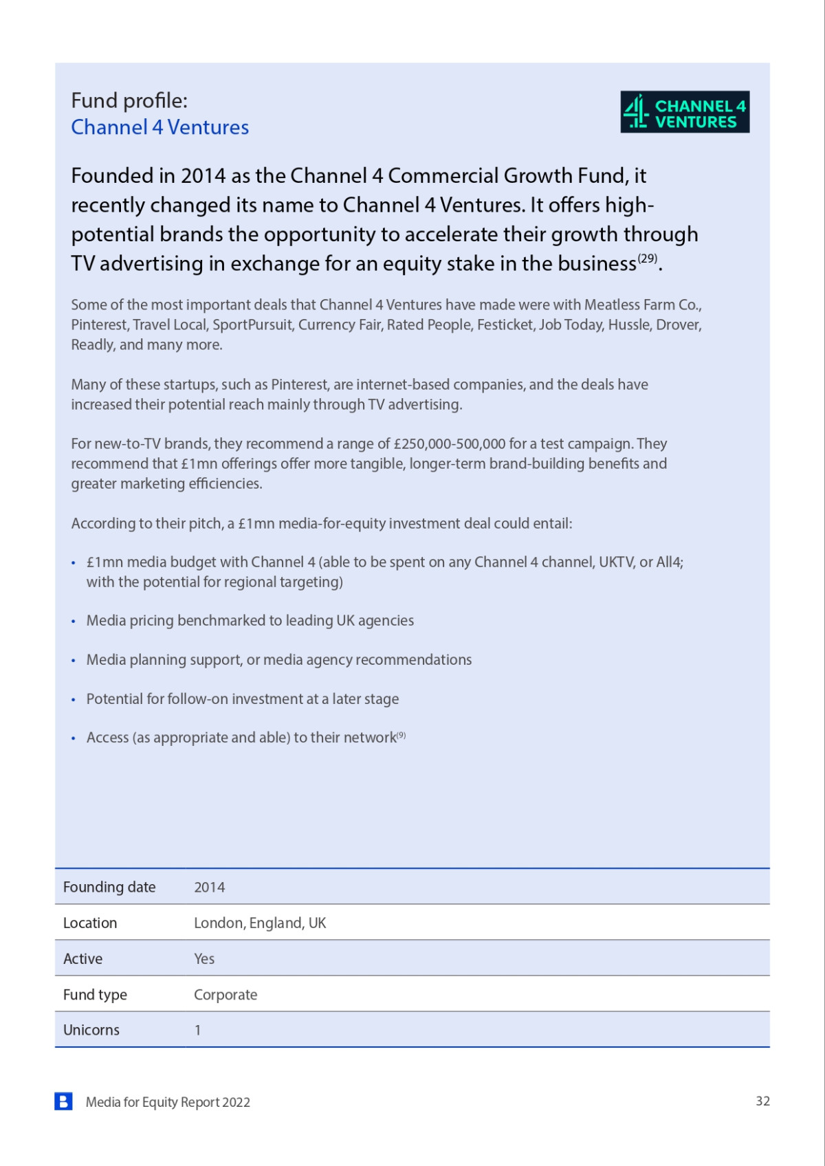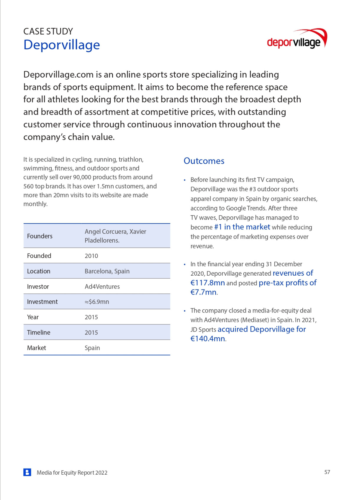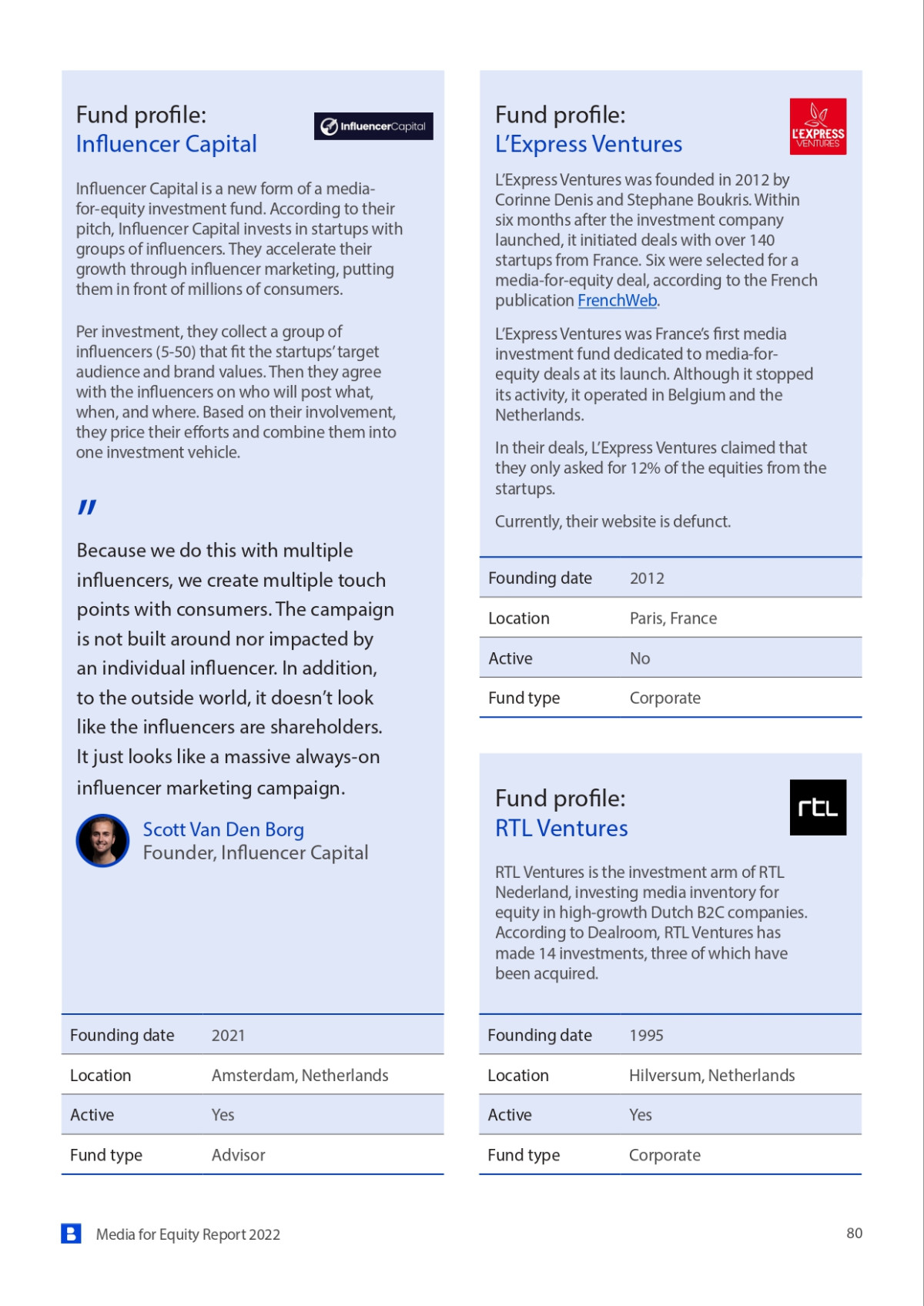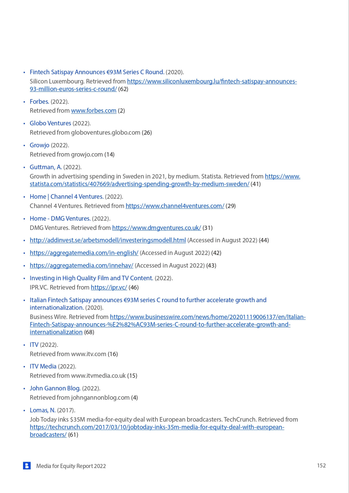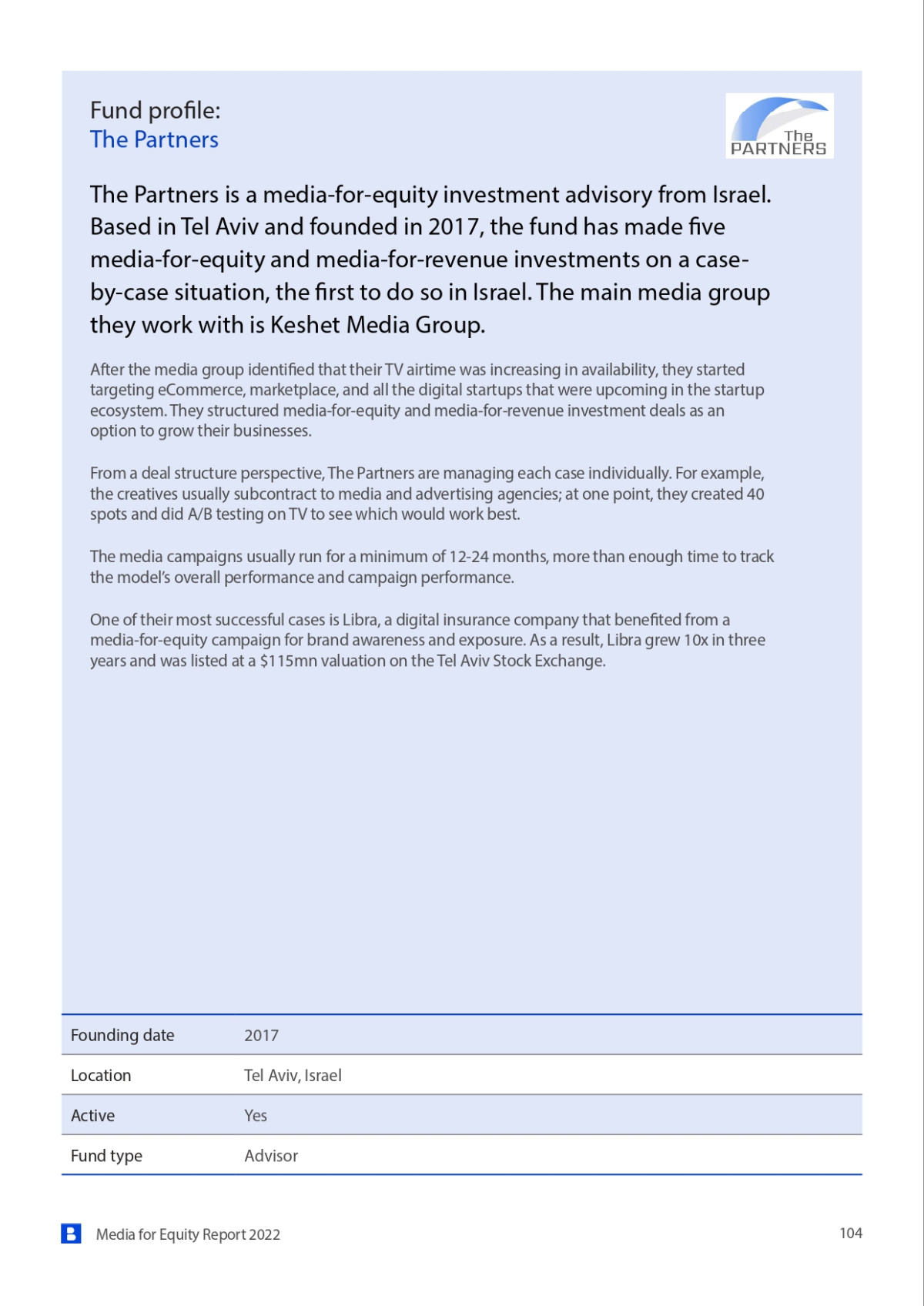As part of our 2022 report conclusion, we anchored out some directions for media-for-equity investments for the years to come. The model will become increasingly popular, and with the evolution of the media industry, we expect to see new forms of advertising being used in exchange for equity, such as influencer marketing. Similarly, OTT platforms will give rise to media buying technologies, enabling upcoming companies to gain direct access to media buying, such as performance marketing.
