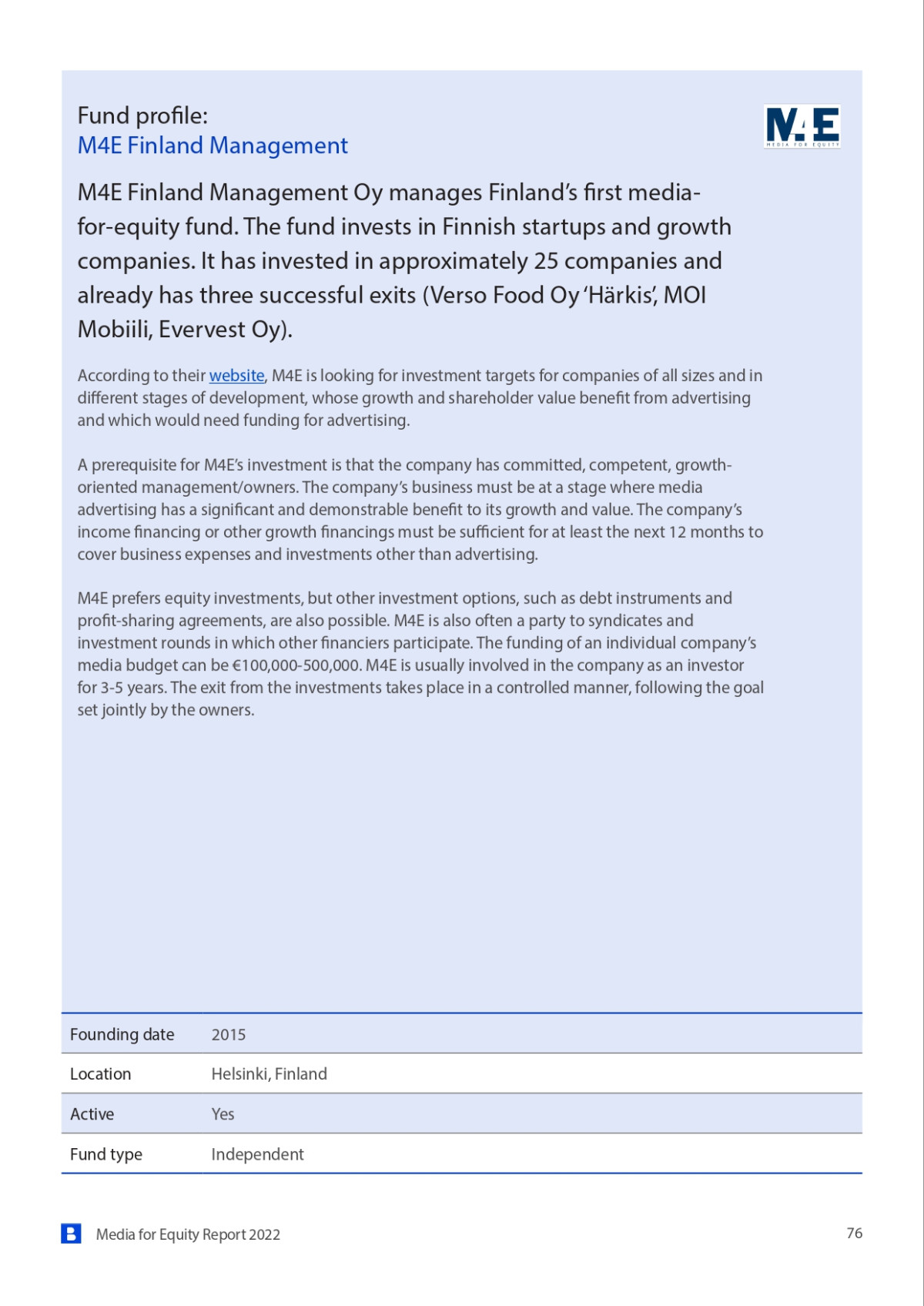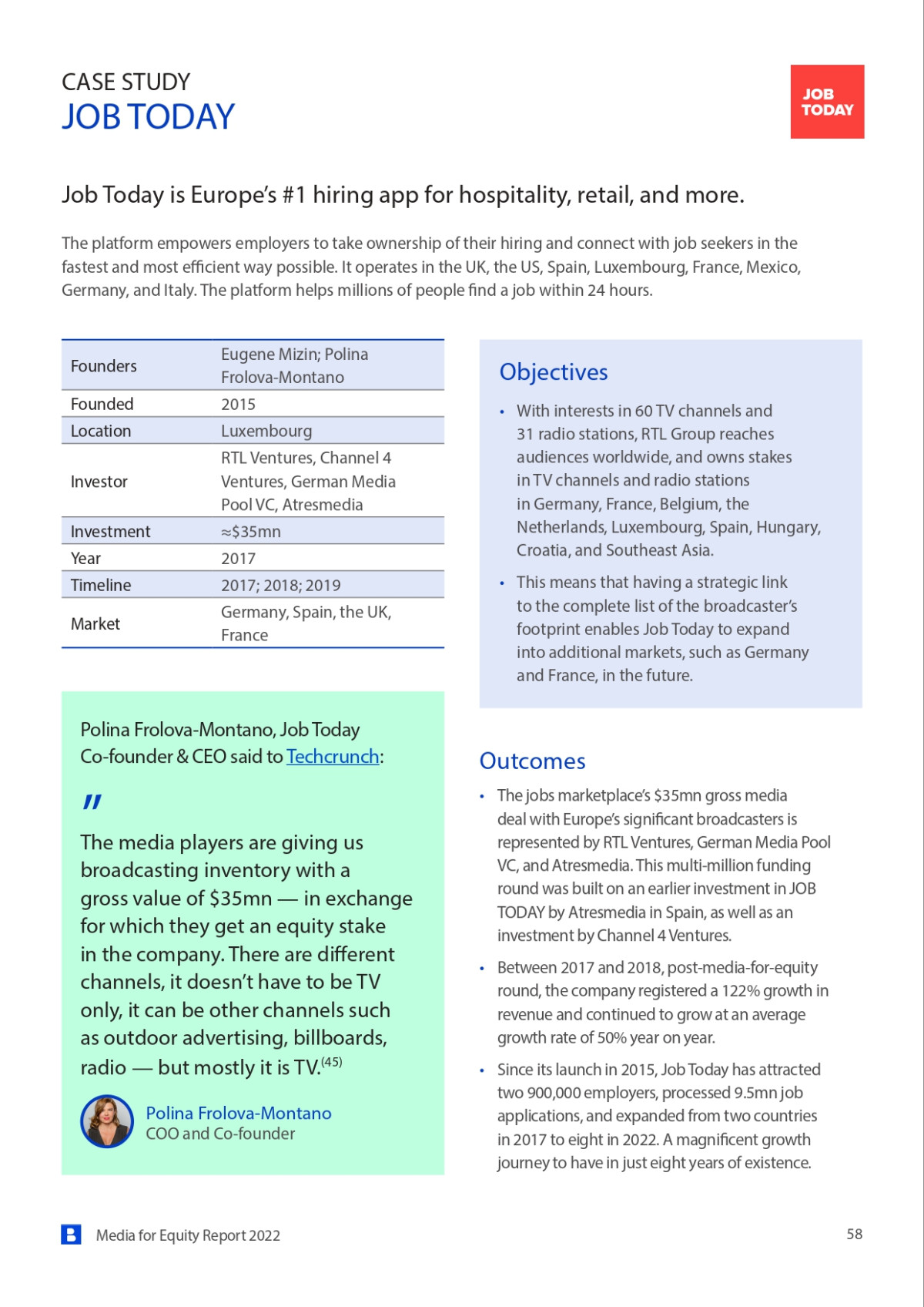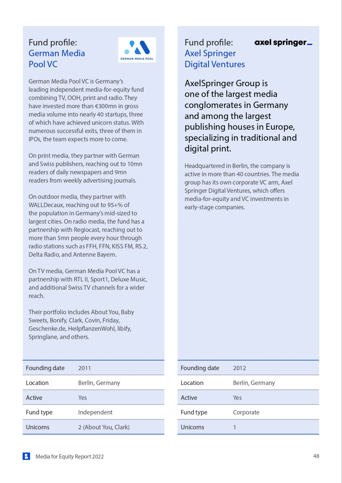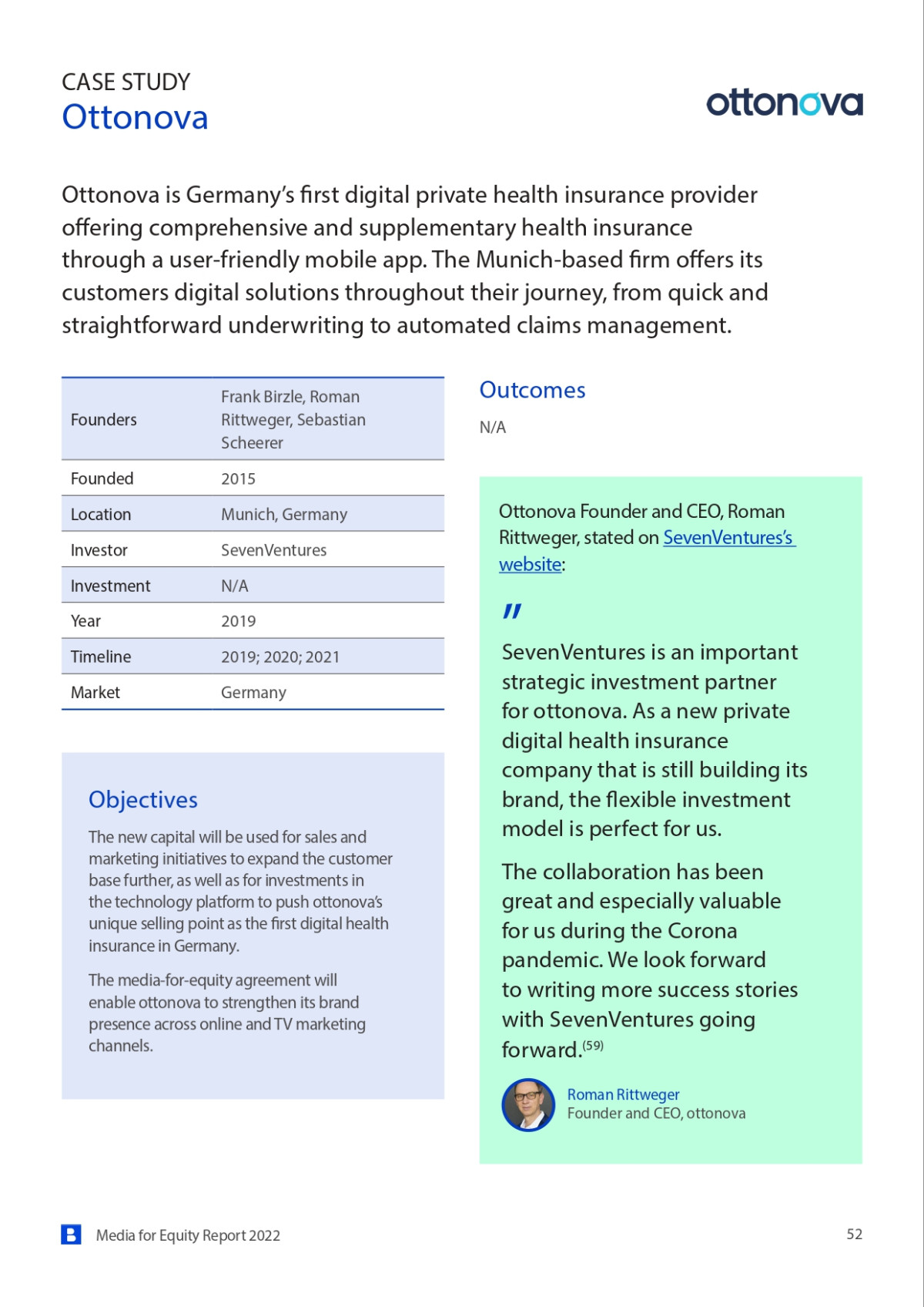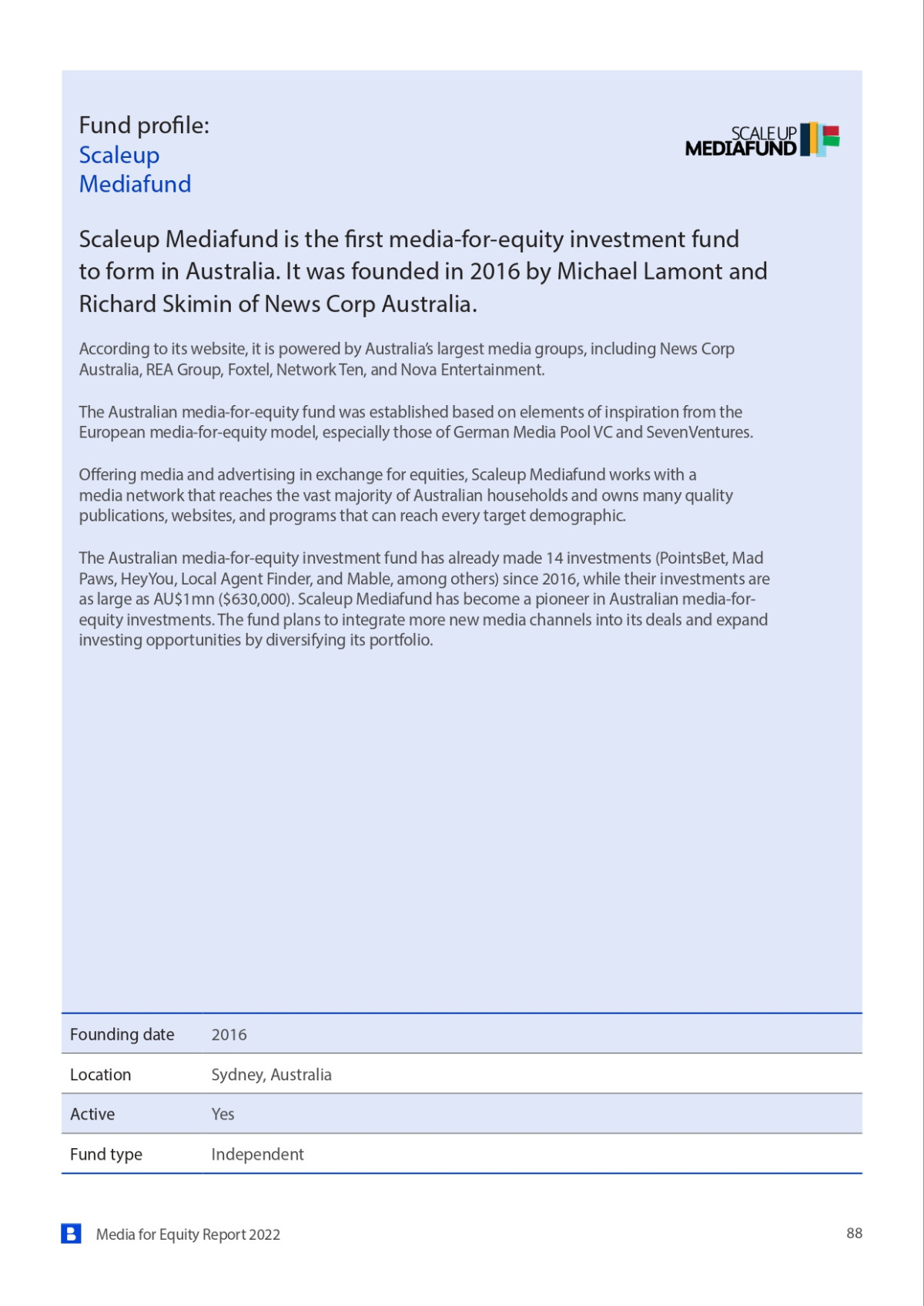 As part of our 2022 report conclusion, we anchored out some directions for media-for-equity investments for the years to come. The model will become increasingly popular, and with the evolution of the media industry, we expect to see new forms of advertising being used in exchange for equity, such as influencer marketing. Similarly, OTT platforms will give rise to media buying technologies, enabling upcoming companies to gain direct access to media buying, such as performance marketing.