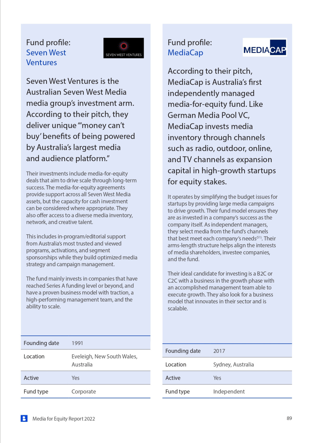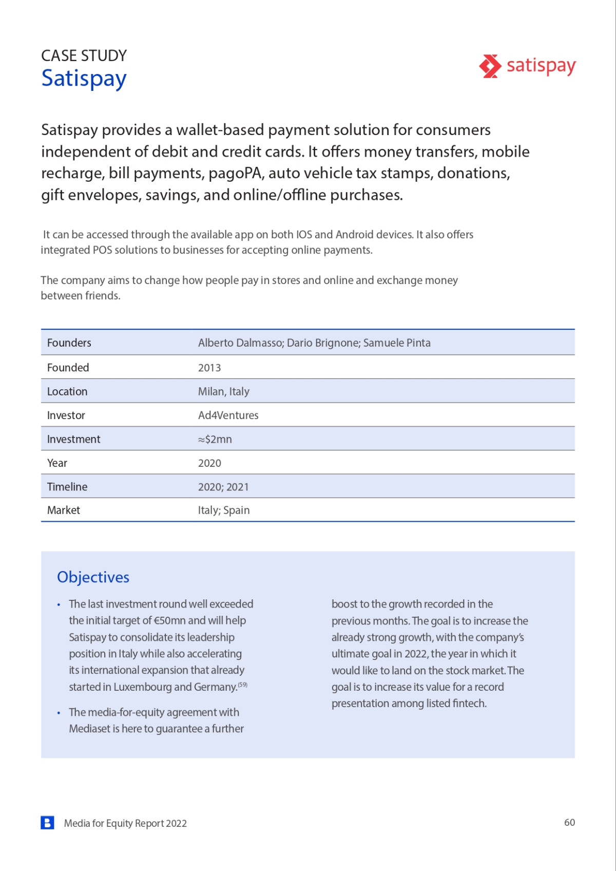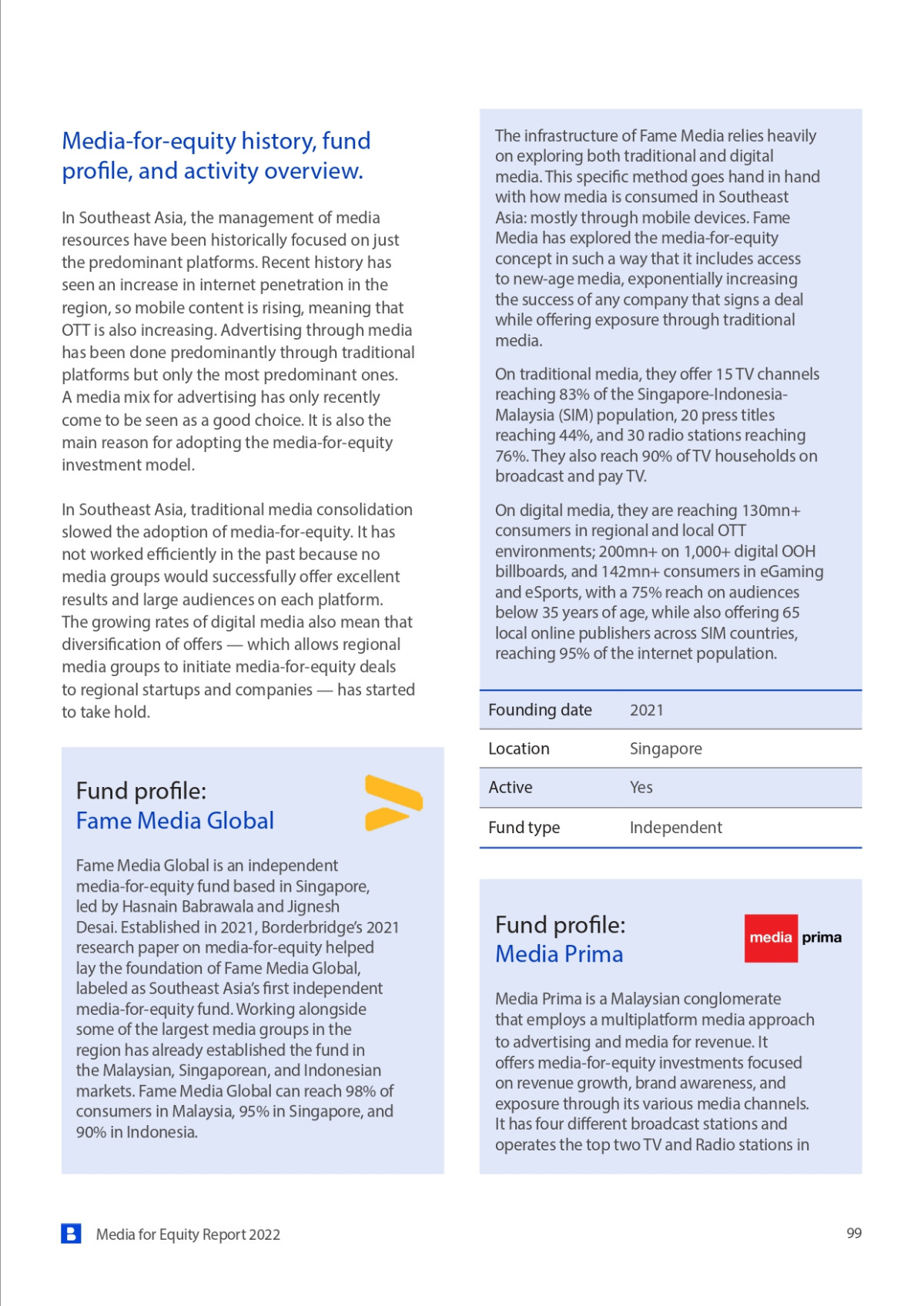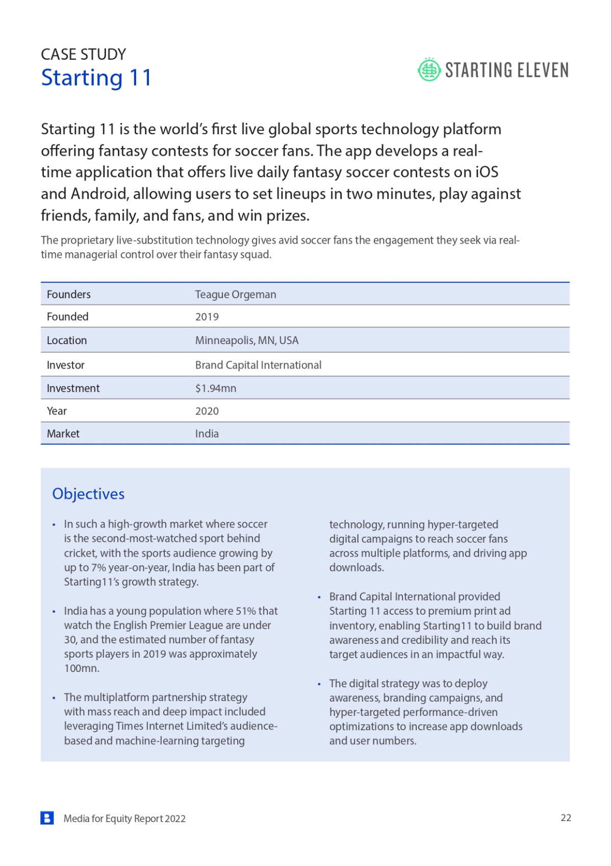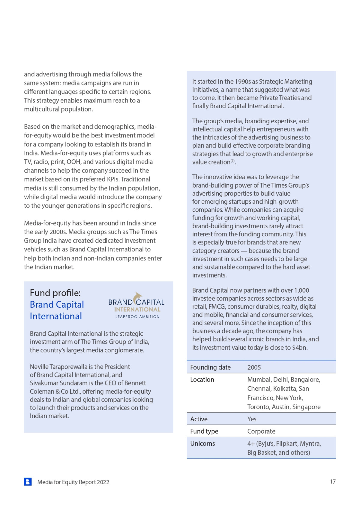 As part of our 2022 report conclusion, we anchored out some directions for media-for-equity investments for the years to come. The model will become increasingly popular, and with the evolution of the media industry, we expect to see new forms of advertising being used in exchange for equity, such as influencer marketing. Similarly, OTT platforms will give rise to media buying technologies, enabling upcoming companies to gain direct access to media buying, such as performance marketing.