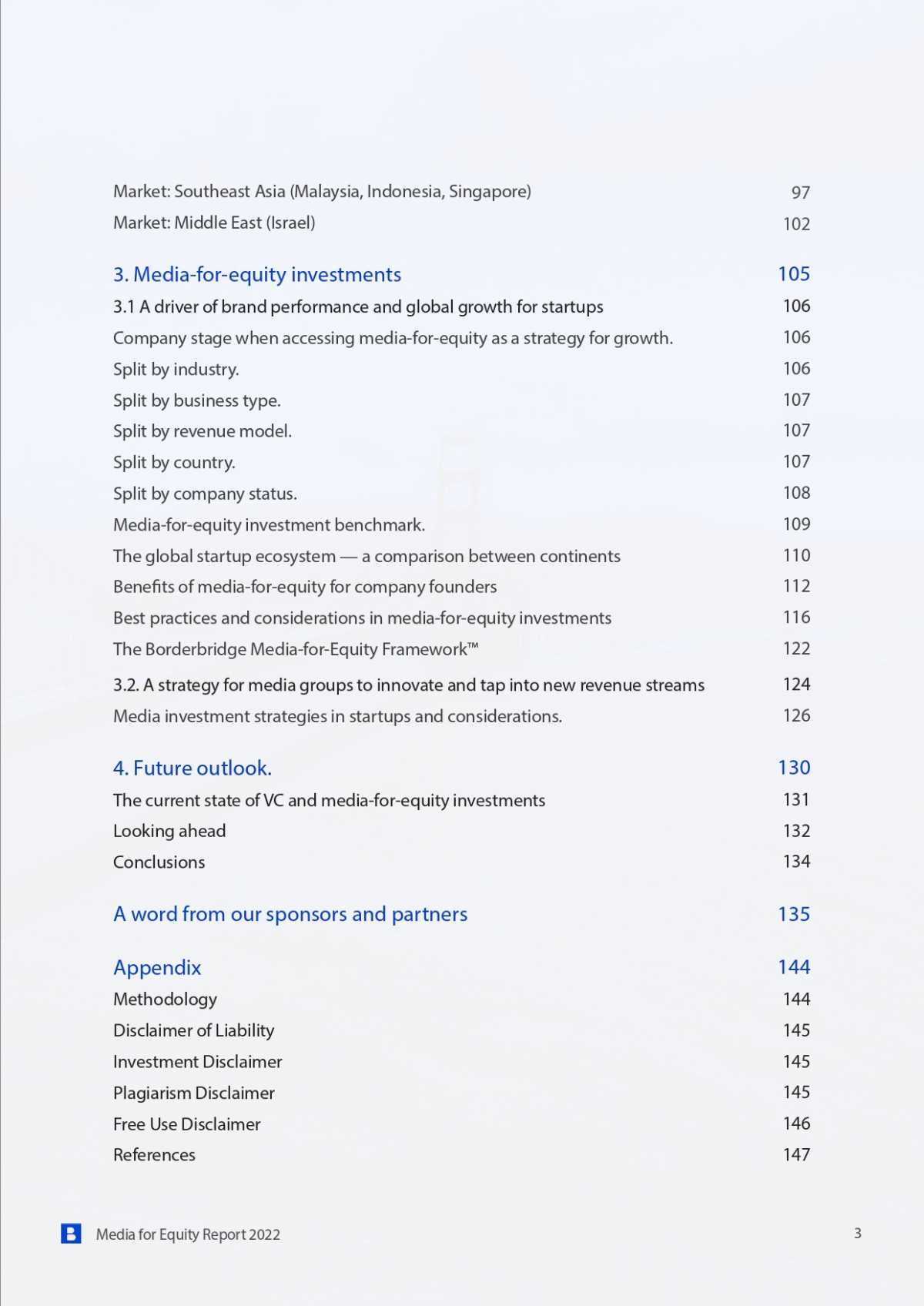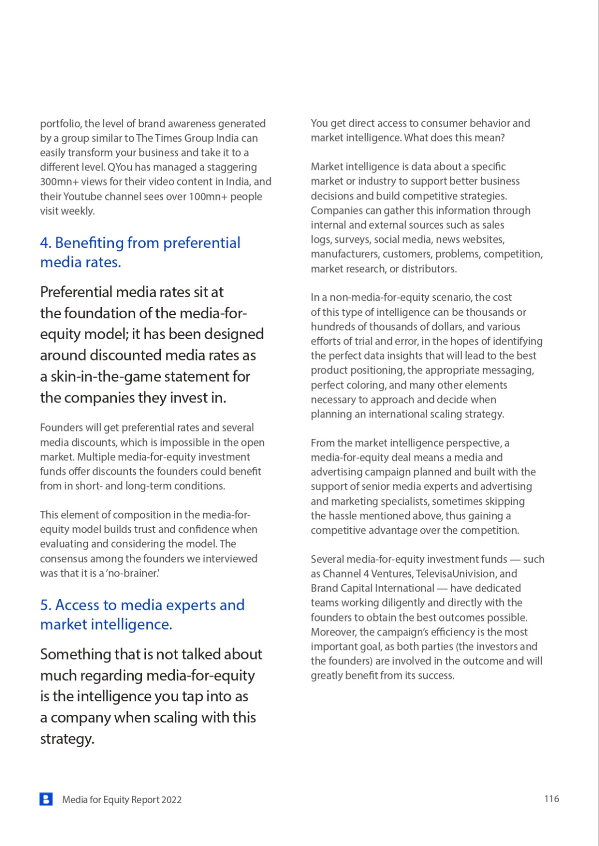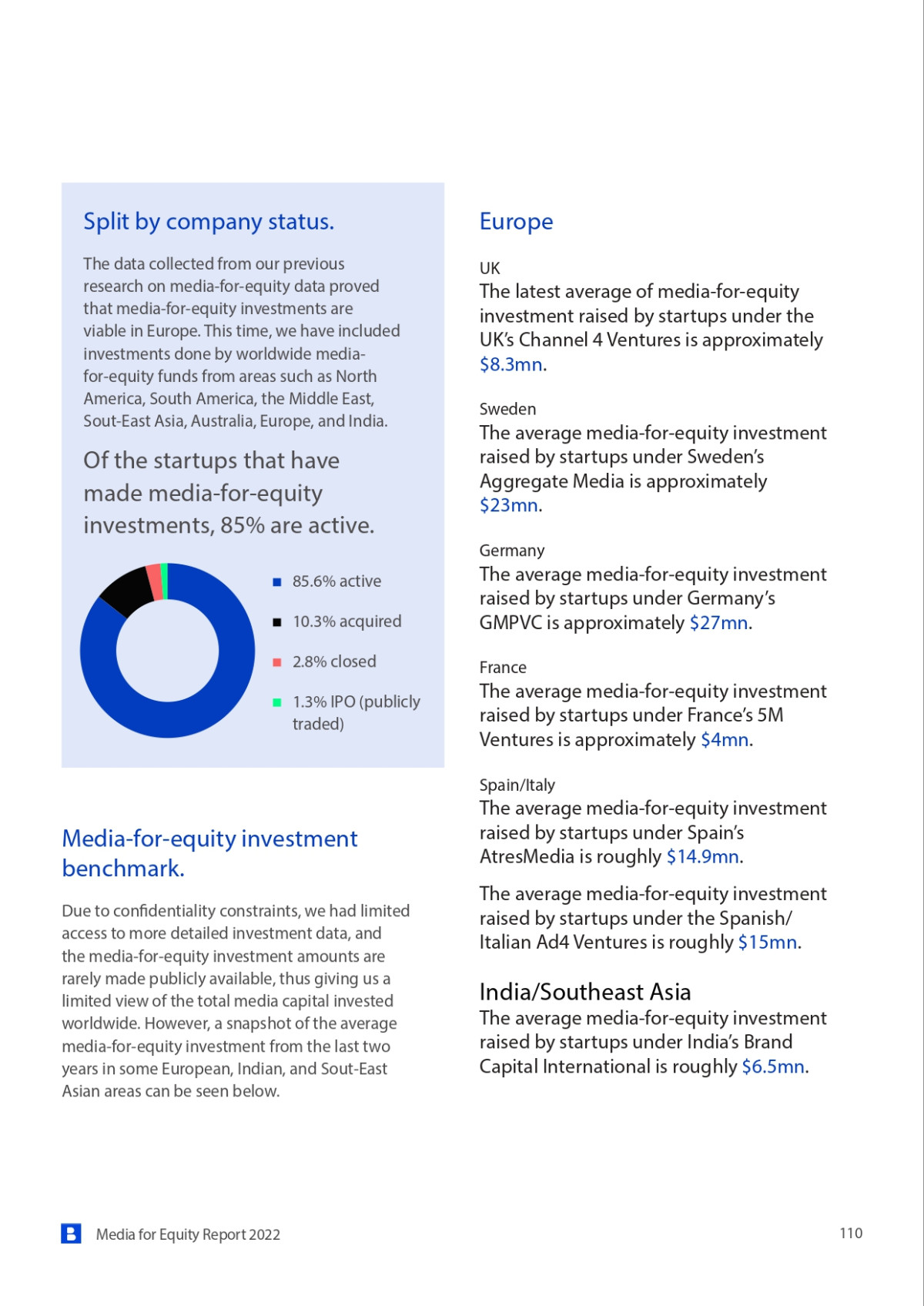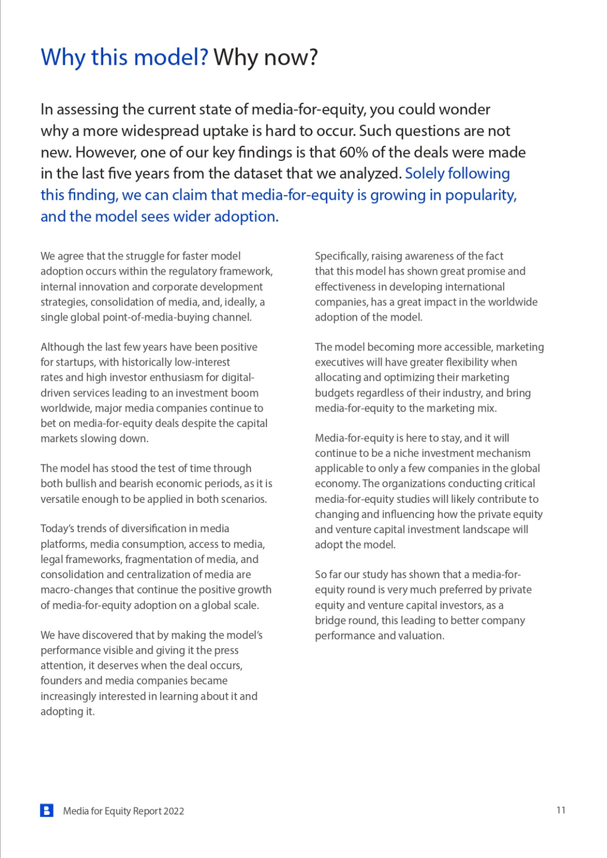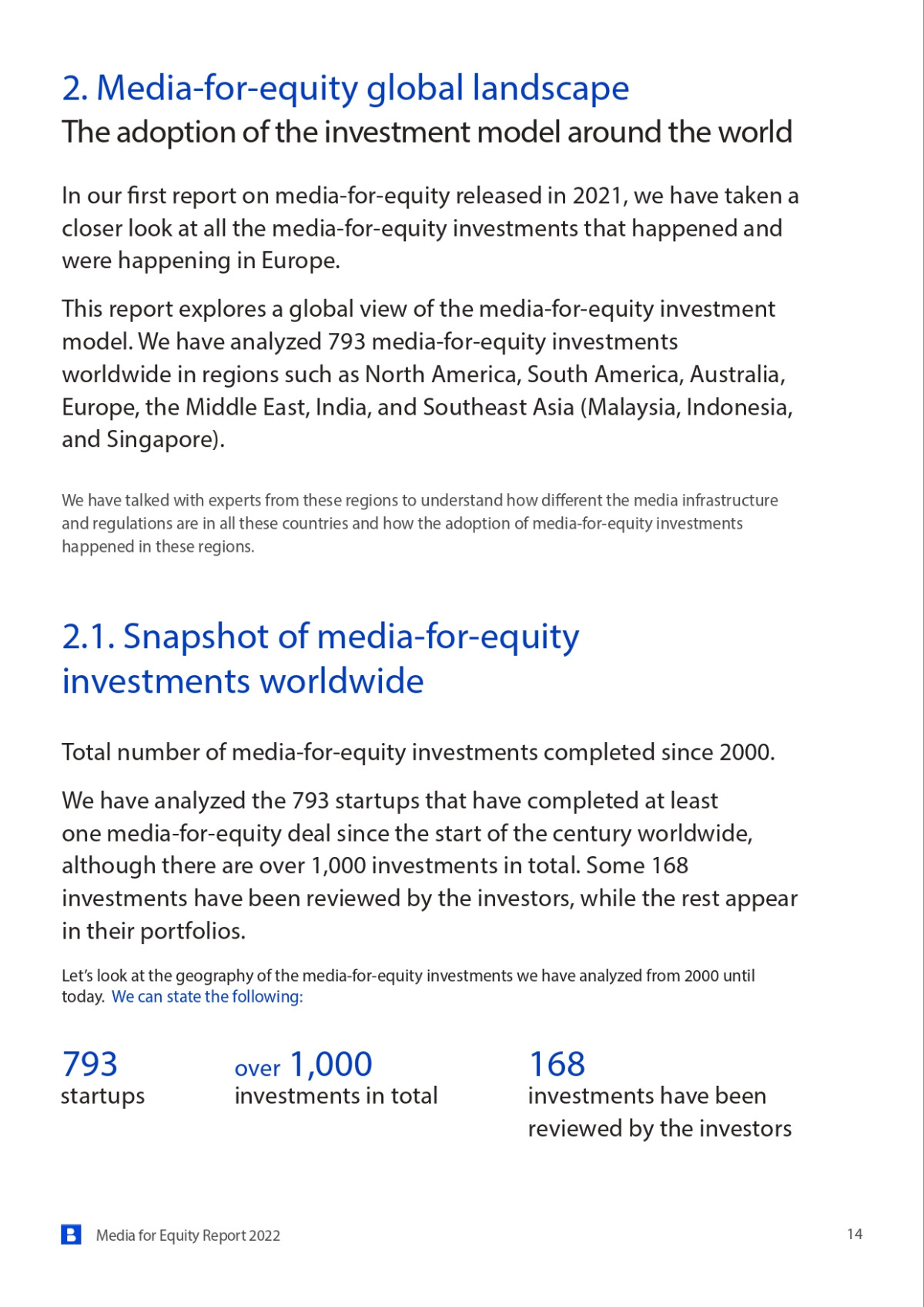 The Global Media-for-Equity Report is designed to benefit the broader investment space as we reveal global data-driven insights on media-for-equity investments. With the new findings, we hope to ignite further dialogue across the startup, investment, and media ecosystem with equal importance.