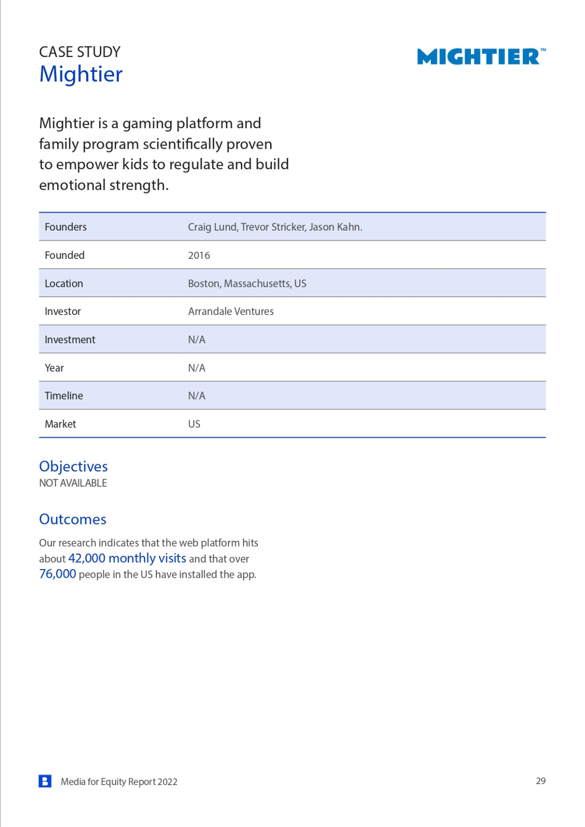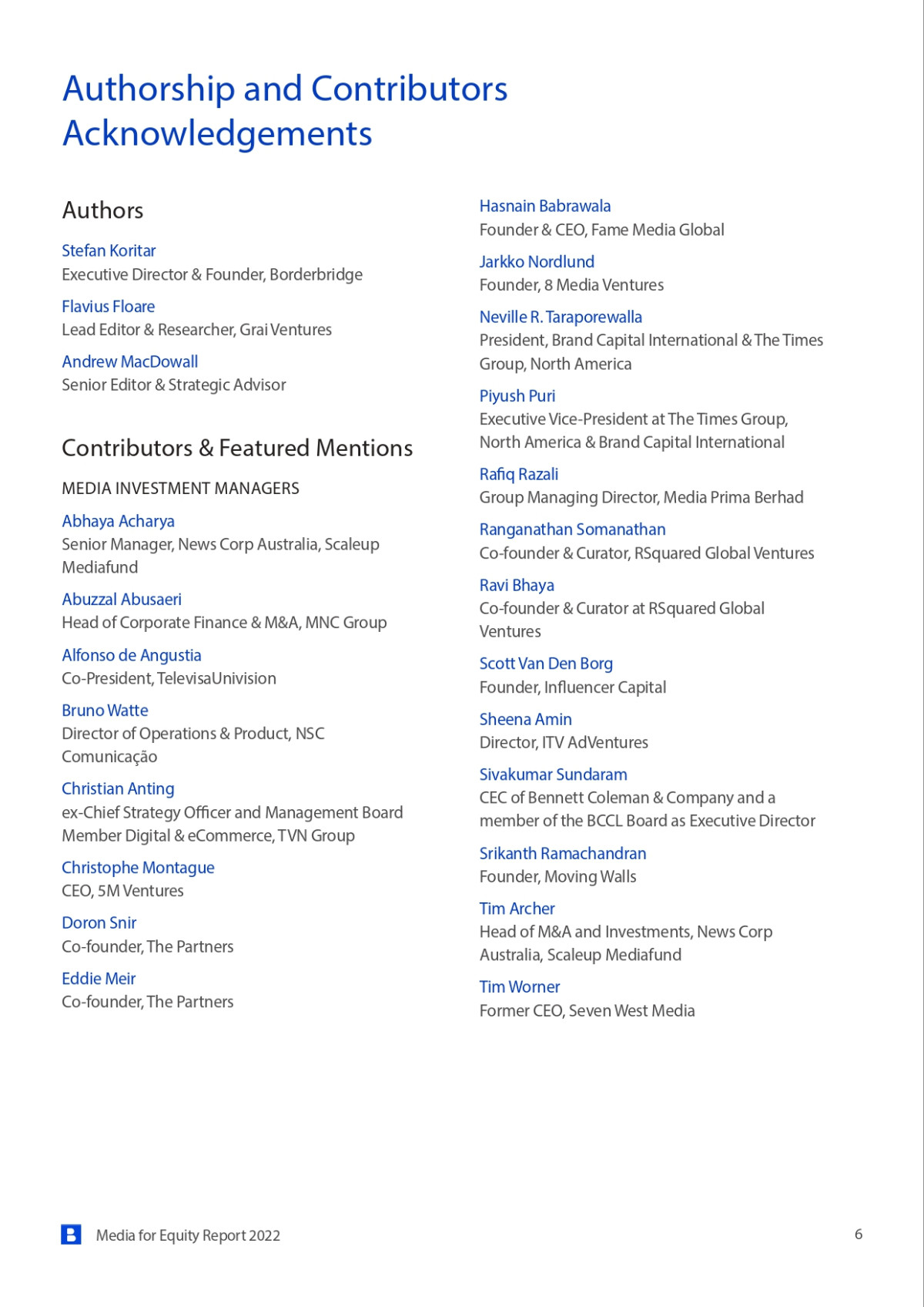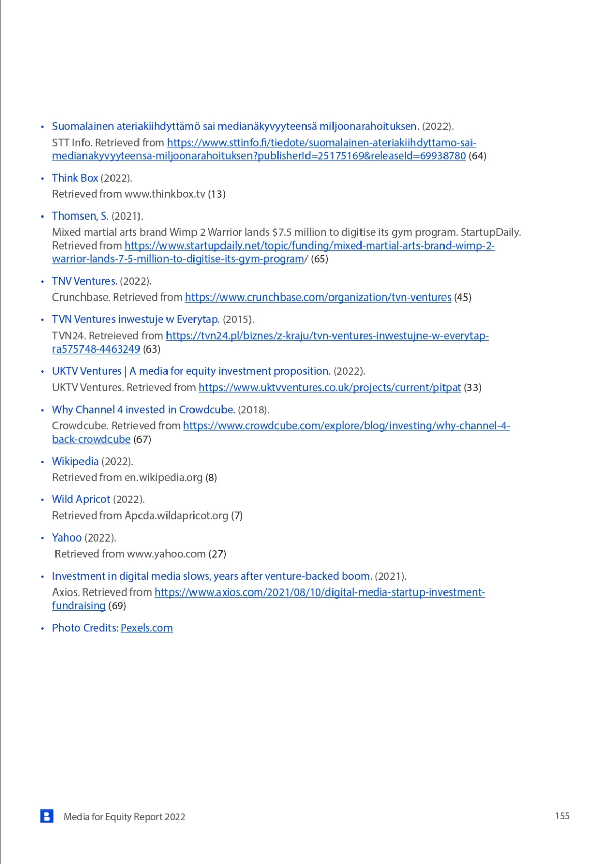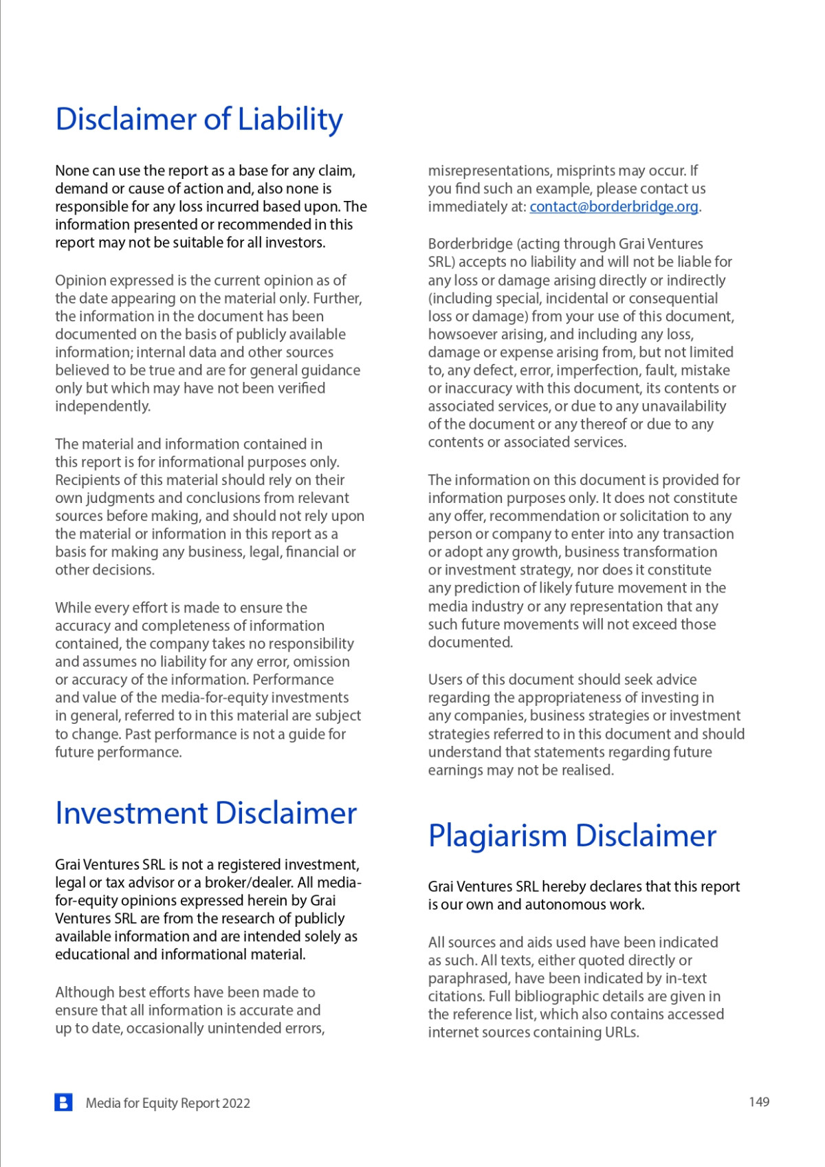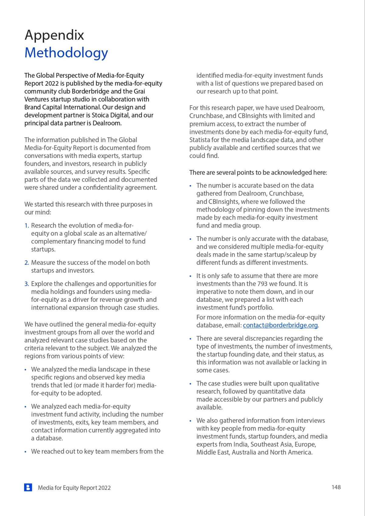 Finally, we hope the report will contribute to adding media-for-equity investments to the global investment landscape, give it the recognition it deserves, and demonstrate why all stakeholders need to contribute to the acceleration of the space.