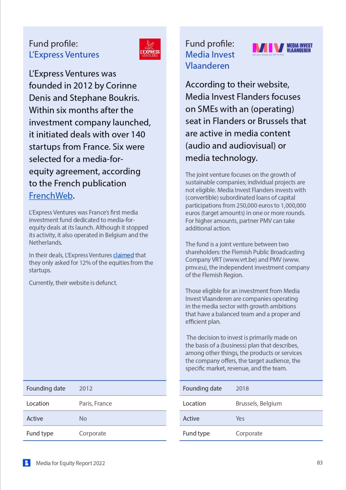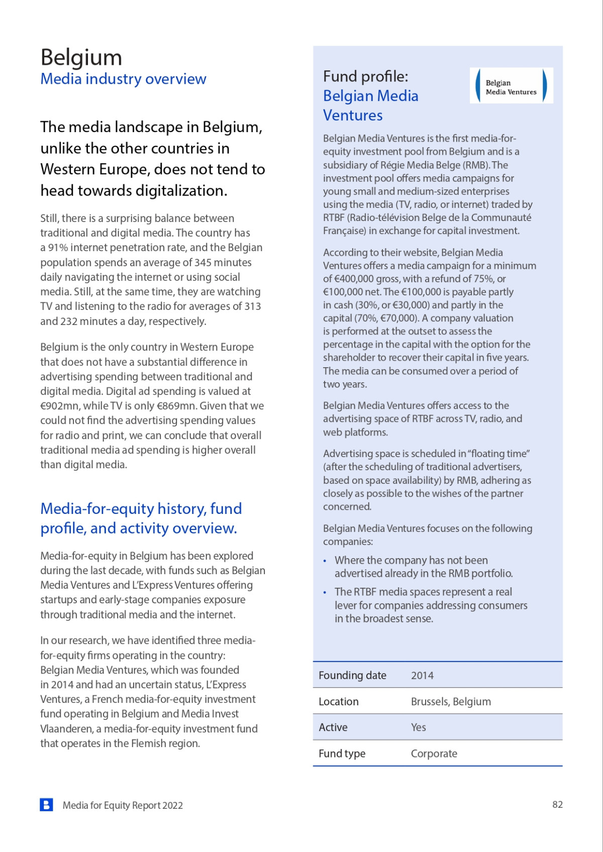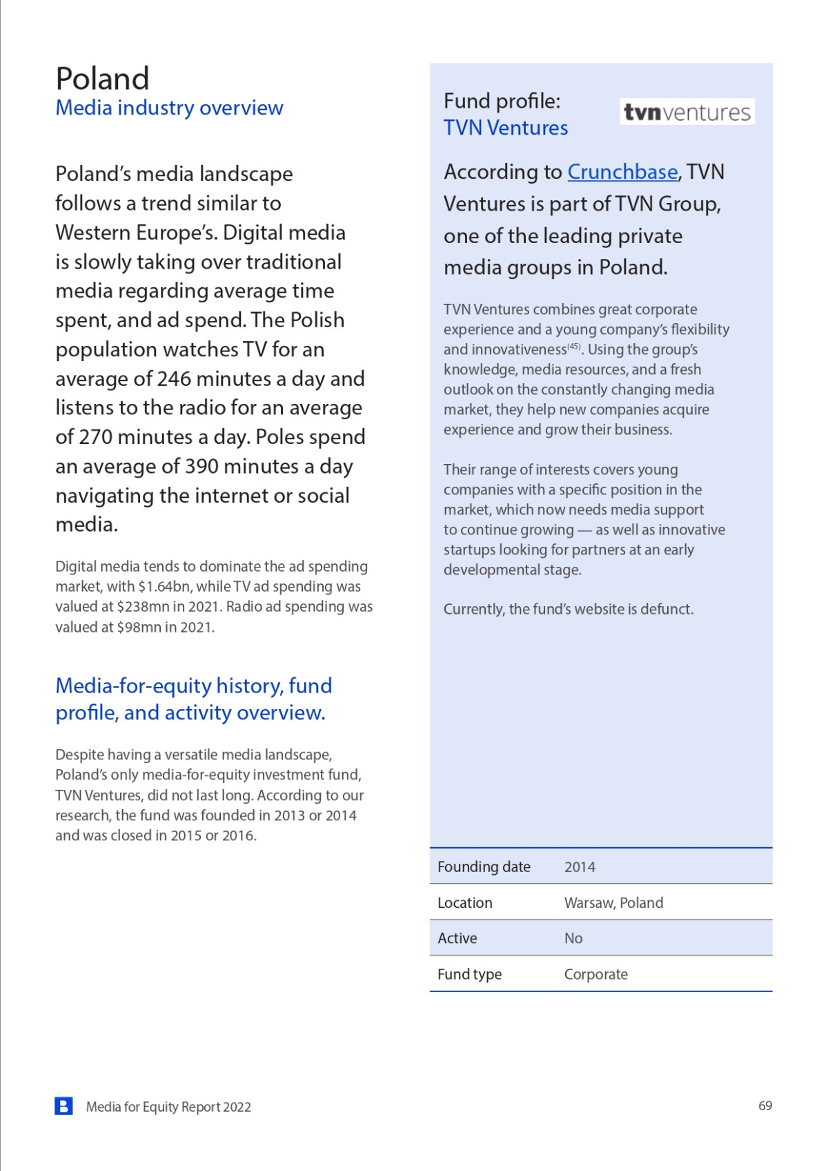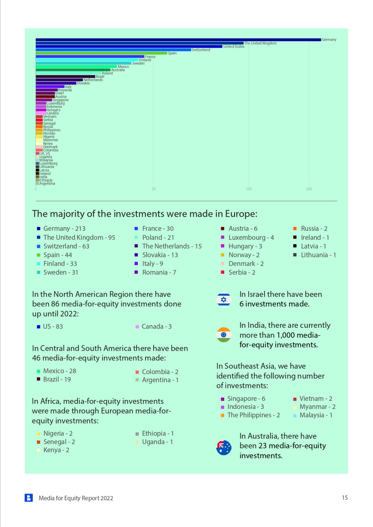 This report aims to highlight the media-for-equity investment funds and deals worldwide. We have partnered up with key organizations from specific global regions, and we have built an analysis of the infrastructure of a non-European media-for-equity deal.
