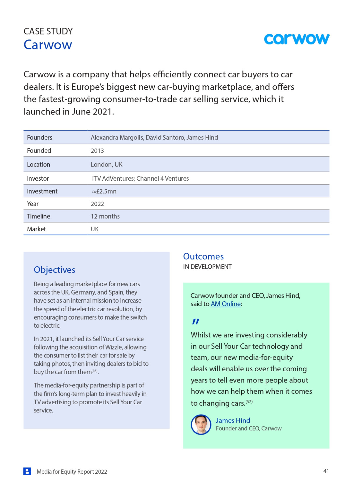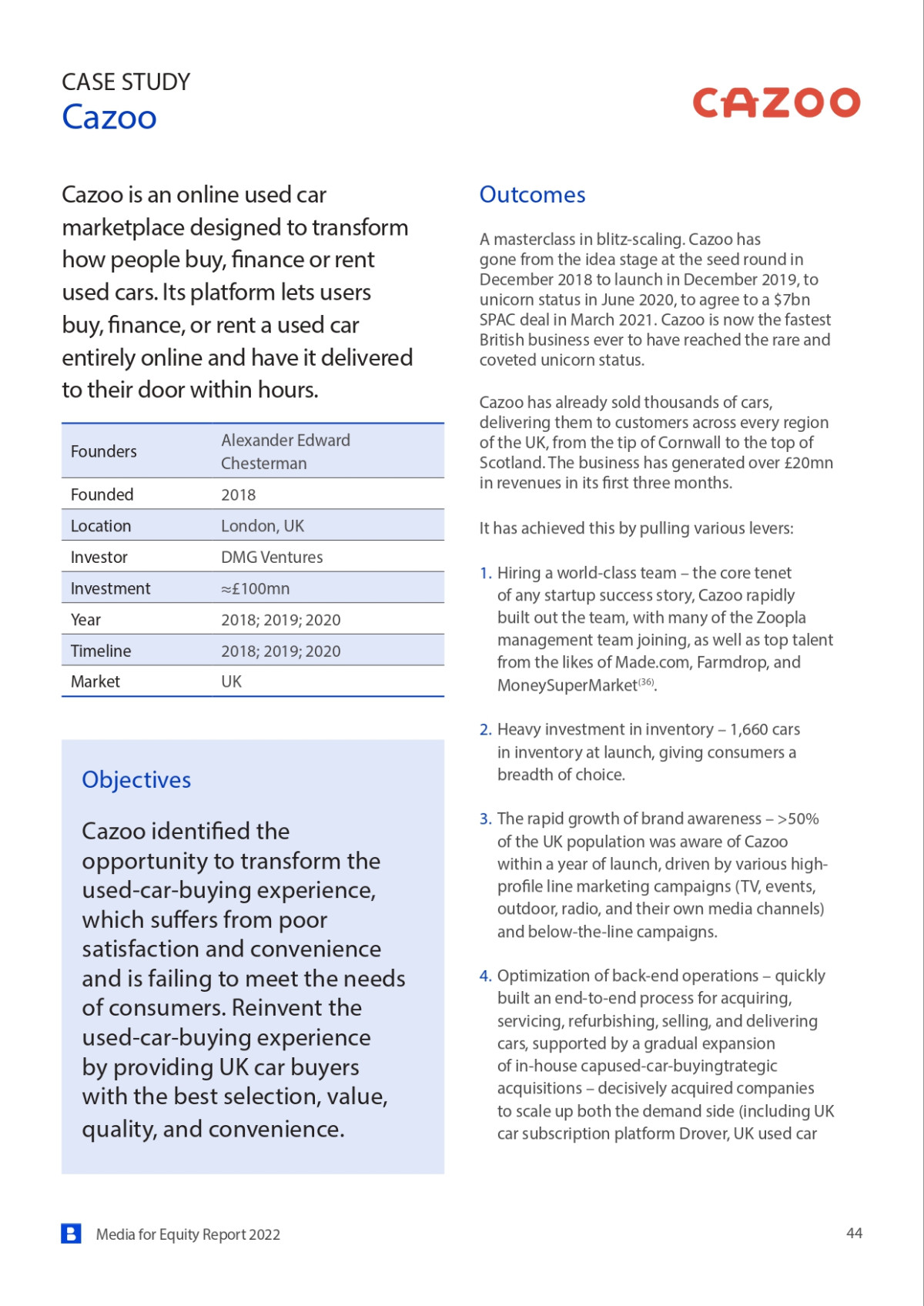 Additionally, the research showcases examples such as Cazoo, a UK online car retailer startup that has made a media-for-equity deal with investment fund DMG Ventures. A masterclass in blitz-scaling. Cazoo has gone from the idea stage at the seed round in December 2018 to launch in December 2019, to unicorn status in June 2020, to agree to a $7bn SPAC deal in March 2021. DMG Ventures invested in the company in the form of advertising in December 2019. Cazoo is now the fastest British business ever to have reached the rare and coveted unicorn status.