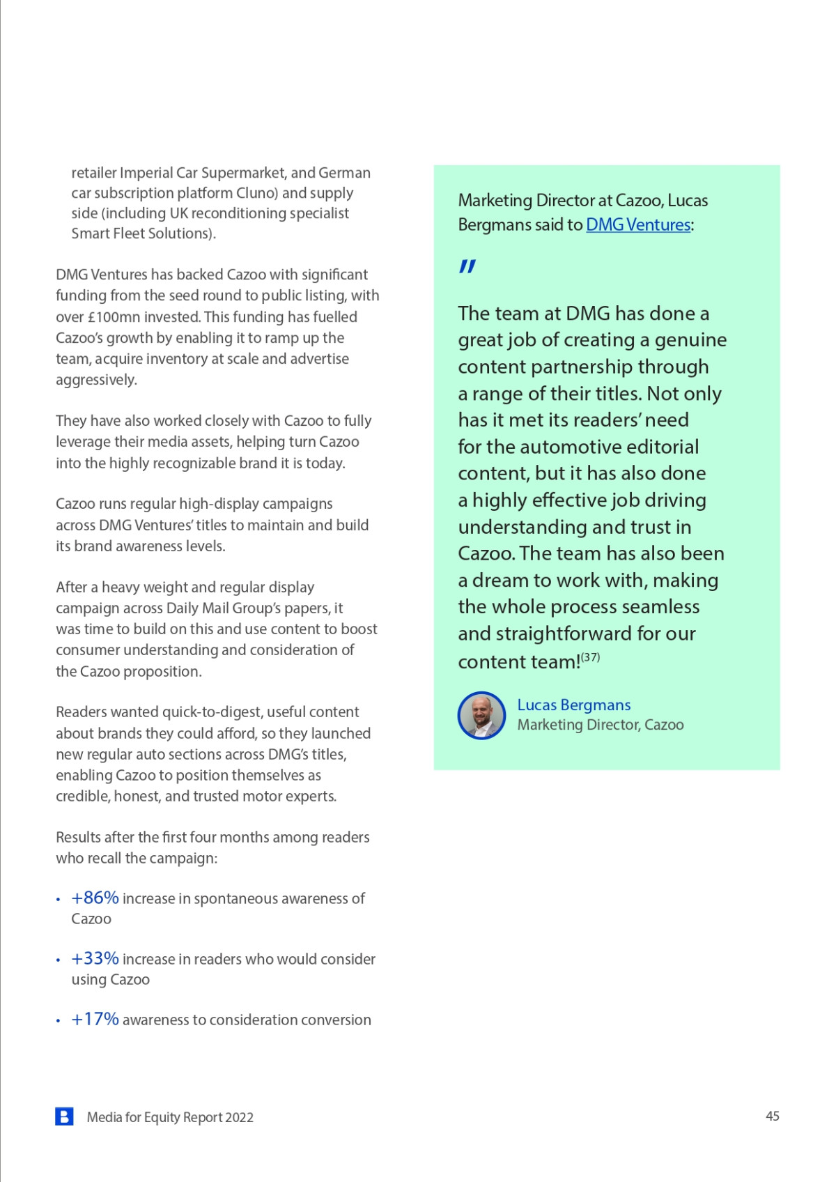 “The team at DMG has done a great job of creating a genuine content partnership through a range of their titles. Not only has it met its readers’ need for automotive editorial content, but it has also done a highly effective job driving understanding and trust in Cazoo. The team has also been a dream to work with, making the whole process seamless and straightforward for our content team!” - Lucas Bergmans, Marketing Director, Cazoo.