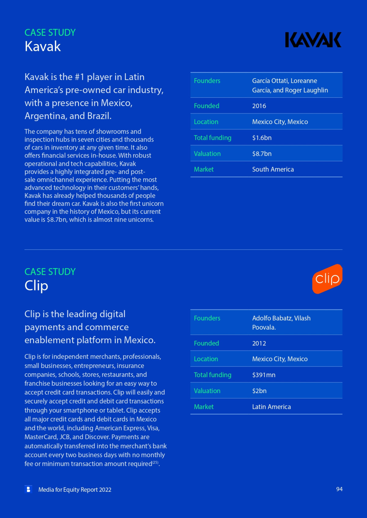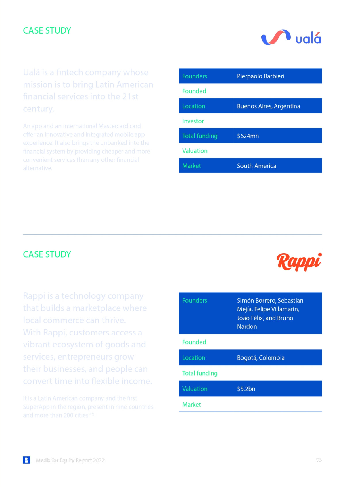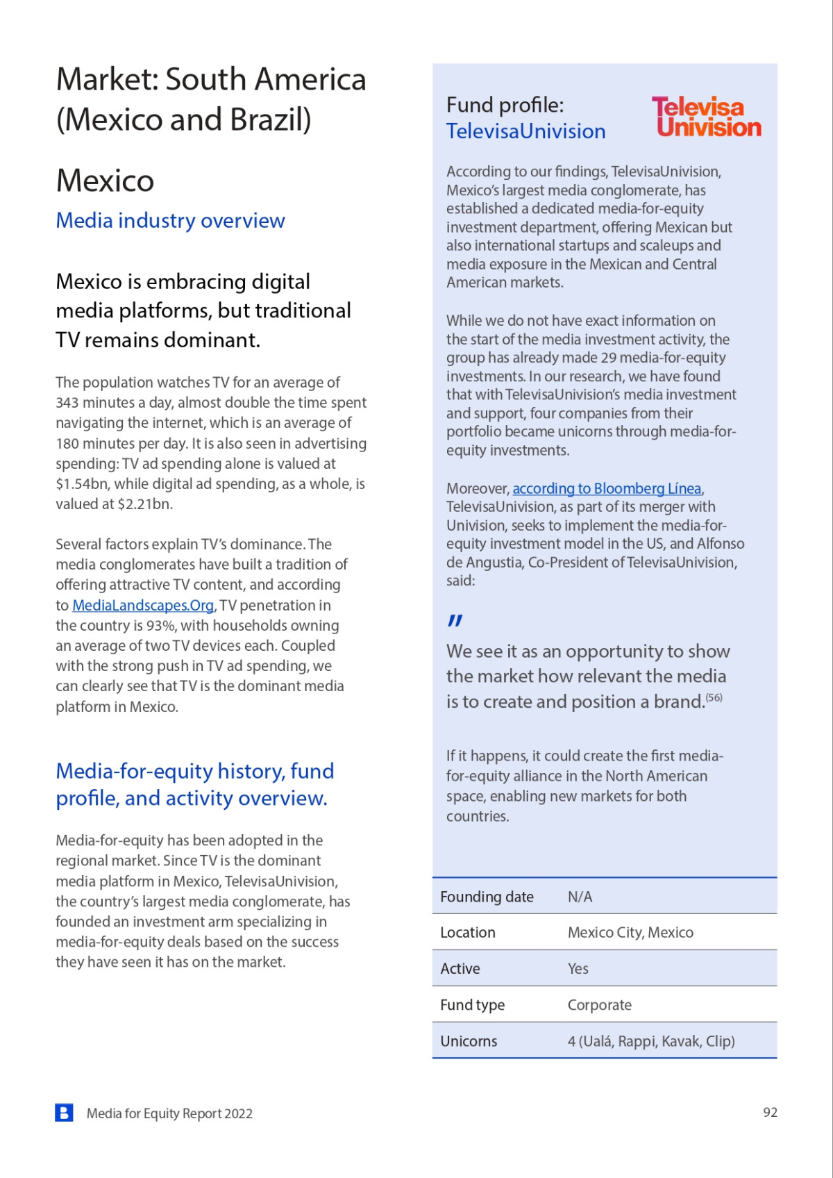 TelevisaUnivision, has the fastest-growing number of unicorns in a media-for-equity fund portfolio - from 2018 to 2022, the group’s media investment strategy generated 6 unicorns, Rappi, Ualá, Kavak, Konfio, QuintoAndar, and Clip.