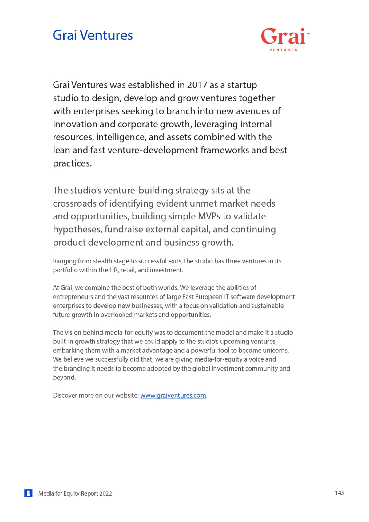 The 2022 global study by Grai Ventures and Borderbridge reveals insights into the worldwide adoption of media-for-equity as a driving force for direct-to-consumer companies' long-term growth sustainability; and for media groups interested in revenue diversification, a validated business model innovation. This report addresses these details by examining how the media-for-equity model works globally, regionally, and nationally.