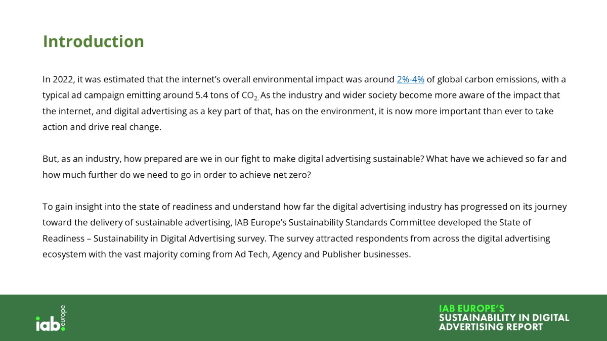 Pentru a obține o perspectivă asupra modului în care industria publicității digitale abordează sustenabilitatea și ce măsuri au luate companiile individuale, Comitetul pentru Standarde de Sustenabilitate al IAB Europa a dezvoltat sondajul State of Readiness – Sustainability in Digital Advertising. IAB Romania este representata in acest Comitet.