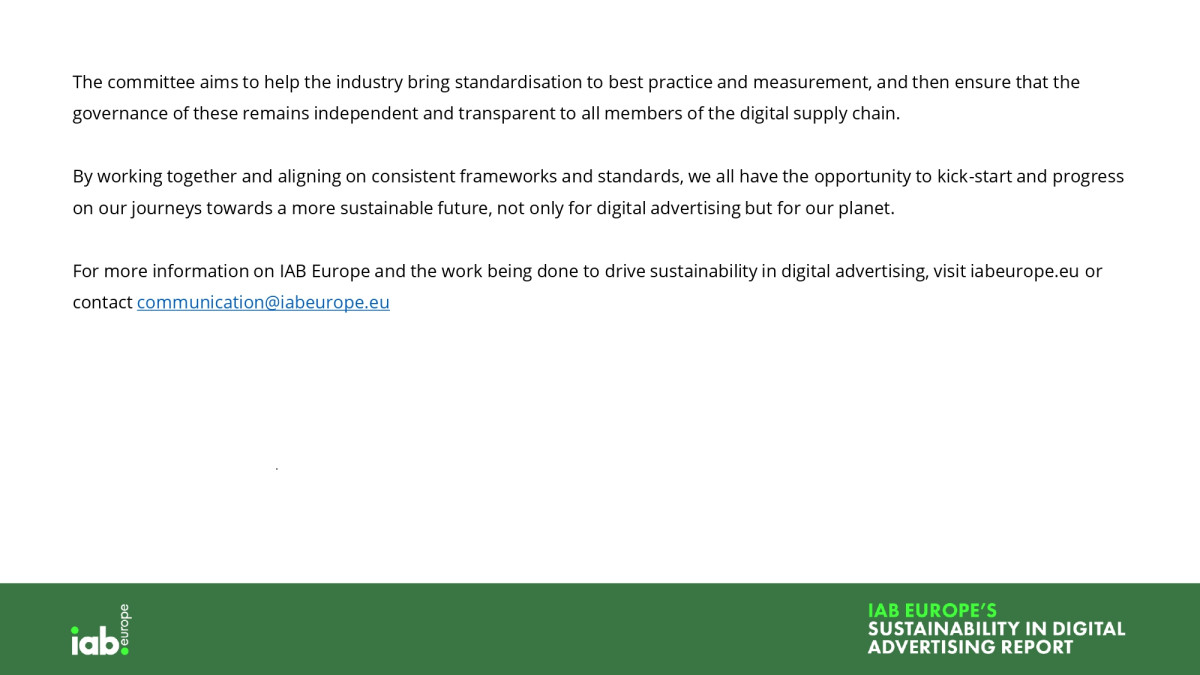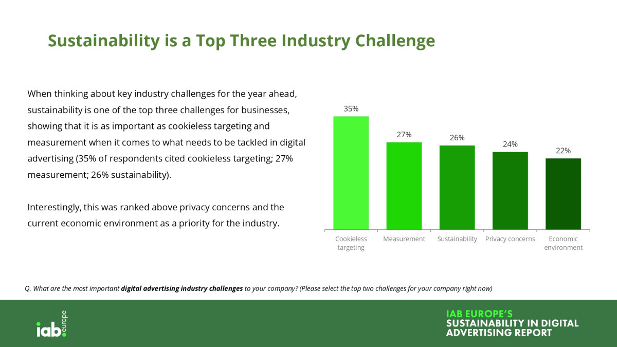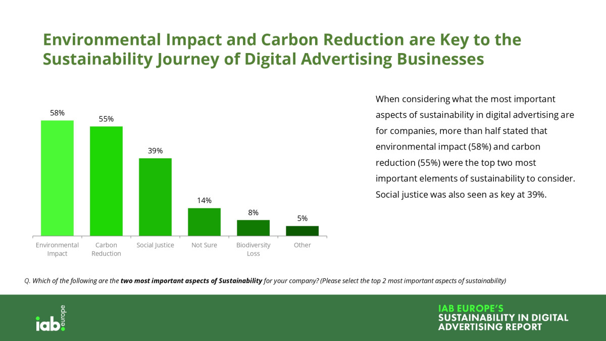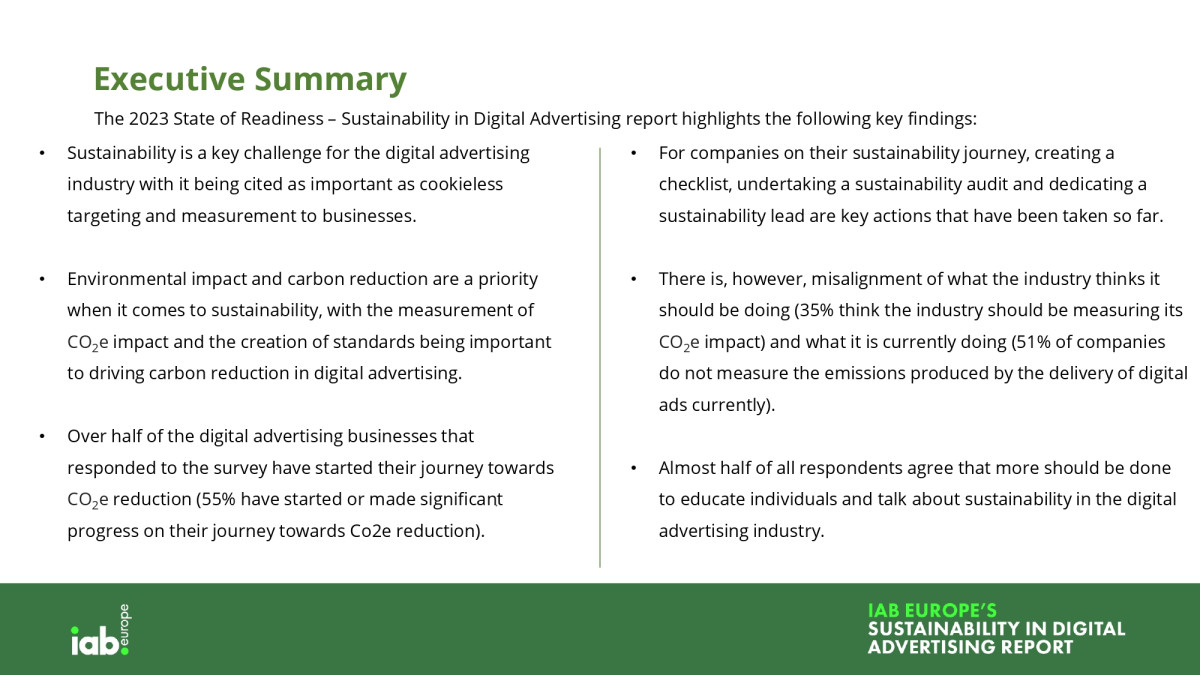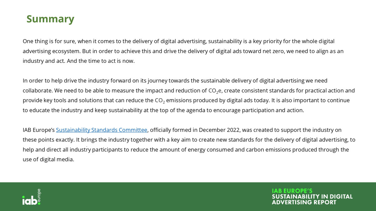 „Cu Europa lovită in 2022 de cea mai fierbinte vară înregistrată și de o multitudine de dezastre naturale la nivel mondial, este evident că momentul pentru a reduce emisiile de carbon este acum. Calculele arată că o campanie publicitară obișnuită emite aproximativ 5,4 tone de CO2, asa ca sustenabilitatea trebuie privită ca o procedură de operare standard.", declara Townsend Feehan CEO IAB Europe.