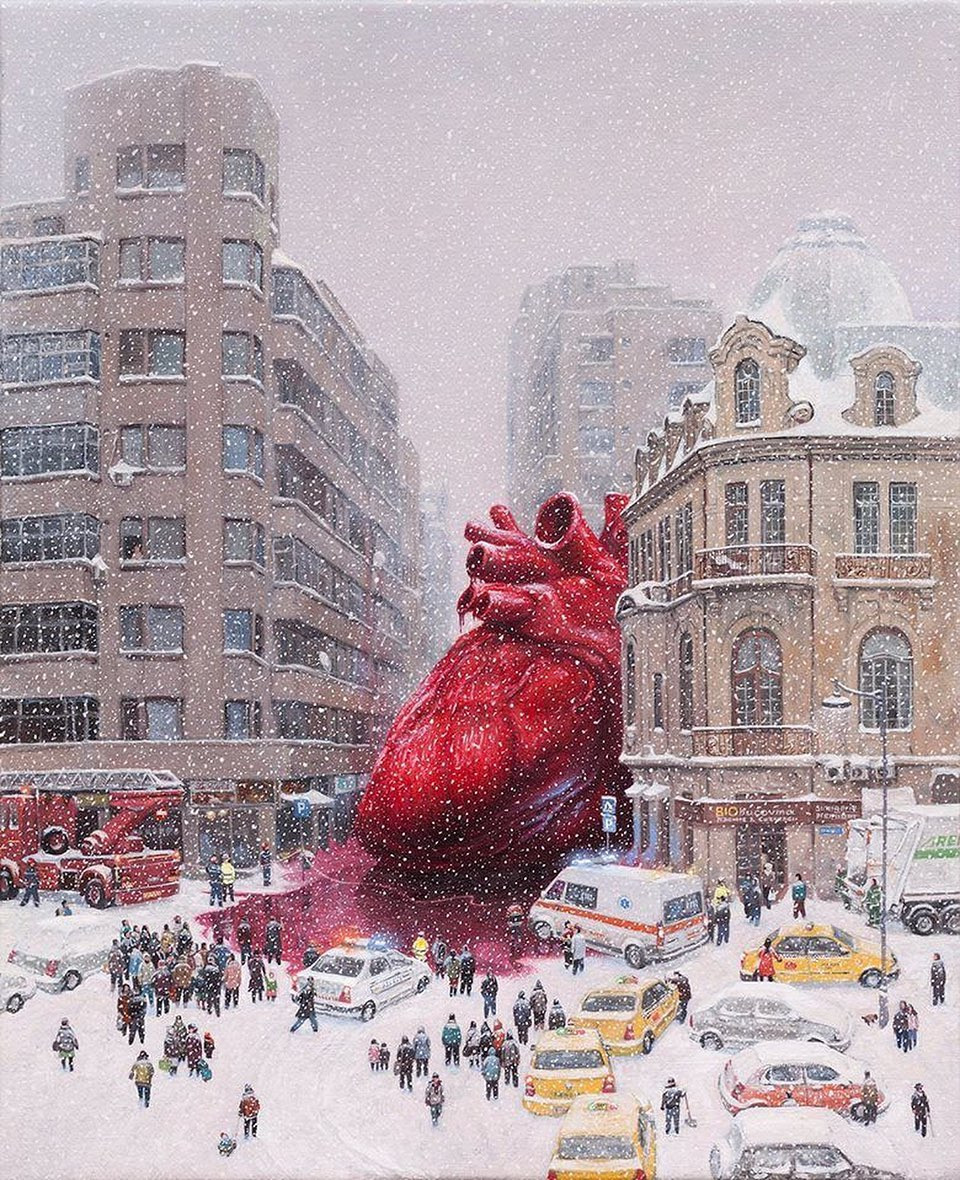 Am pornit de la o imagine reală cu un accident în Piața Amzei, în acel loc, unde, în urma unui vânt - Bucureștiul e fragil, pe butuci - a zburat un acoperiș. Și acel acoperiș a căzut în acel loc, unde eu am pictat inima. Era o bucată mare de tablă, contorsionată, neagră, în oraș. Nu părea să fi pățit cineva ceva, dar acest incident adunase toate autoritățile statului: poliția, salvarea, pompierii și gunoierii. Plus gură-cască din jur, cum se adună de obicei.