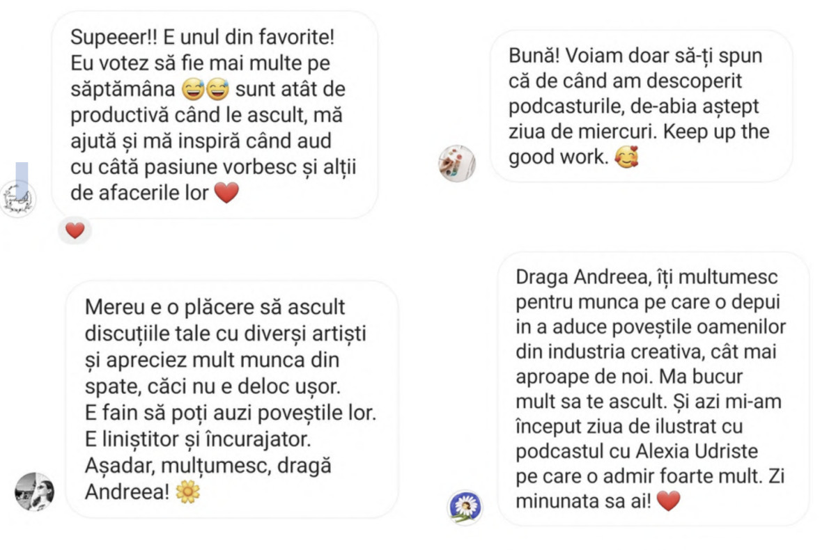 Această autenticitate se reflectă în faptul că ascultătorii, la rândul lor creativi sau oameni interesați de susținerea afacerilor locale, rezonează cu poveștile spuse: “Fix prin asta am trecut și eu!” mi se spune în comentarii sau cel mai des în mesaje private pe conturile de social media.