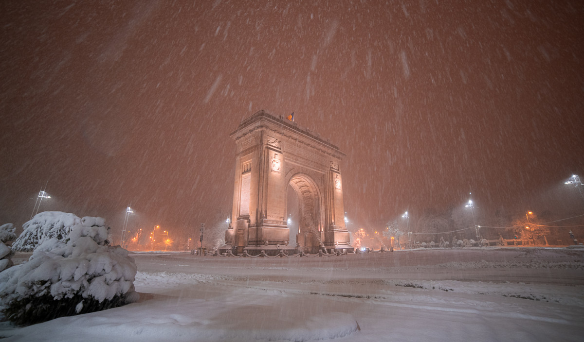 Aceasta rămâne una dintre imaginile mele preferate din seria de iarnă din București. A fost surprinsă în 2017, când ningea atât de puternic încât asfaltul era la câteva minute ce treceau plugurile. Am reușit să surprind zona Arcului de Triumf cu zăpada neatinsă, într-o liniște parcă deplină.