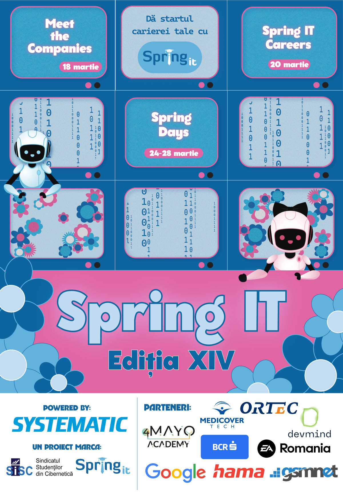Primăvara aceasta aduce o nouă ediție a proiectului Spring IT! Evenimentul, ajuns la cea de-a XIV-a ediție, este organizat de Sindicatul Studenților din Facultatea de Cibernetică, Statistică și Informatică Economică (SiSC) și va avea loc între 11 și 28 martie.