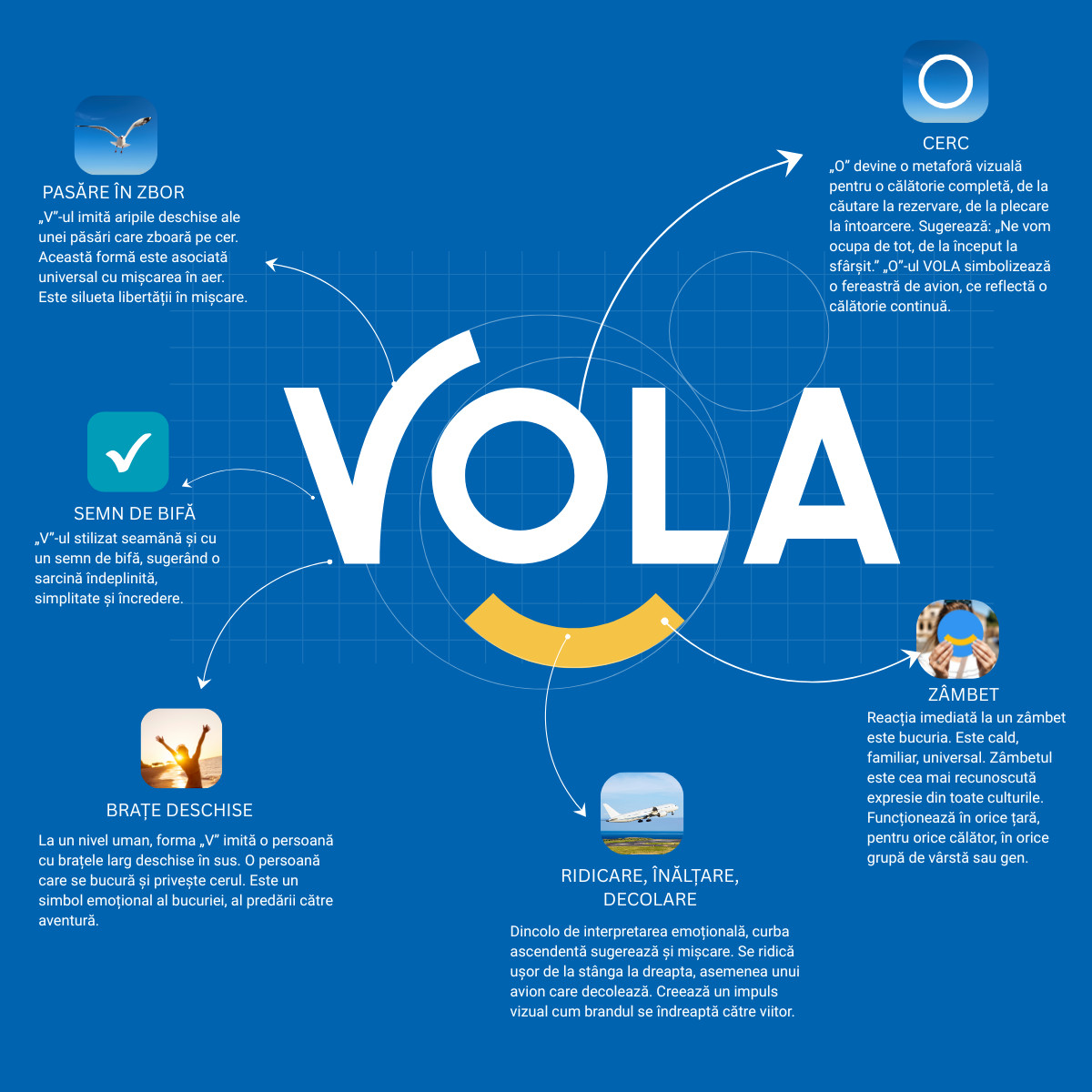 Noul logo Vola este o reinterpretare rafinată a identității vizuale consacrate, ce păstrează discret forma familiară a literei “V”. Designul actualizat reflectă evoluția brandului, mișcarea ascendentă, ce menține esența zborului și a libertății de mișcare, dar într-o formă adaptată noii ere digitale. Un detaliu distinctiv este linia curbată galbenă, care transmite apropierea față de utilizatori și bucuria călătoriilor. De asemenea, renunțarea la extensia locală „.ro” reprezintă un pas spre o identitate de brand universală și adaptată contextului digital internațional.