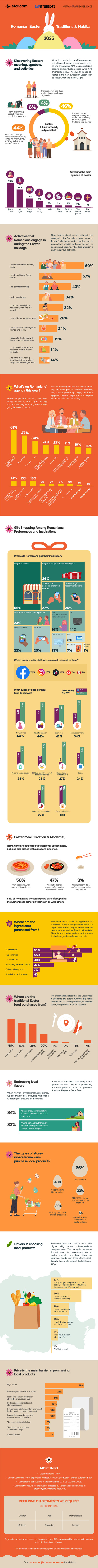 83% dintre români se ocupă personal de pregătirea mesei de Paște, iar principalele destinații pentru cumpărături rămân hipermarketurile, supermarketurile și piețele locale. Produsele locale au rămas în topul preferințelor - 84% au cumpărat de la producători locali cel puțin o dată, iar 83% plănuiau să o facă din nou în acest an.
