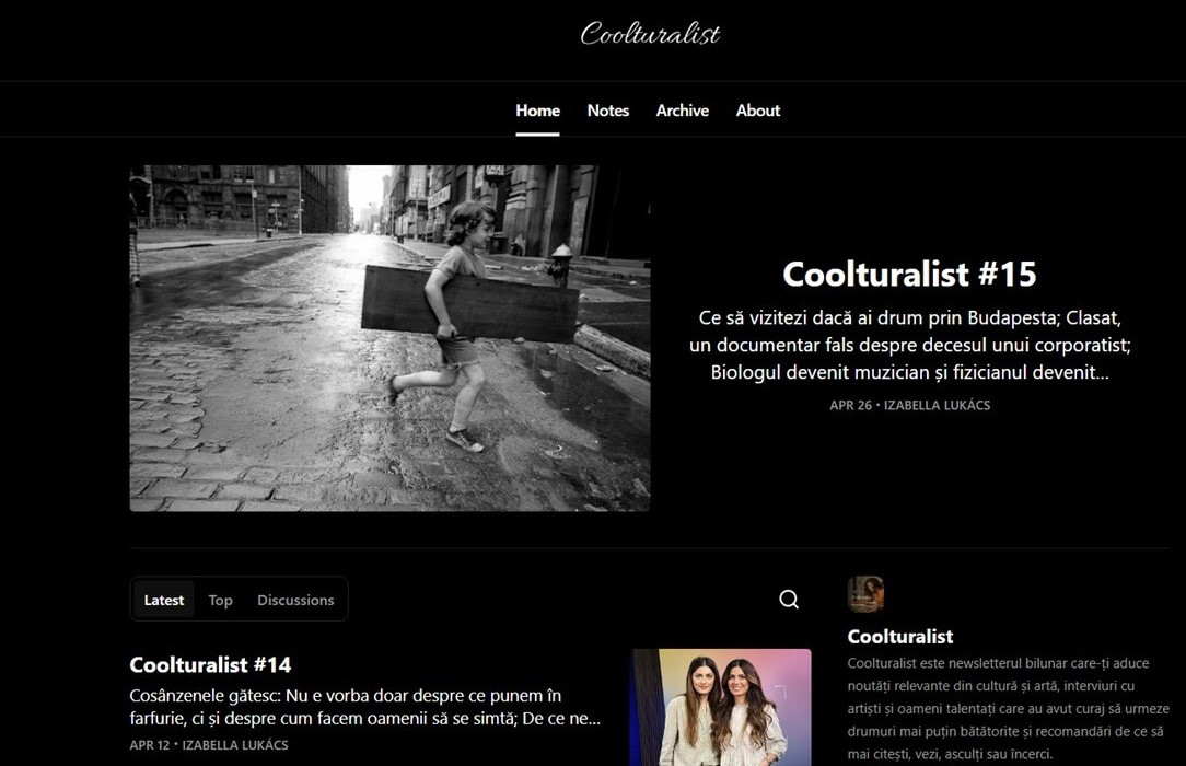 Vorbim mai multe în continuare cu Izabella Monica Lukács despre Coolturalist, care vine către abonați cu noutăți și recomandări culturale artistice și cu interviuri cu artiști și creatori de conținut.