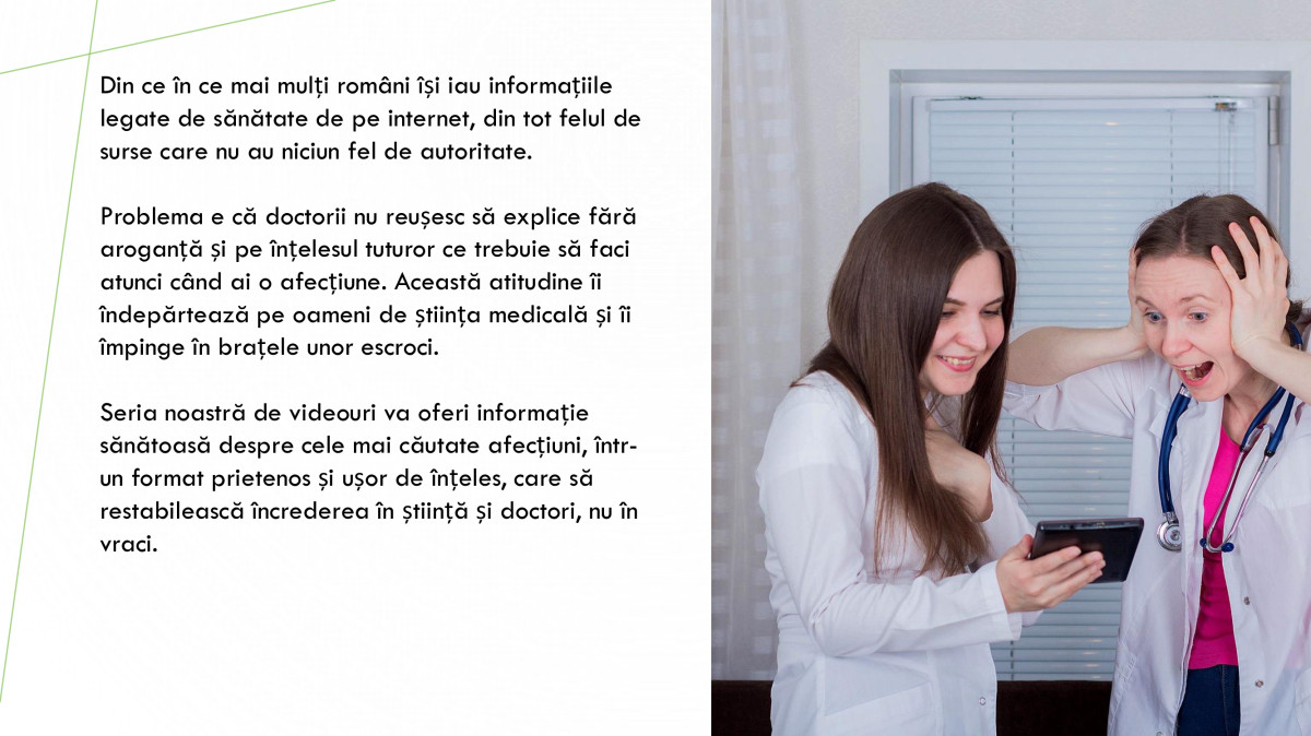 Seria noastră de videouri va oferi informație sănătoasă despre cele mai căutate afecțiuni, într-un format prietenos și ușor de înțeles, care să restabilească încrederea în știință și doctori, nu în vraci.