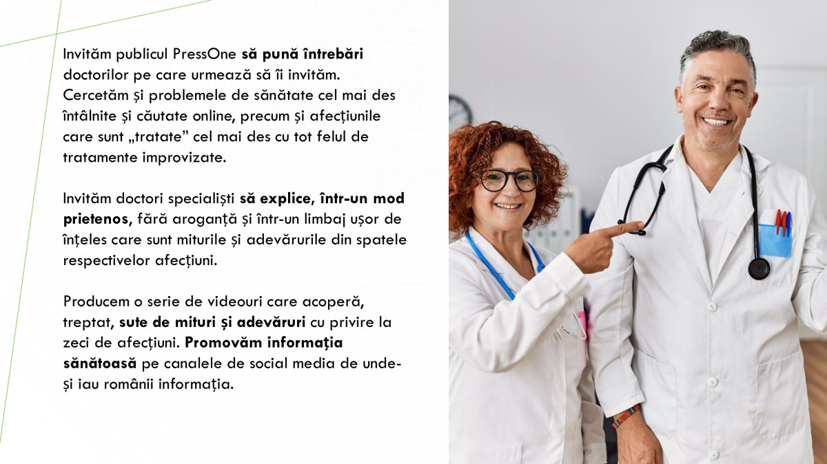 Format interactiv: invităm publicul PressOne să pună întrebări doctorilor pe care urmează să îi invităm. Cercetăm și problemele de sănătate cel mai des întâlnite și căutate online, precum și afecțiunile care sunt „tratate” cel mai des cu tot felul de tratamente improvizate.