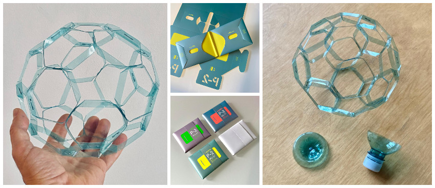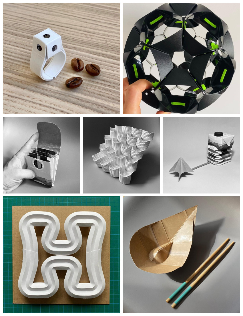 Eu, personal, m-am concentrat pe refuncționalizarea unor deșeuri comune provenite din zona ambalajelor: hârtie/carton, tetrapak (celuloză + polietilenă + aluminiu) și plastic PET. Proiectele rezultate acoperă zone diferite ale designului de produs: accesorii personale (șapcă, portofele, port carduri, inele, masti), suporturi de telefon, mobilier – taburet, masă de cafea, jucării (minge, kendama, mașinute), accesorii de bucătarie, recipiente pentru streetfood, obiecte de birou, structuri elastice, conectori pentru structuri, brațe robotice biomimetice.