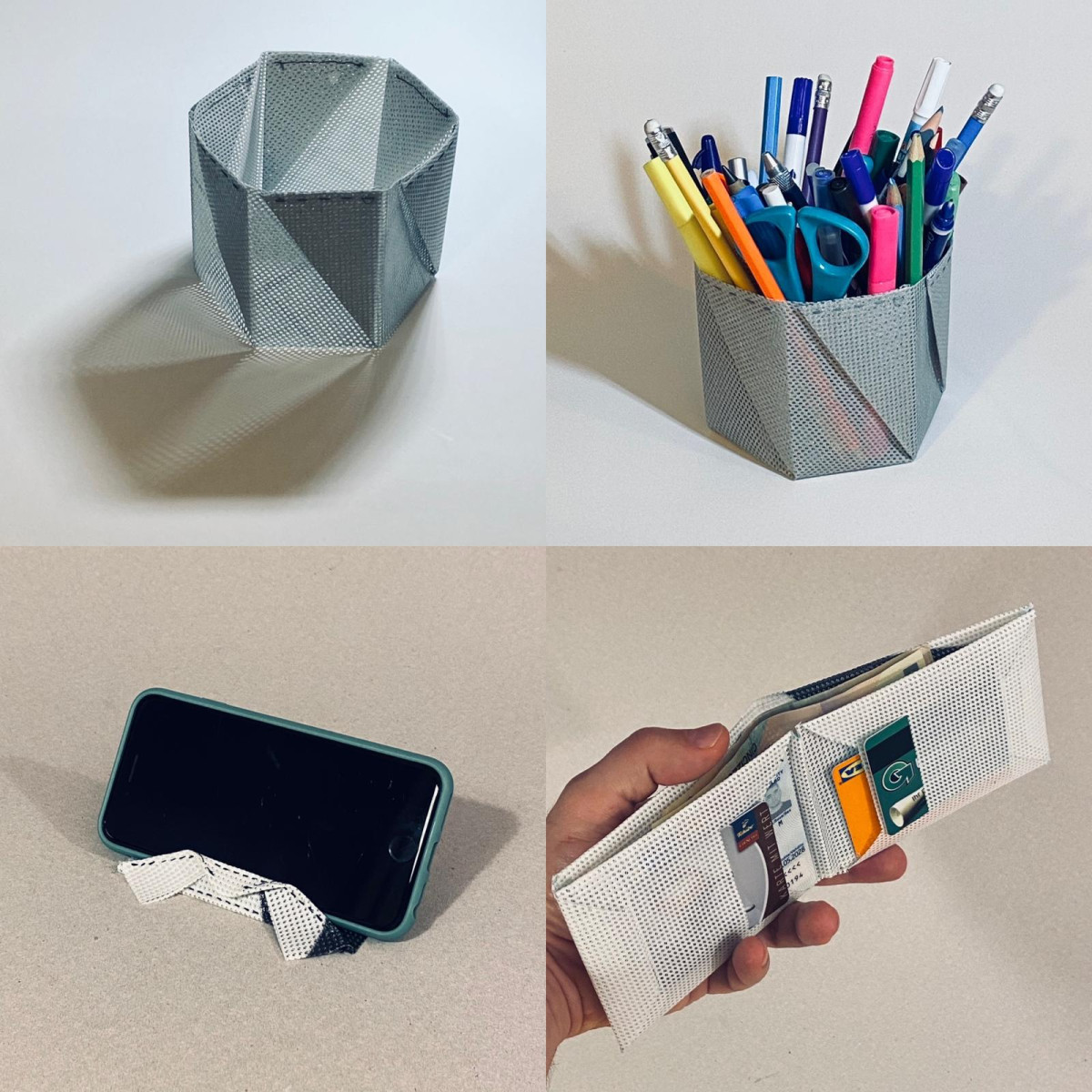 Am realizat, în urmă cu mai mulți ani, un proiect de genți din bannere publicitare, care a fost produs în serie. Recent, am creat trei obiecte (portofel, suport de creioane și suport de telefon) prin reutilizarea mesh-urilor publicitare.
