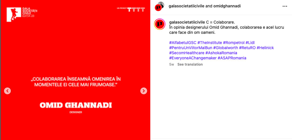 Omid este unul dintre ambasadorii Galei Societății Civile 2025, litera C, de la Colaborare, în #AlfabetulGSC.