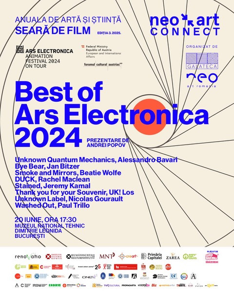 Vineri, 20 iunie 2025, începând cu ora 17:30, la Muzeul Național Tehnic „Dimitrie Leonida”, publicul este invitat la o seară dedicată artei digitale și animației contemporane: „Best of Ars Electronica Animation Festival 2024”, în premieră în România, urmată de un artist talk cu două invitate speciale din cadrul Neo Art Connect (NAC) 2025, artistele germane Andrea Zang și Hella Frowein-Hagenah.