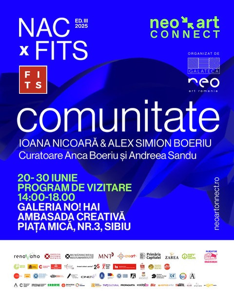 În rețeaua națională NAC se continuă parteneriatul cu FITS, la Sibiu, în cadrul căruia, la Galeria NO!HAI și în Piața Mică propunem o instalație interior-exterior, cu tema Comunitate. Îîn galerie publicul poate descoperi o instalație interactivă, creată de unul dintre bursierii NAC din acest an, respectiv Ioana Nicoară, in dialog cu instalația din spațiul public, creată de Alex Simion Boeriu.