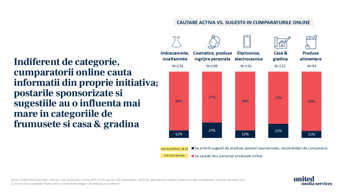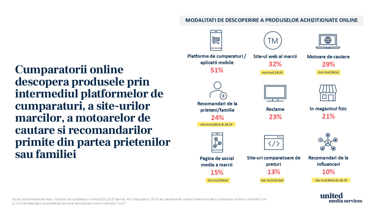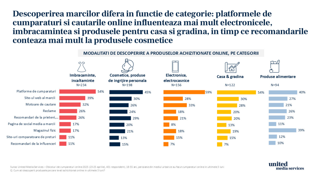 „Am descoperit că jumătate dintre cumpărătorii online fac achiziții săptămânal, în principal în categoriile beauty și îngrijire personală. Descoperirea brandurilor începe pe platformele de cumpărături, site-urile de brand, motoarele de căutare și prin recomandări – variind, însă, în funcție de categorie. Românii rămân foarte influențați de prețurile propuse de retaileri, de dorința de a găsi rapid ceea ce caută și de a finaliza la fel de repede achiziția, dar ne bucurăm să observăm cum, treptat, experiența de utilizare devine un criteriu tot mai important în alegere”, a declarat Anca Băcăianu, Head of Strategy and Research la United Media Services.