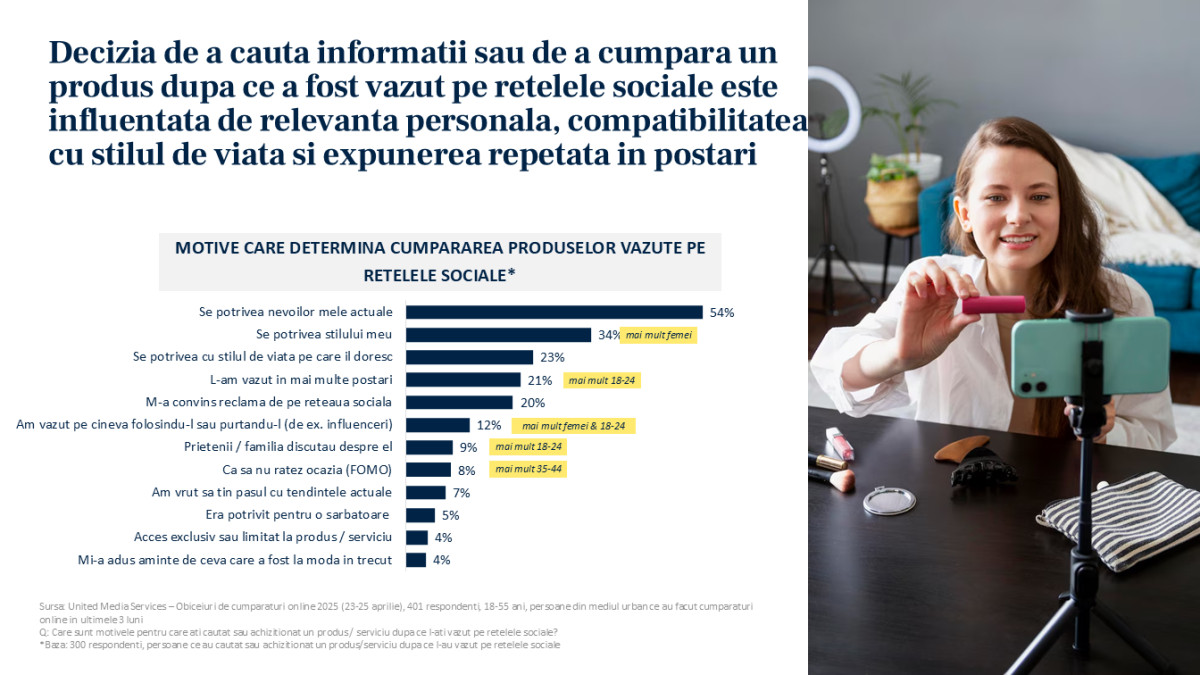 Cumpărătorii preferă, de regulă, să își realizeze singuri cercetarea privind produsele. Cele mai importante criterii sunt: dacă produsele corespund nevoilor lor (54%), potrivirea cu stilul personal (34%), alinierea cu un anumit stil de viață aspirational (21%) și expunerea repetată la postări (20%). Deși majoritatea preferă să își facă propria documentare, fără a se baza pe influenceri, aceștia rămân relevanți în categorii precum beauty, home & garden și electronice, unde inspirația vizuală contează.