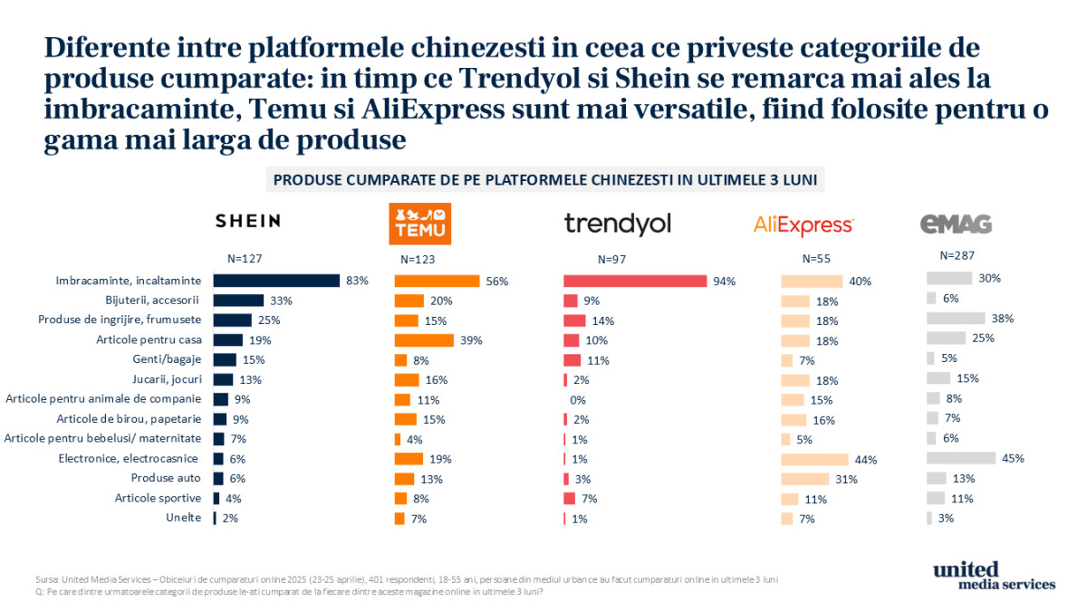 În paralel, platformele chinezești câștigă tot mai mult teren în preferințele românilor, mai ales în categoriile de îmbrăcăminte și produse cu preț redus. În ultimele trei luni, 61% dintre respondenți au făcut cel puțin o achiziție de pe una dintre aceste platforme, atrași în principal de prețurile accesibile (74%) și de diversitatea produselor. Aceste platforme devin o alternativă viabilă în zonele sensibile la preț, fără a diminua, însă, relevanța platformelor locale, care rămân preferate în categoriile în care experiența de utilizare și încrederea sunt esențiale.