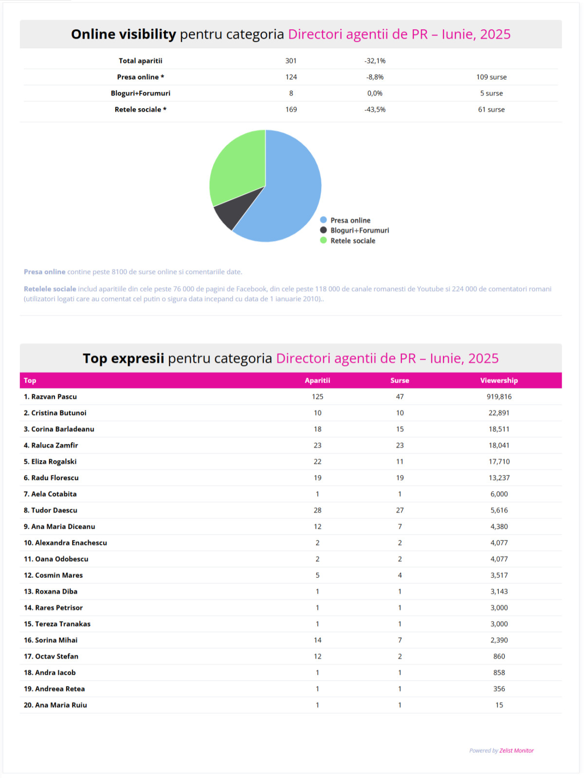 In topul celor mai vizibili directori ai agentiilor de PR in online si pe Facebook din iunie efectuat de ZeList si publicat lunar de IQads, Razvan Pascu ocupa locul intai (919,816 de views). Pe locul al doilea se afla Cristina Butunoi (22,891 de views) dupa ce a urcat saptesprezece pozitii fata de luna precedenta. Corina Barladeanu (18,511 viewership) ocupa locul al treilea.