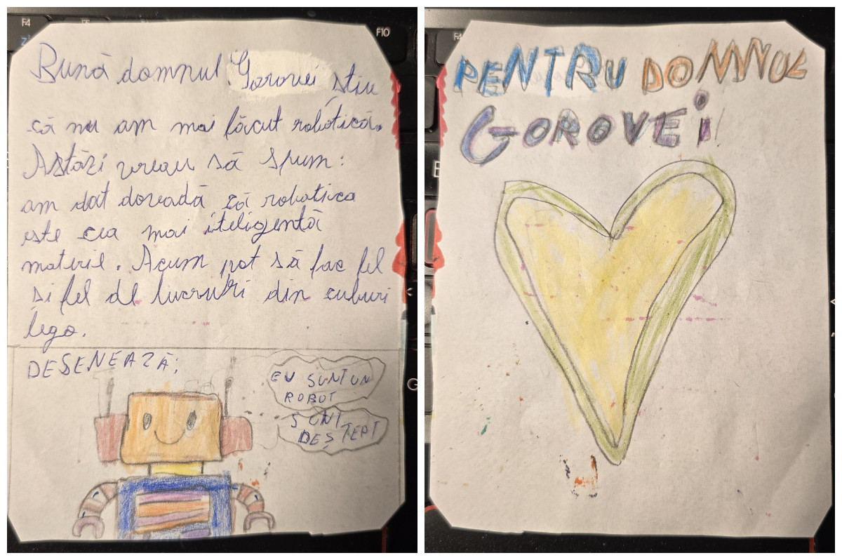 În plus, acum nu mai sunt un necunoscut în Vasilați, sunt „Domnu’ de robotică”. Și când copiii vin la curs și mă îmbrățișează sau îmi dedică desene, mă topesc.
