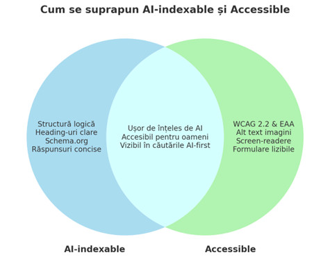 În fapt, cele două dimensiuni nu merg în paralel, ci se întrepătrund. Un site optimizat pentru accesibilitate este, de fapt, și mai ușor de interpretat de AI. Iar asta îl face mai vizibil în căutările viitorului, acolo unde algoritmii nu doar indexează, ci înțeleg și redau informația într-un mod conversațional și imediat.
