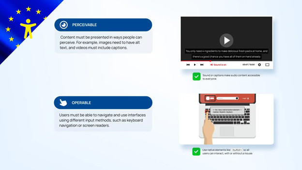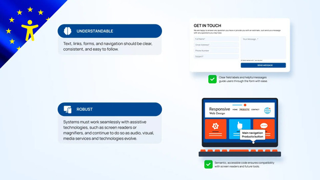 European Accessibility Act (EAA), aplicabil din iunie 2025, se adresează sectoarelor digitale precum e-commerce, fintech, transport și telecom și cere respectarea principiilor POUR (perceivable, operable, understandable, robust) în scopul asigurării accesului egal tuturor utilizatorilor. Neconformitatea poate aduce amenzi între 5.000 și 250.000 € pe încălcare, dar conformarea oferă acces la peste 87 de milioane de persoane cu dizabilități, experiențe digitale mai bune și beneficii de SEO. Poți vedea multiple căi de a-ți armoniza site-ul cu EEA în ghidul elaborat de experții noștri în accesibilitate.