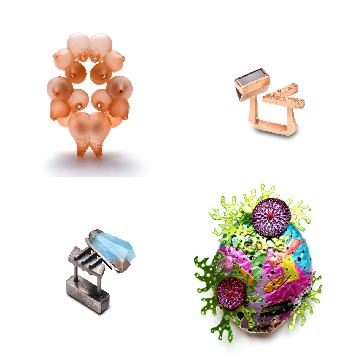 În acest an, Romanian Jewelry Week este onorată de prezența unor expoziții colective de prestigiu internațional, cu istorii și experiențe foarte diferite, dar toate unite prin pasiunea pentru bijuteria contemporană. Unele dintre ele sunt repere consacrate în domeniu, precum SCHMUCKmuenchen, forum de referință în lumea bijuteriei de peste șaizeci de ani, considerat cel mai important punct de întâlnire al experților și cunoscătorilor, sau The International Jewellery Competition – evenimentul central al Legnica Jewellery Festival SILVER, organizat încă din 1979 de Galeria de Artă din Legnica, una dintre cele mai vechi inițiative europene dedicate susținerii creativității la granița dintre artă, meșteșug și design. Altele colective conturează perspective proaspete, așa cum s-a întâmplat la Slovenian Jewelry Week 2025, unde tema „Energy, Joy, and Harmony” a explorat bijuteria ca răspuns artistic la provocările lumii contemporane. Alături de acestea, Romanian Jewelry Week reunește și colective diverse și inovatoare, precum AdOC, Global Creative Graduate Show, Plus One Collective, Assamblage Contemporary School, Institute Jeanne Toussaint – Belgium, Precious Collective, The Sense of Beauty Gallery și Unnecessary Jewelry.