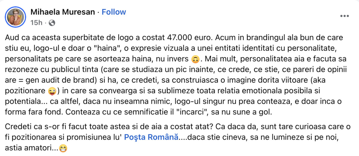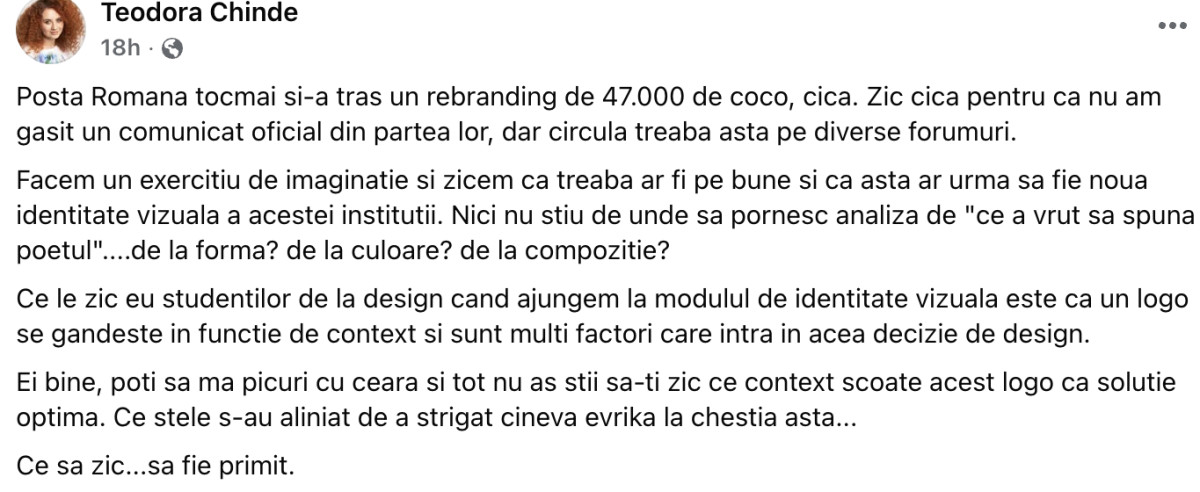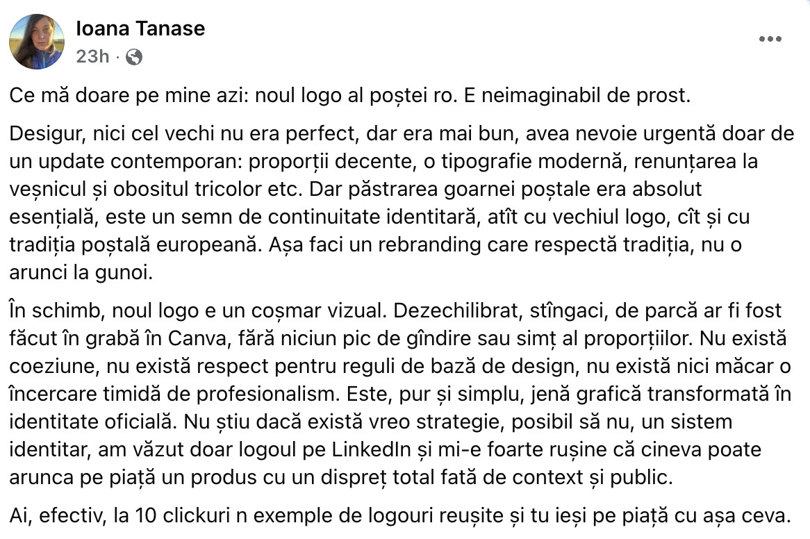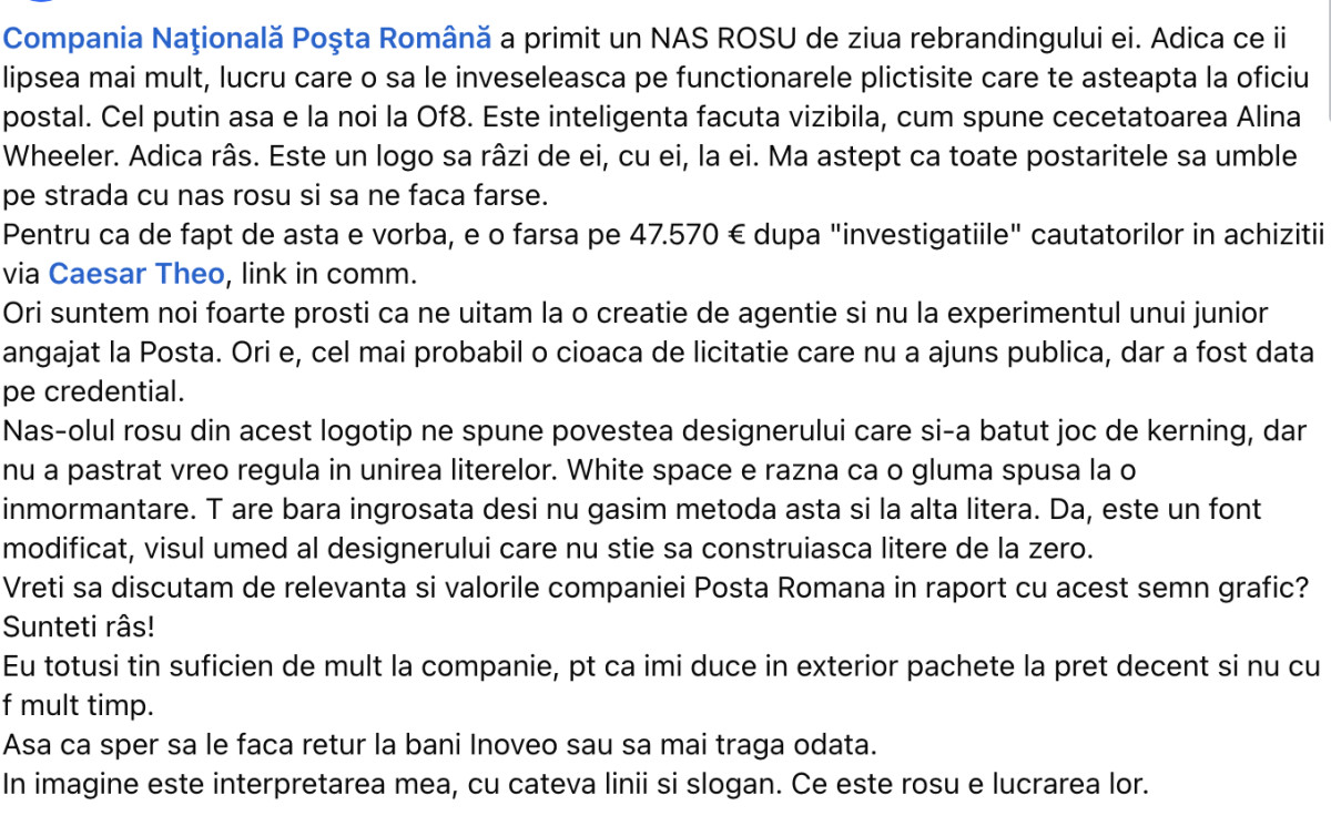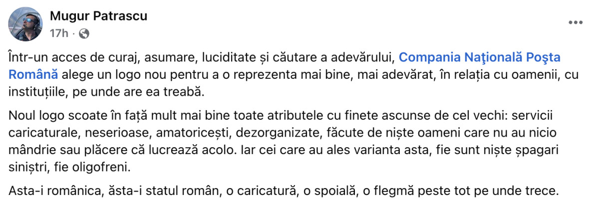 S-ar putea scrie volume impresionante cu poveștile oamenilor care au avut de-a face cu Poșta Română. Unele dintre ele sunt disponibile și pe Facebook - întâmplări în care se îmbină umorul cu suspansul, neîncrederea și fascinația. Dar cine ar fi crezut că motivul de supărare, dintre cele multe posibile, ar fi logo-ul acestei instituții din România?