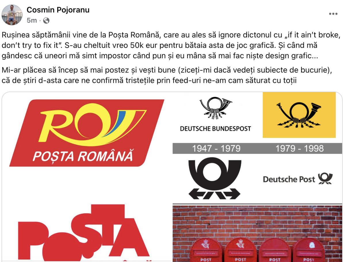 Noul logo al Poștei Române, apărut pe site-ul OSIM, a ajuns pe Reddit și apoi pe Facebook și în presa mainstream, acompaniat de comentarii, critici, nemulțumiri, vorbe de toate felurile. Ca orice contract de branding cu statul și, de altfel, ca orice rebranding sau brand nou care are legătură cu moștenirea emoțională colectivă, identitatea refreshuită a Poștei Române a stârnit o previzibilă nemulțumire publică.