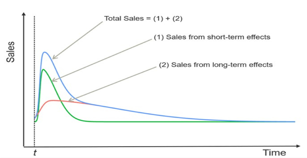Modelele MMM clasice se concentrează aproape exclusiv pe uplift-ul imediat în vânzări generat de investițiile media. Ele presupun, de obicei, că, odată ce reclamele încetează, vânzările revin rapid la nivelul de bază. Această presupunere este fundamental greșită: în practică, brandurile cu notorietate își mențin adesea momentumul și continuă să genereze vânzări chiar și după încheierea campaniilor, datorită efectelor reziduale ale brand-equityului construit în timp.