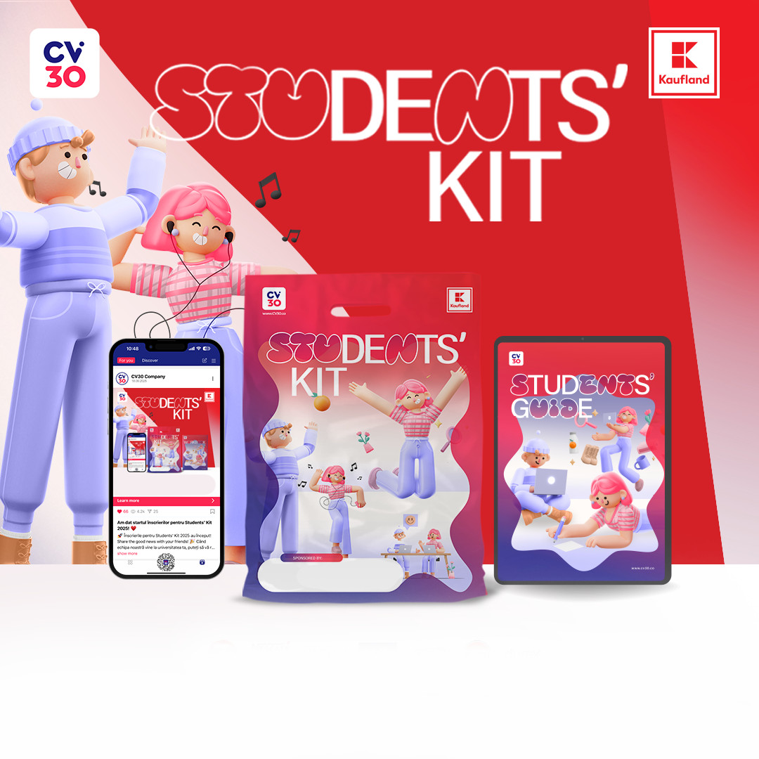 Aplicația CV30 este inovația prin care ducem Students’ Kit la următorul nivel. Creată special pentru a conecta tinerii cu branduri și angajatori într-un mod relevant și accesibil, aplicația integrează experiența Students’ Kit atât offline, cât și online. Prin intermediul ei, studenții pot accesa rapid resursele din eBook-ul Students’ Guide, pot descoperi oportunități de carieră, evenimente, dar și oferte exclusive din partea brandurilor partenere. Astfel, CV30 transformă Students’ Kit într-o platformă digitală interactivă, care susține studenții pe tot parcursul anului universitar și creează o punte directă între generația Z și piața muncii.