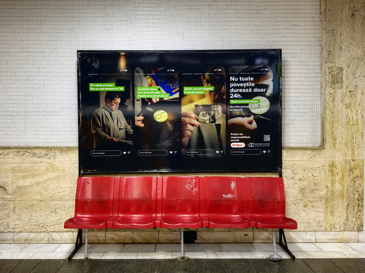 Campania este susținută de un proiect special OOH, care aduce poveștile seniorilor în calea tinerilor, într-un mod neașteptat. Întâlnind formatul de story pe suport fizic, în viața reală - în stații de metrou, spre exemplu - tinerii descoperă povești care nu durează doar 24 de ore, ca în mediul online, ci povești de viață emoționante ale unor seniori așa cum sunt și cei din viața lor.