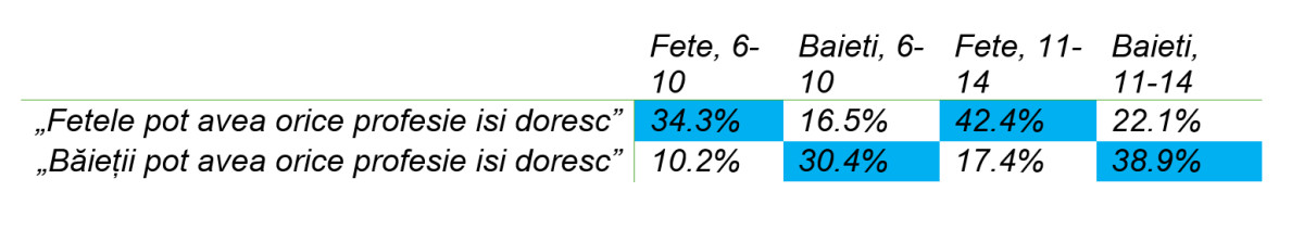 La fel de interesant este și faptul că atunci când vine vorba de raportarea la propriul gen, ei consideră într-o pondere destul de ridicată că pot avea orice profesie își doresc, încrederea copiilor de gimnaziu fiind chiar puțin mai ridicată decât cea a celor din clasele primare.