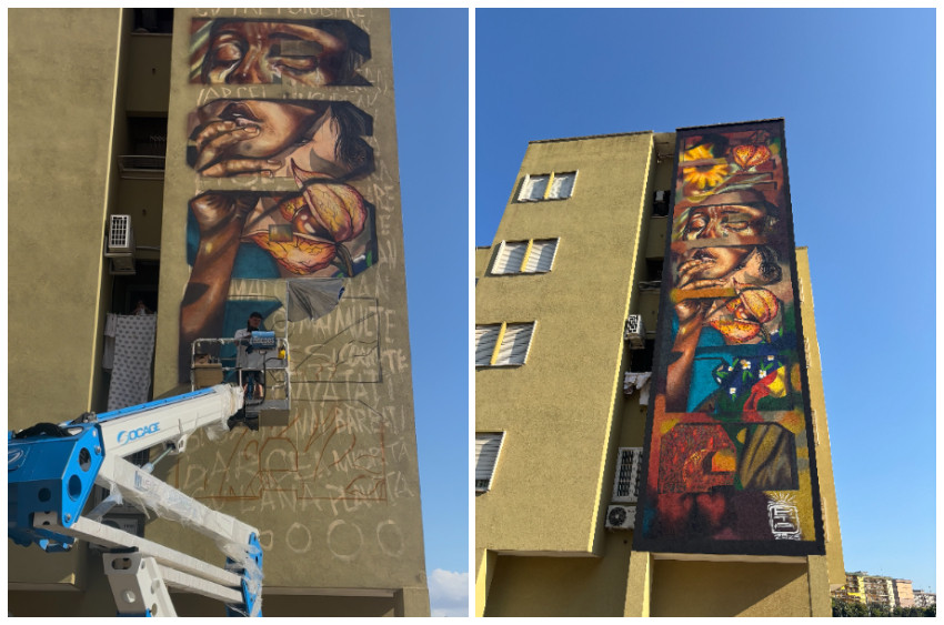 Când am început să lucrez în Lecce, nu am avut timp să percep și să înțeleg totul în detaliu. Cel mai important pentru mine a fost să mă integrez în spațiul urban, să văd paleta clădirilor și să găsesc elemente vizuale care să creeze aluzii subtile culturii locale. De exemplu, masca mea plânge – e o aluzie la clasicism și Sfânta Maria. Nu e direct, dar starea transmisă a fost inspirată de acolo. Ideea principală a fost să fac față spațiului, pentru că dragostea mea pentru arta stradală e mai mare decât orice, și încerc să iau în calcul contextul, societatea, arhitectura și atmosfera.
